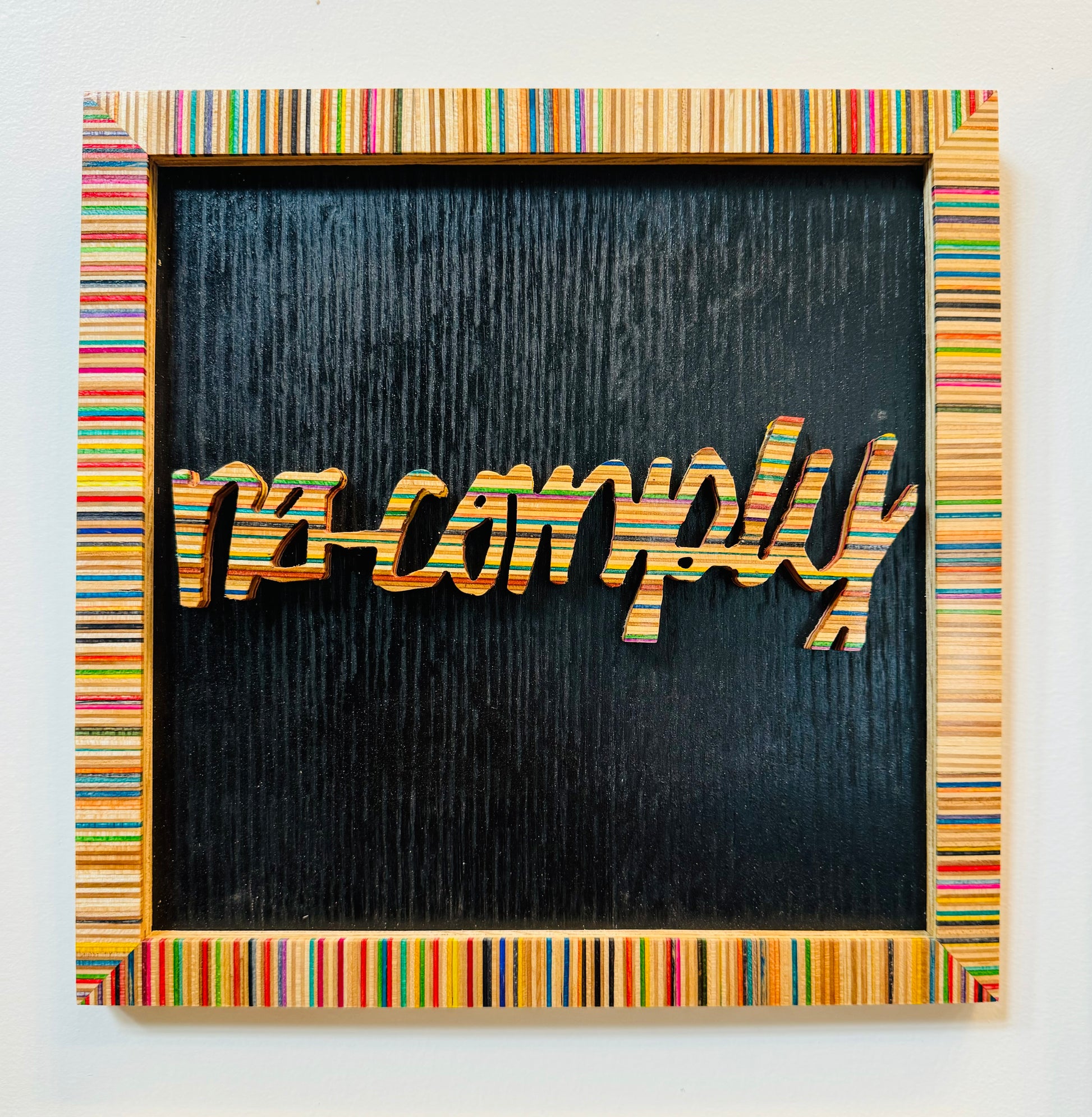 ~12” x 12” wall art handmade in the USA from recycled skateboards. hand signed and individually numbered. This piece was made using skateboards donated by No Comply Skateshop ✨