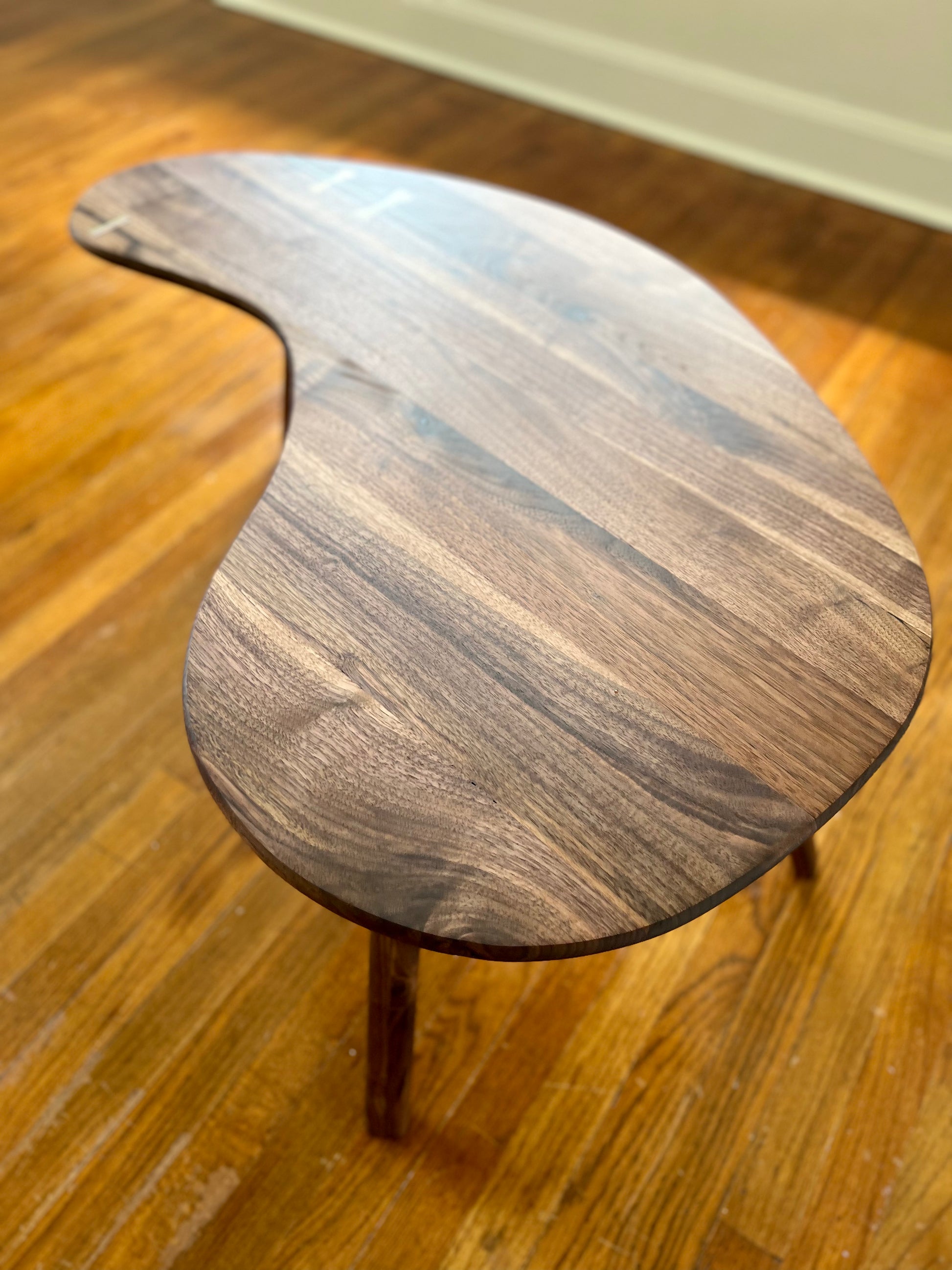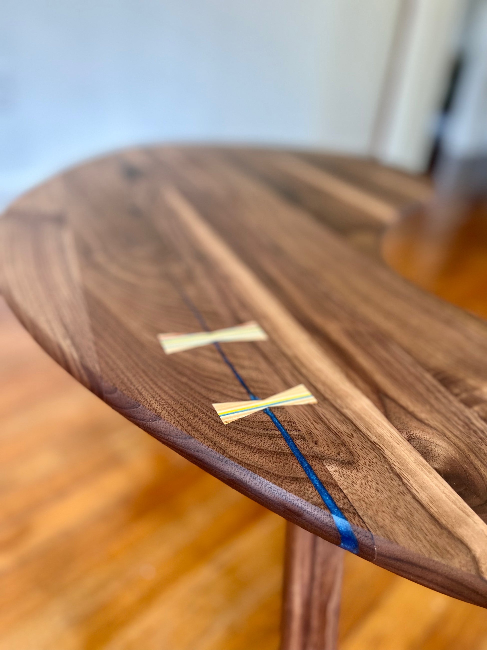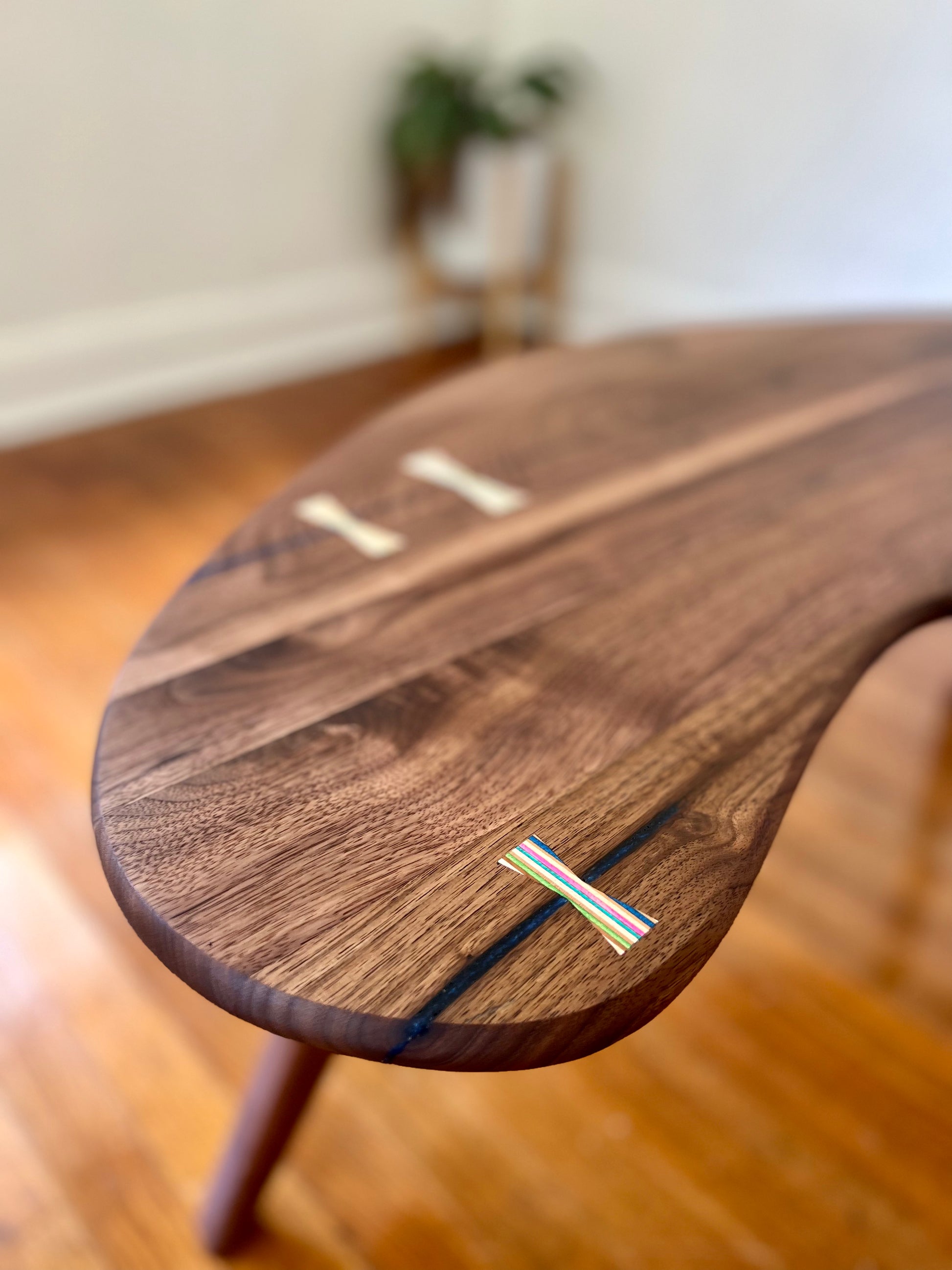 Made from rustic walnut and recycled skateboards, this piece offers soft edges with a warm feel. Perfect to compliment any room with natural lighting. ~33” x 18” x 18”
