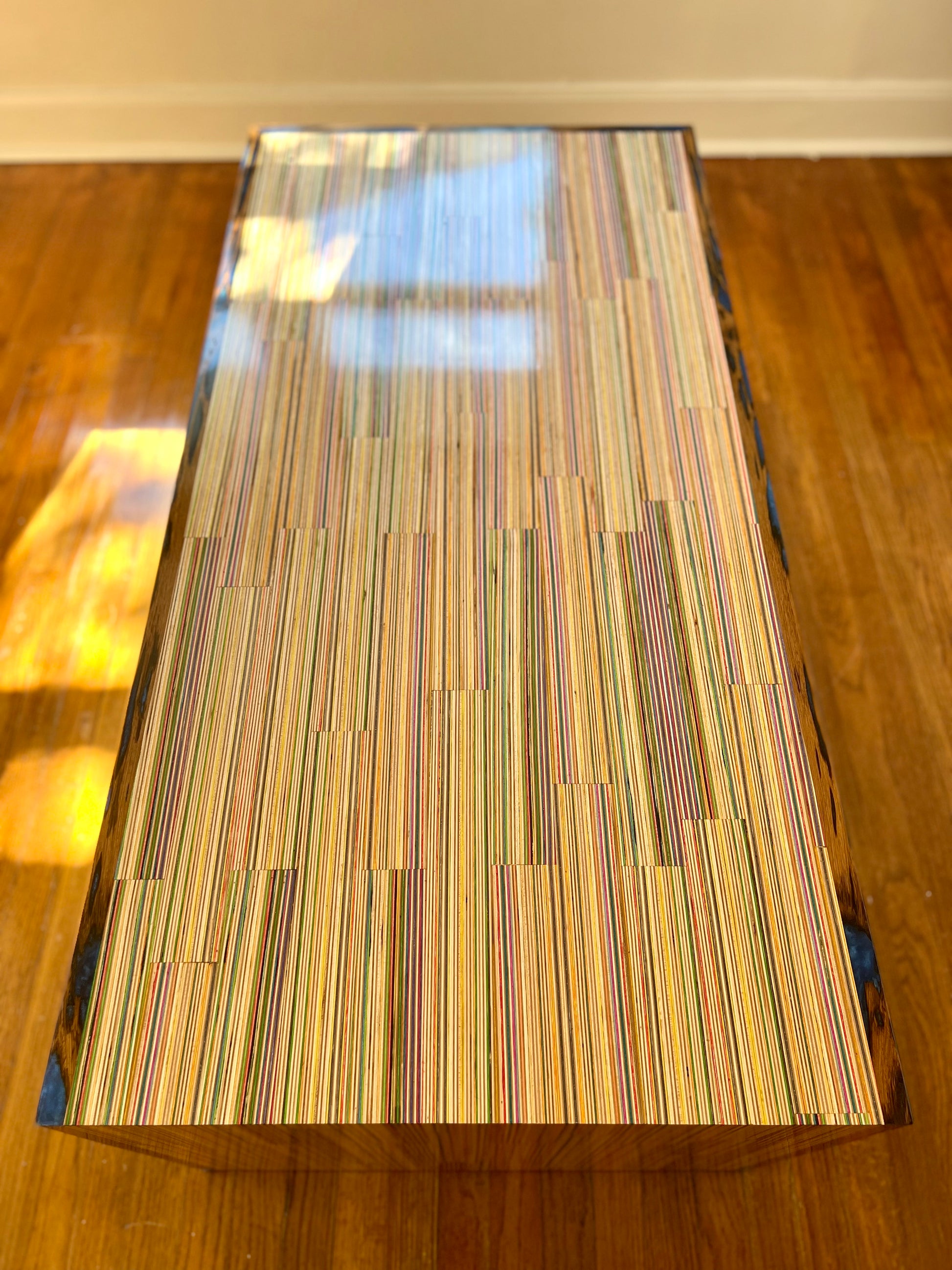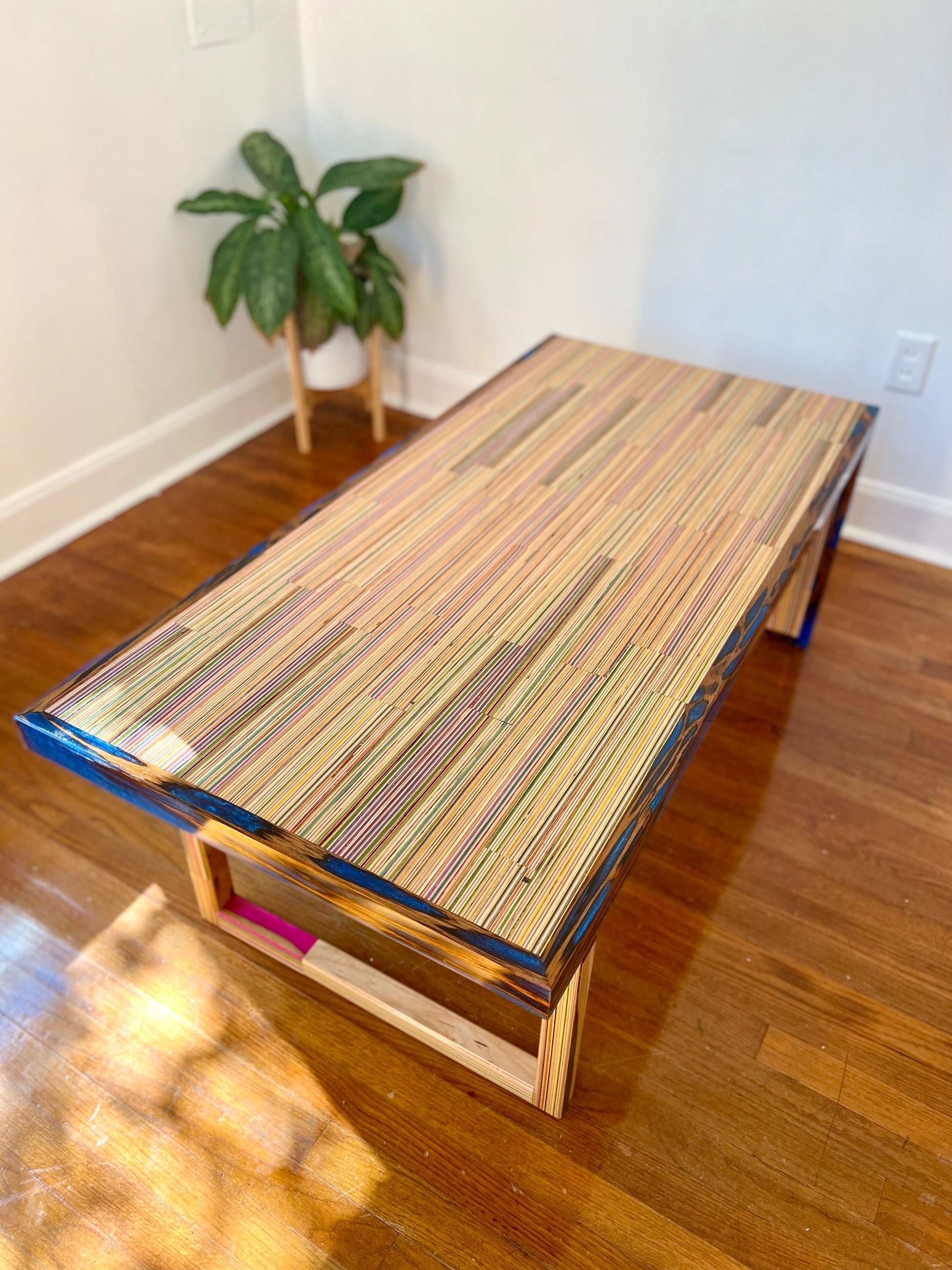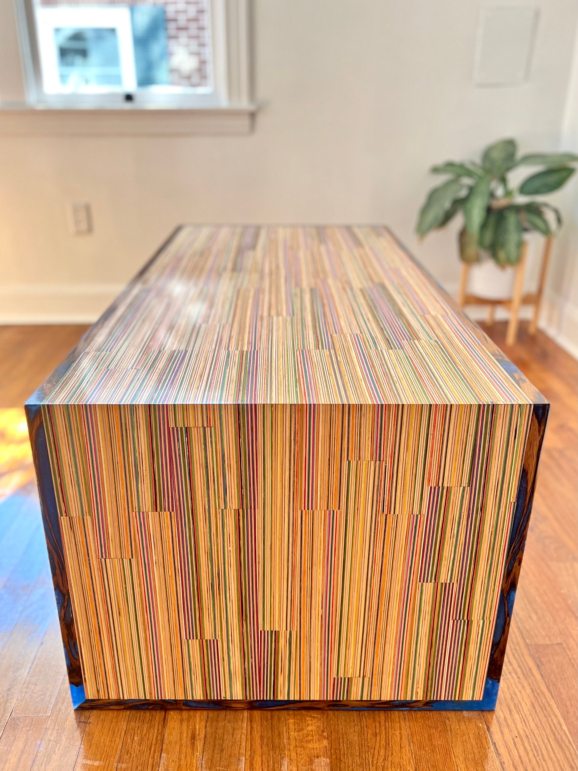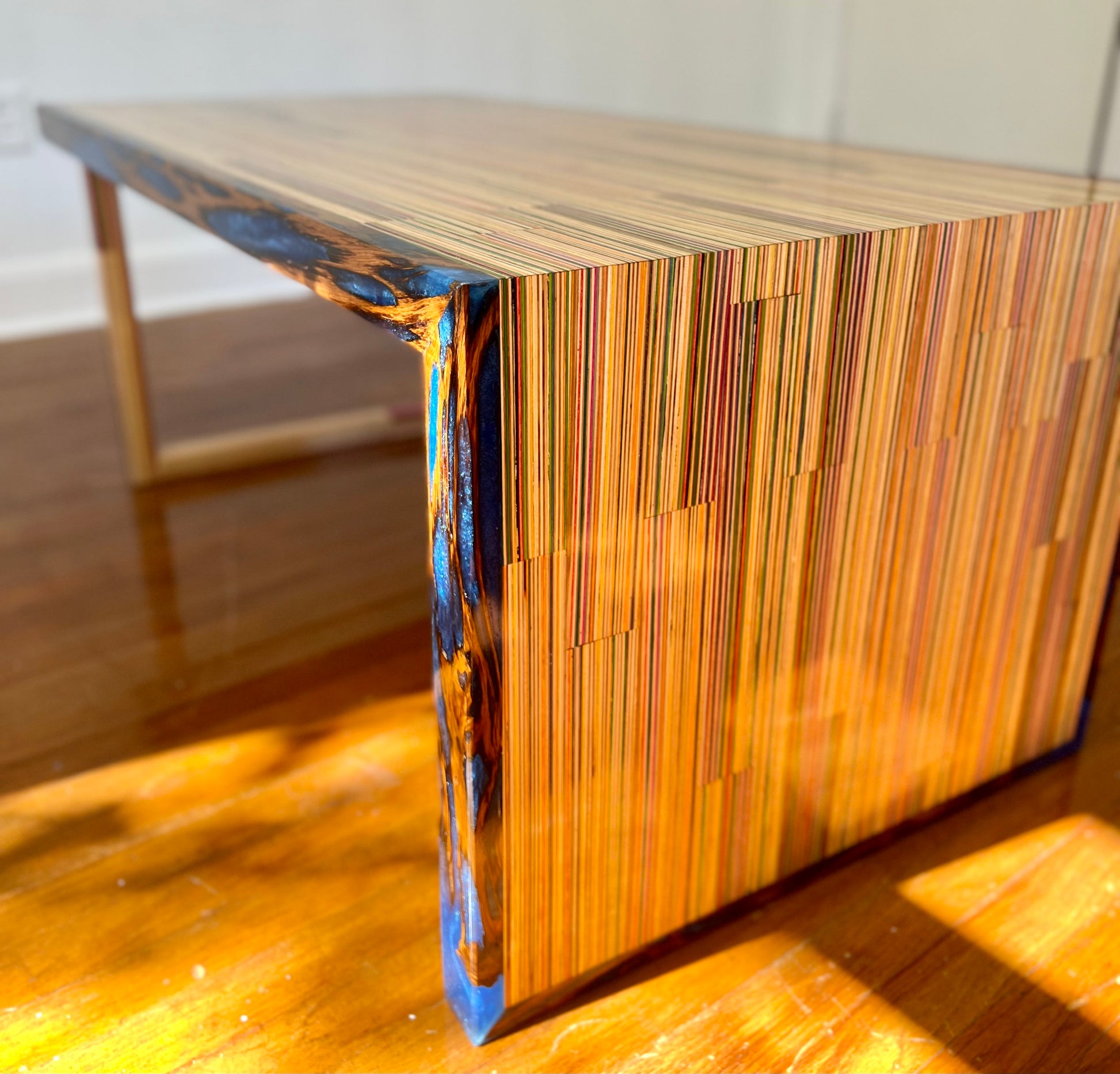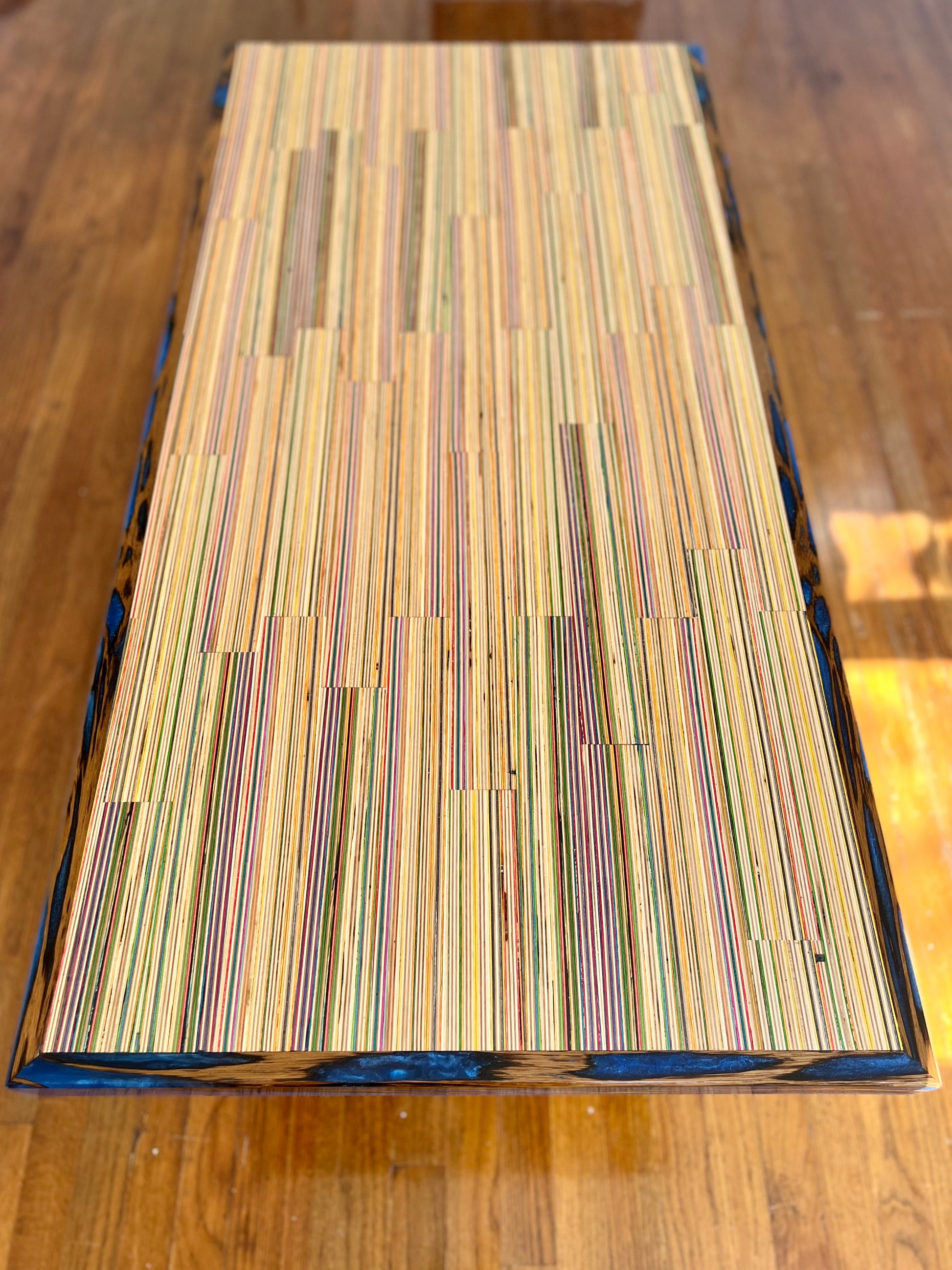 Coffee table made from recycled skateboards, sinker cypress, and epoxy. Sinker cypress occurs whenever the local Louisiana Cypress falls into the swamp and decays underwater over time. The water erodes the grain in a way that removes the softer parts leaving only the hard parts of the grain. Each tree is harvested from the bottom of the swamp and then kiln dried before milling into usable lumber. From there I take it and fill each void with a pigmented epoxy then further mill it to use it to create boarders for my tables and other art pieces. This lovely table consists of about 45 recycled skateboards that were all skated and thrown out as trash from all over the gulf coast. This piece took me roughly 3 months to complete and is one of my favorite creations I’ve ever made. I’m very proud of this one and look forward to seeing it in its new home. ~18”H x 24”W x 49.5”L