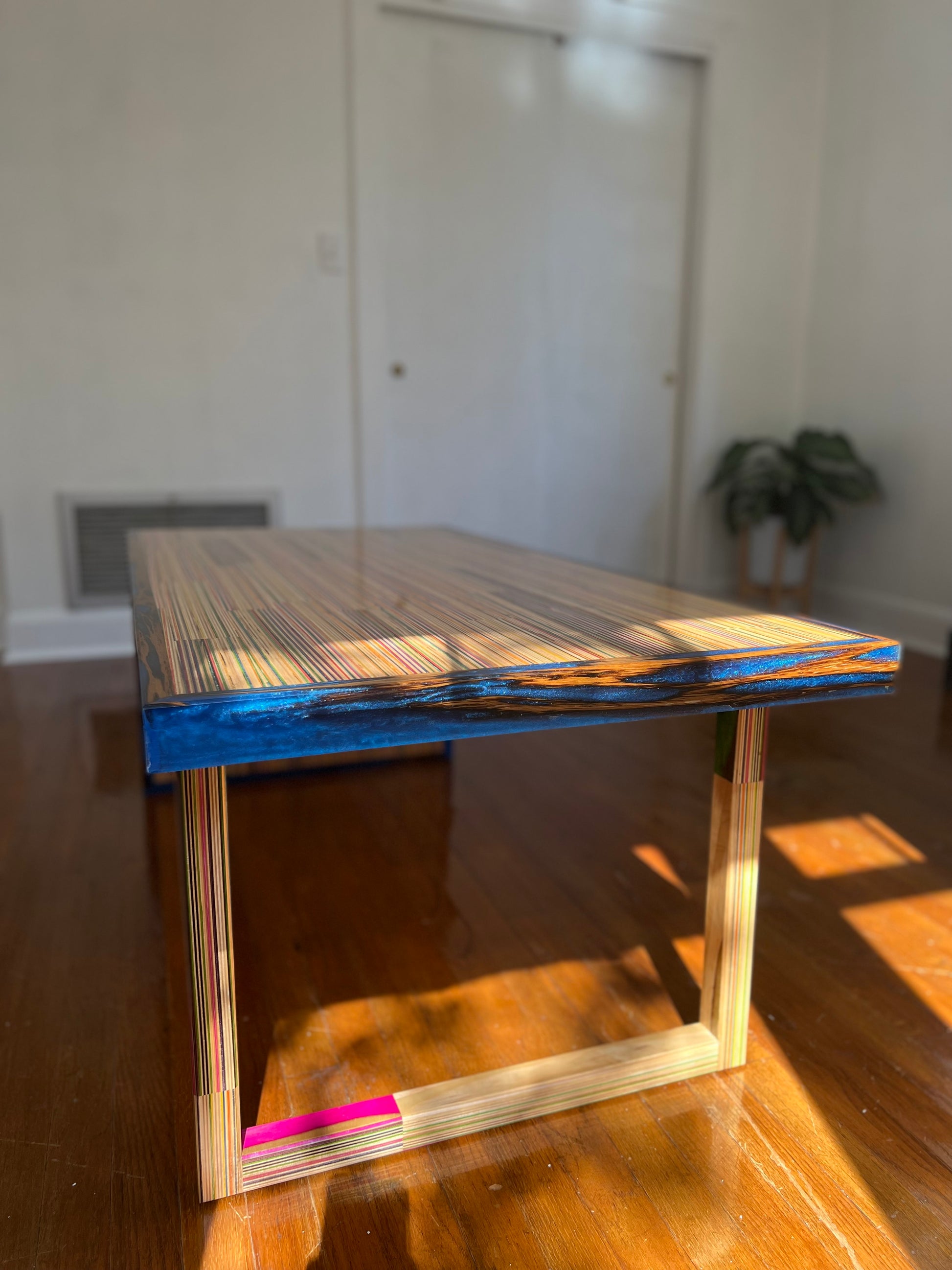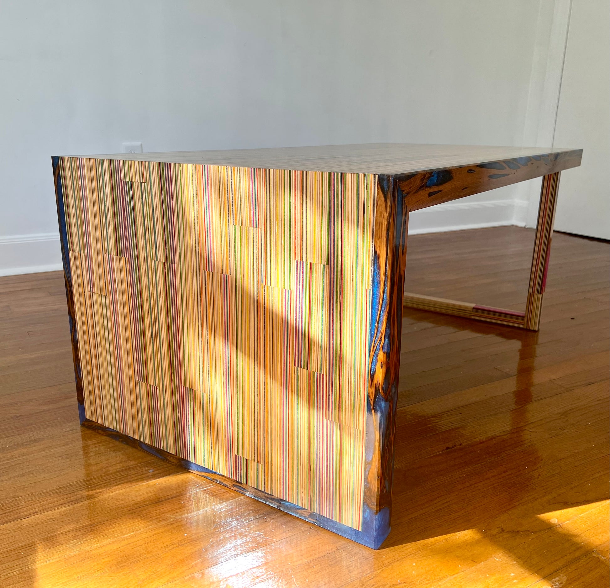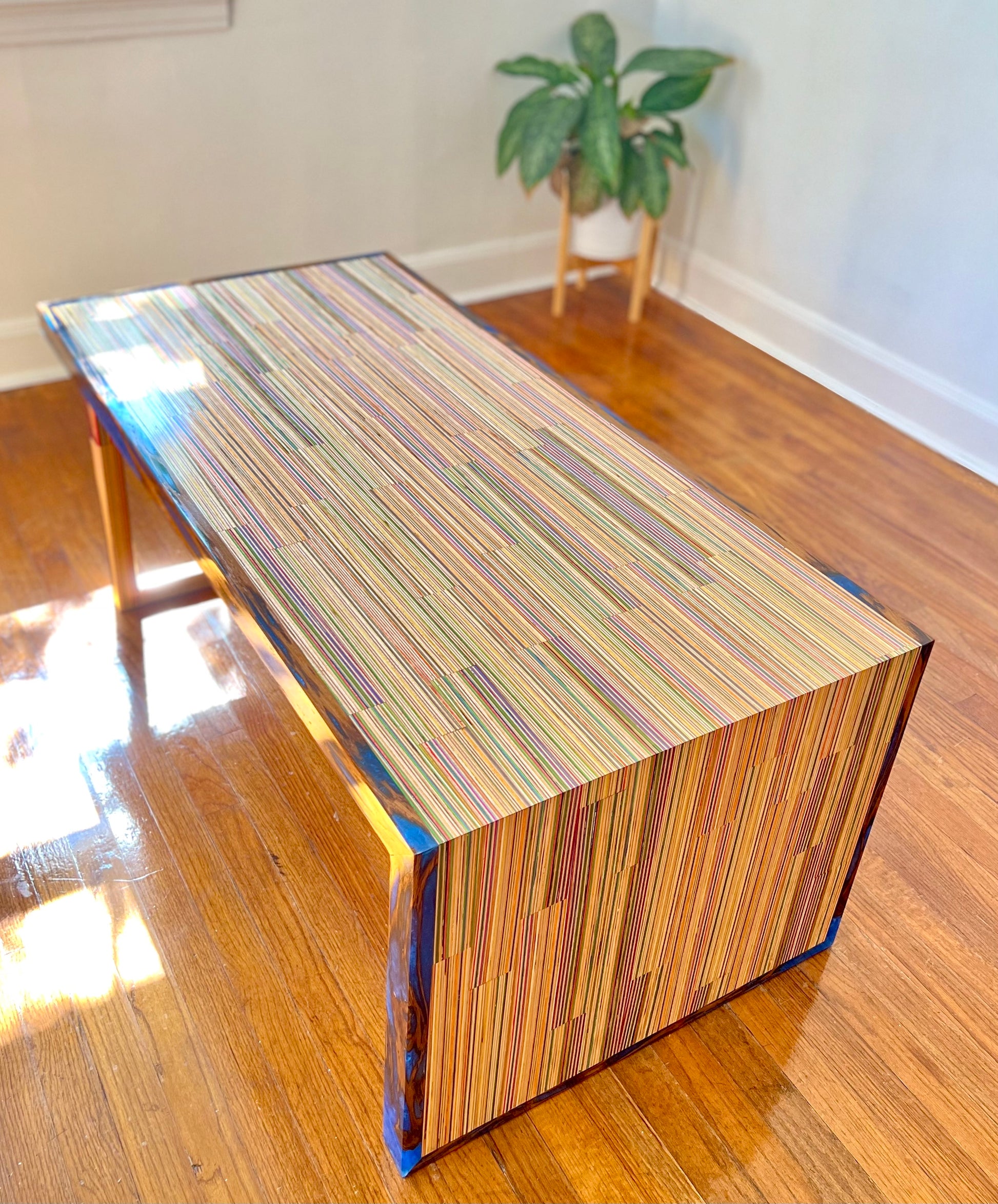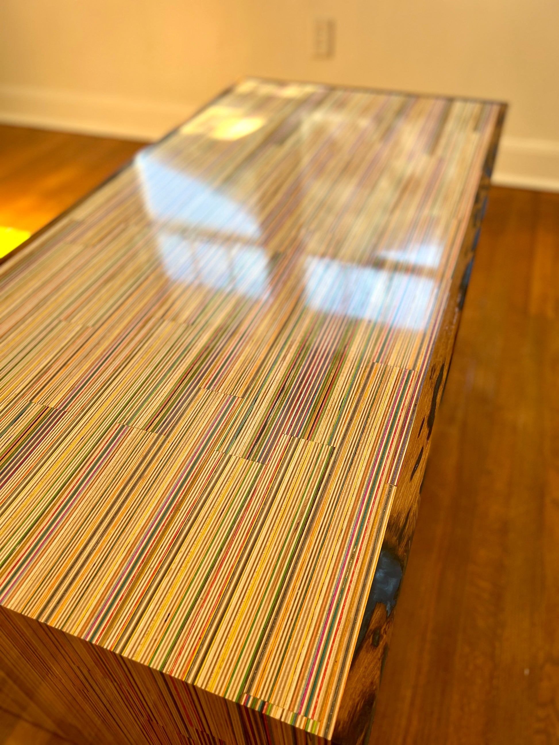 Coffee table made from recycled skateboards, sinker cypress, and epoxy. Sinker cypress occurs whenever the local Louisiana Cypress falls into the swamp and decays underwater over time. The water erodes the grain in a way that removes the softer parts leaving only the hard parts of the grain. Each tree is harvested from the bottom of the swamp and then kiln dried before milling into usable lumber. From there I take it and fill each void with a pigmented epoxy then further mill it to use it to create boarders for my tables and other art pieces. This lovely table consists of about 45 recycled skateboards that were all skated and thrown out as trash from all over the gulf coast. This piece took me roughly 3 months to complete and is one of my favorite creations I’ve ever made. I’m very proud of this one and look forward to seeing it in its new home. ~18”H x 24”W x 49.5”L