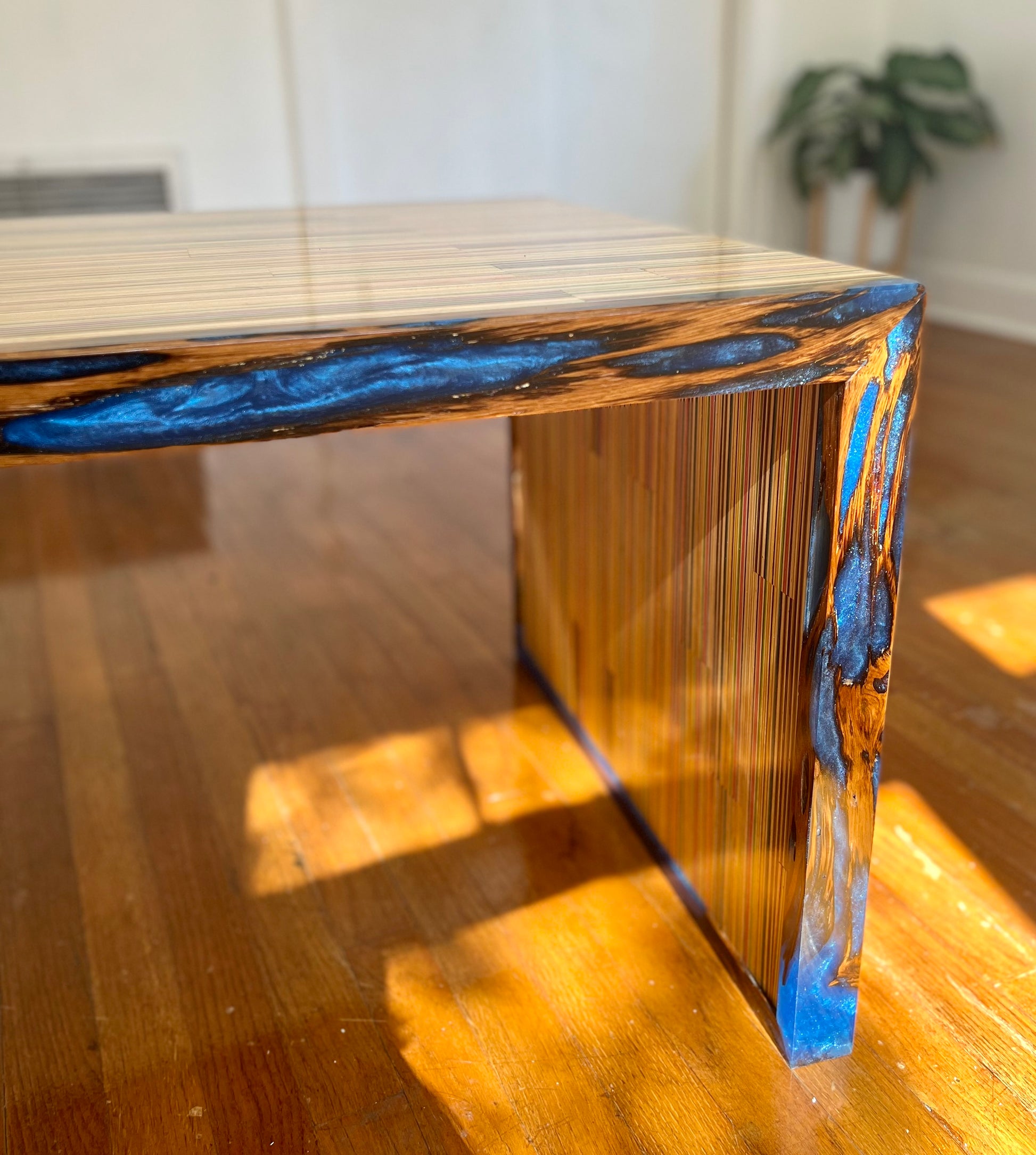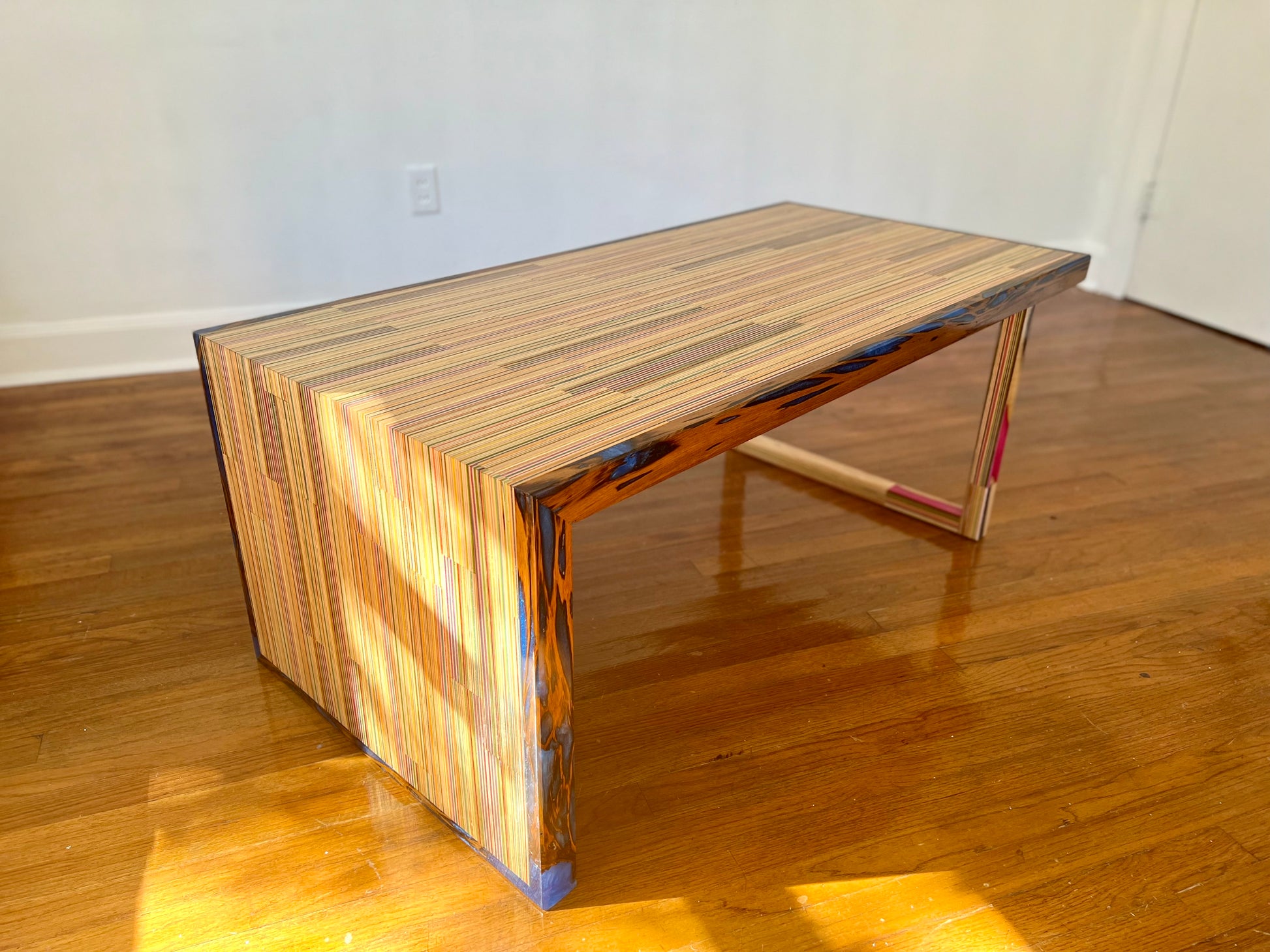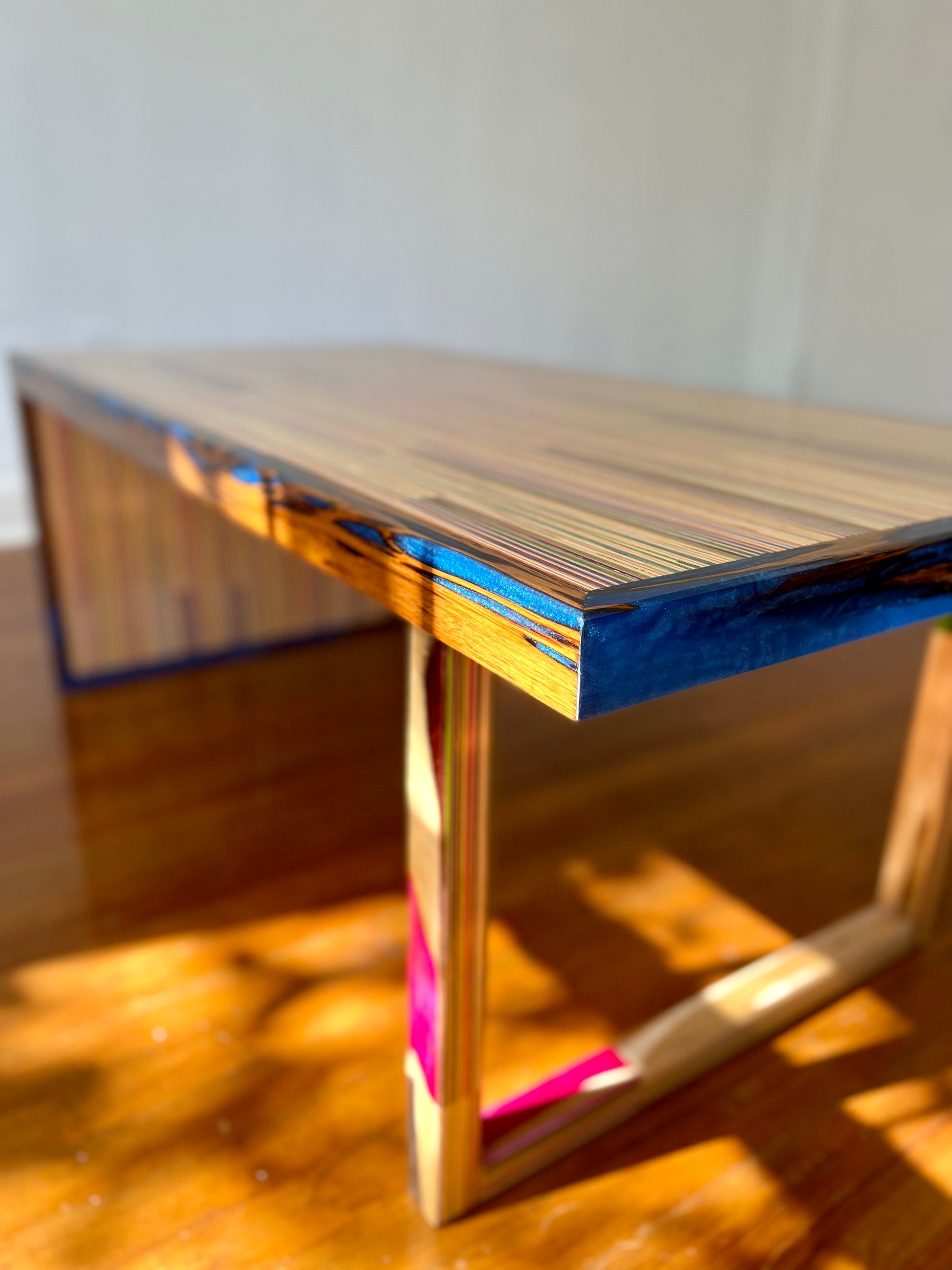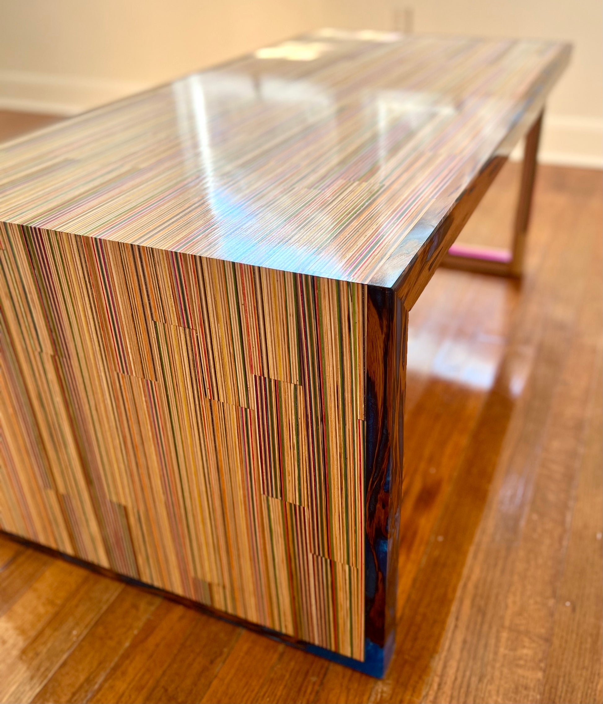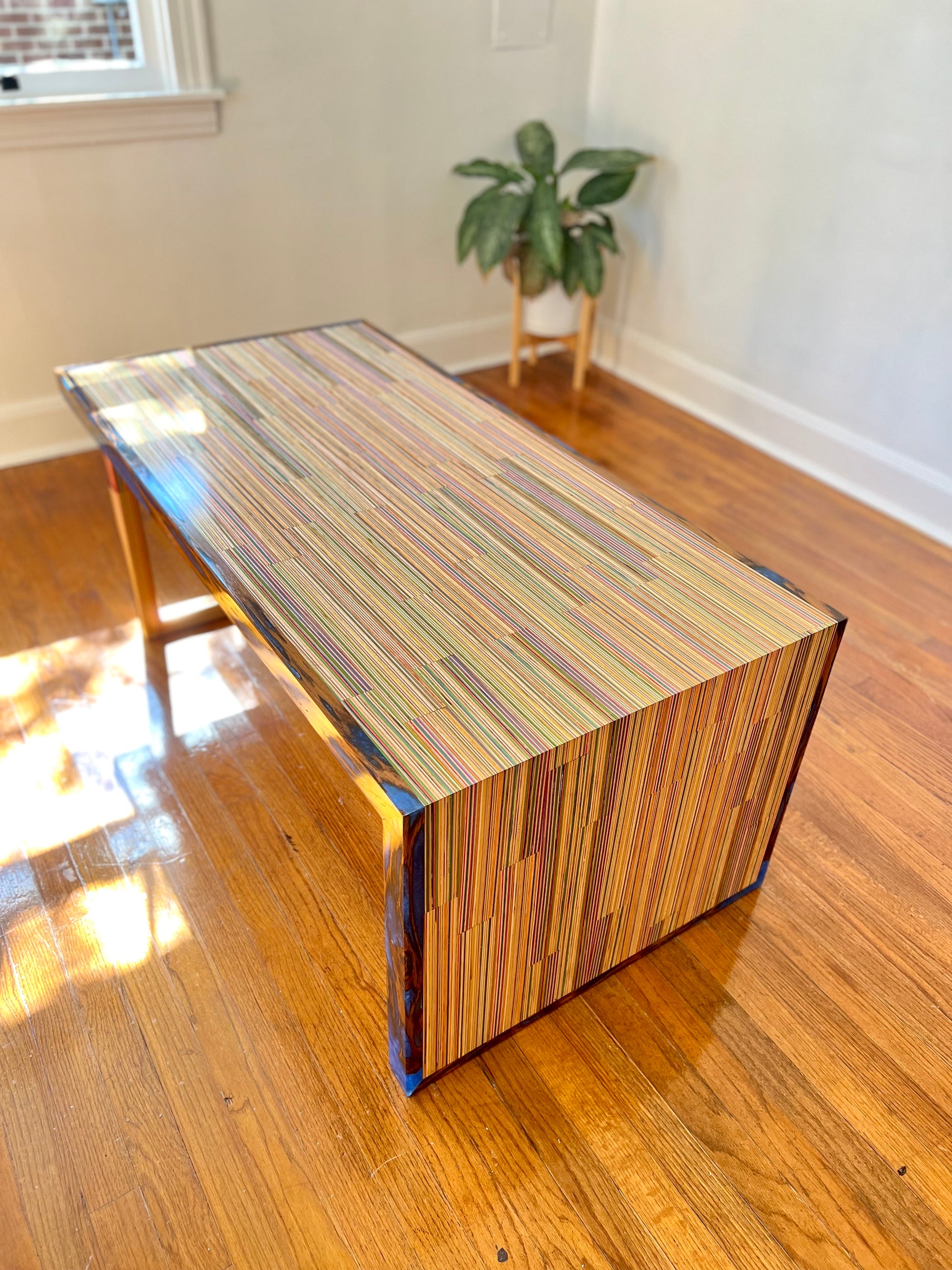 Coffee table made from recycled skateboards, sinker cypress, and epoxy. Sinker cypress occurs whenever the local Louisiana Cypress falls into the swamp and decays underwater over time. The water erodes the grain in a way that removes the softer parts leaving only the hard parts of the grain. Each tree is harvested from the bottom of the swamp and then kiln dried before milling into usable lumber. From there I take it and fill each void with a pigmented epoxy then further mill it to use it to create boarders for my tables and other art pieces. This lovely table consists of about 45 recycled skateboards that were all skated and thrown out as trash from all over the gulf coast. This piece took me roughly 3 months to complete and is one of my favorite creations I’ve ever made. I’m very proud of this one and look forward to seeing it in its new home. ~18”H x 24”W x 49.5”L