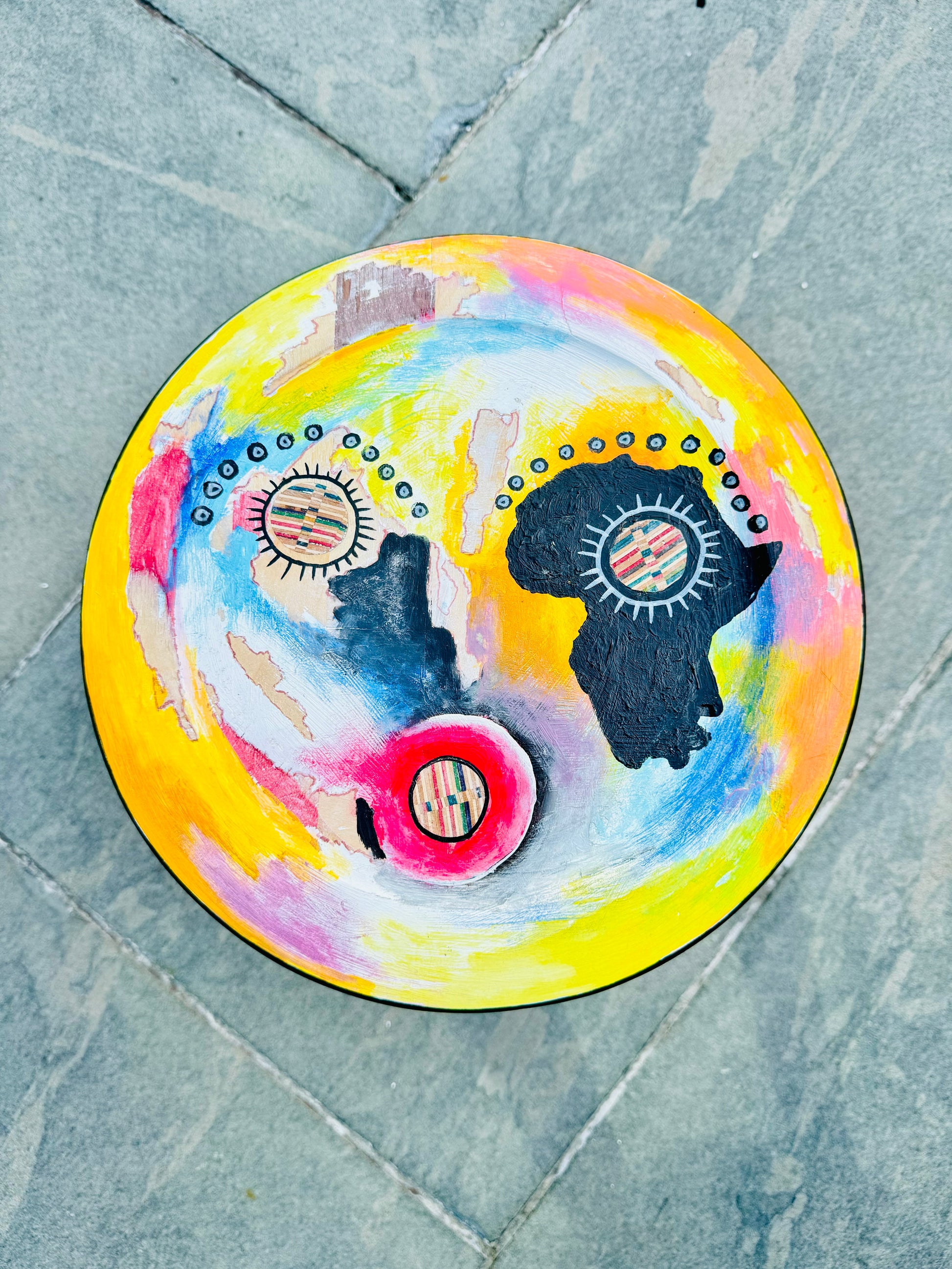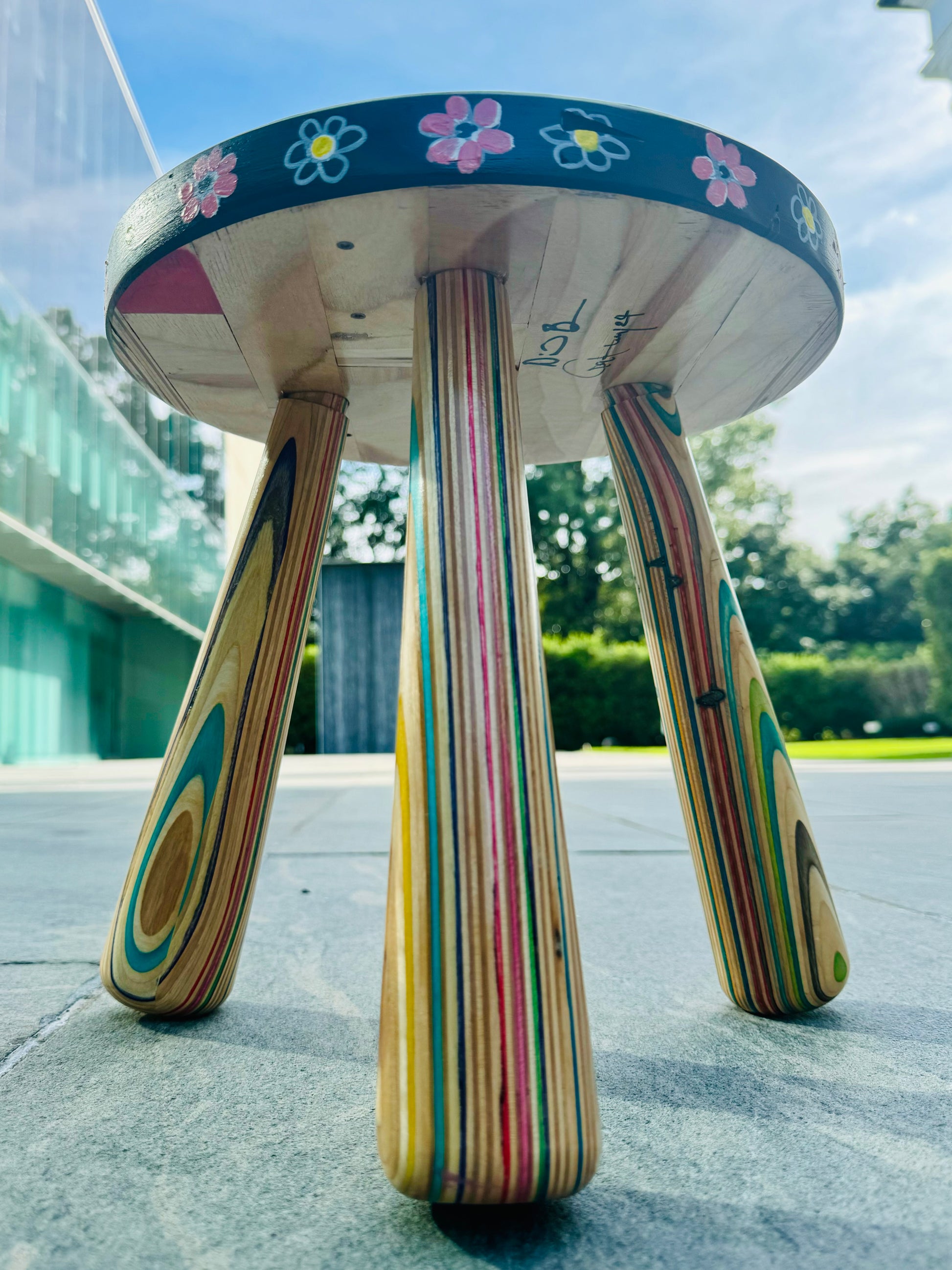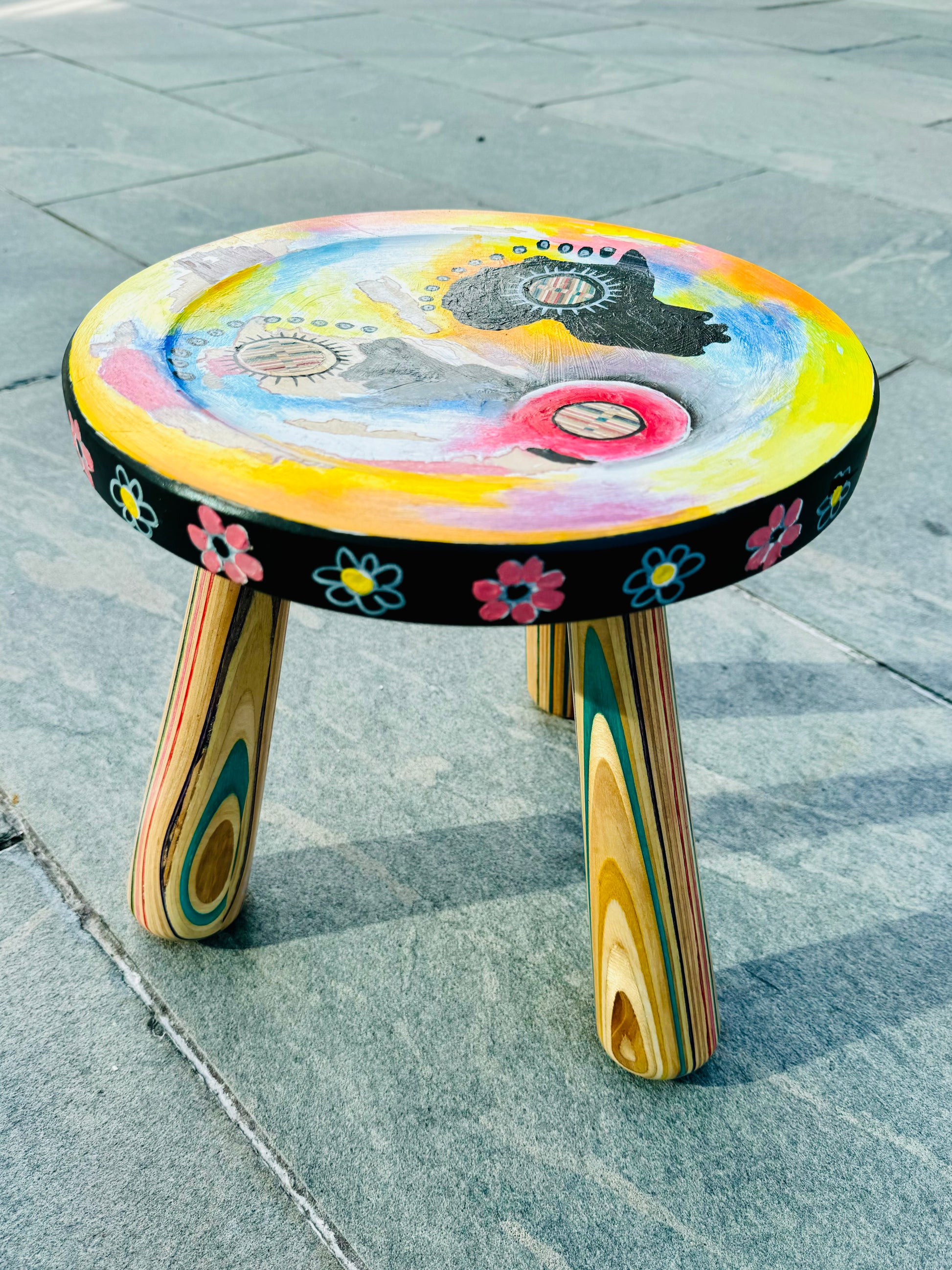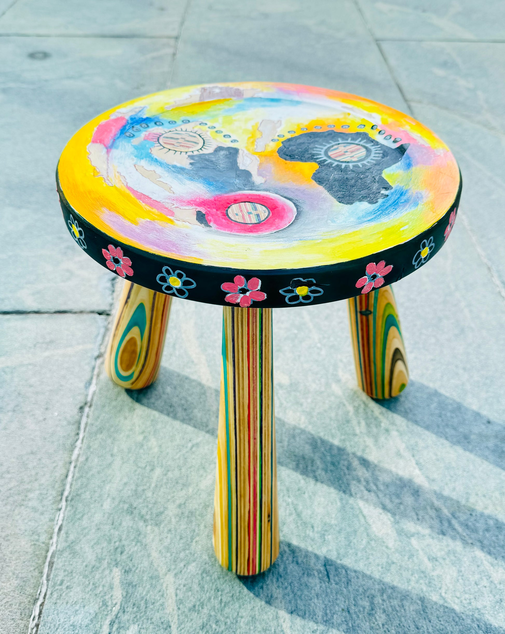 Small stool handmade from recycled skateboards and hand painted on by Gakwaya Gisa. ~11” x 17” ✨