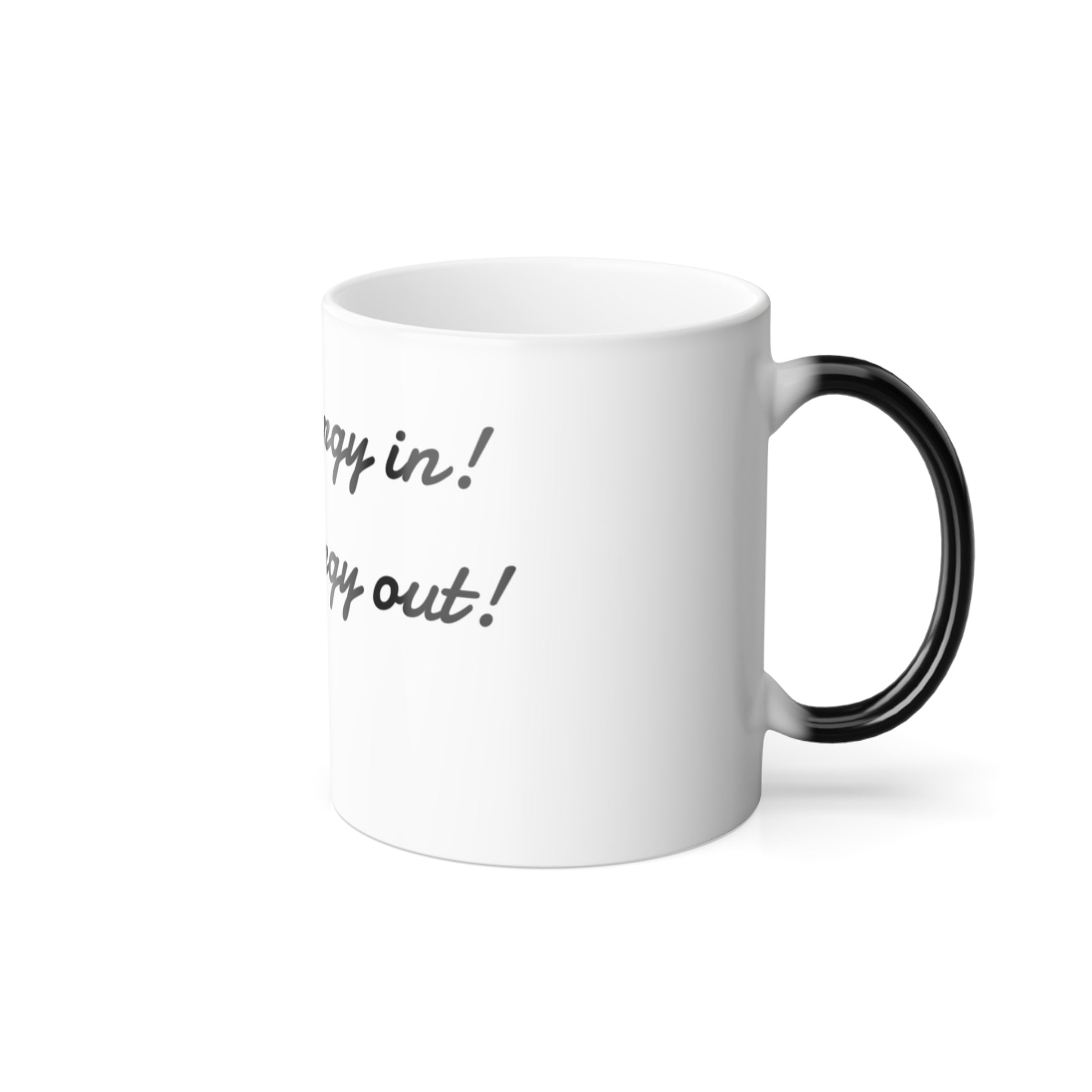We believe if you put good energy in you get good energy out for all of our products! Start your day off right with good energy in your morning cup of coffee! This one changes color and will be the gift that keeps on giving! The heat-reactive surface reveals your custom designs once the mug gets warm. The ceramic cup will go back to its original black outside and white inside when it cools down. The C-shaped handle helps keep a sturdy grip. It comes in one size – 11oz (0.33l) – plenty for that big morning cup of coffee.