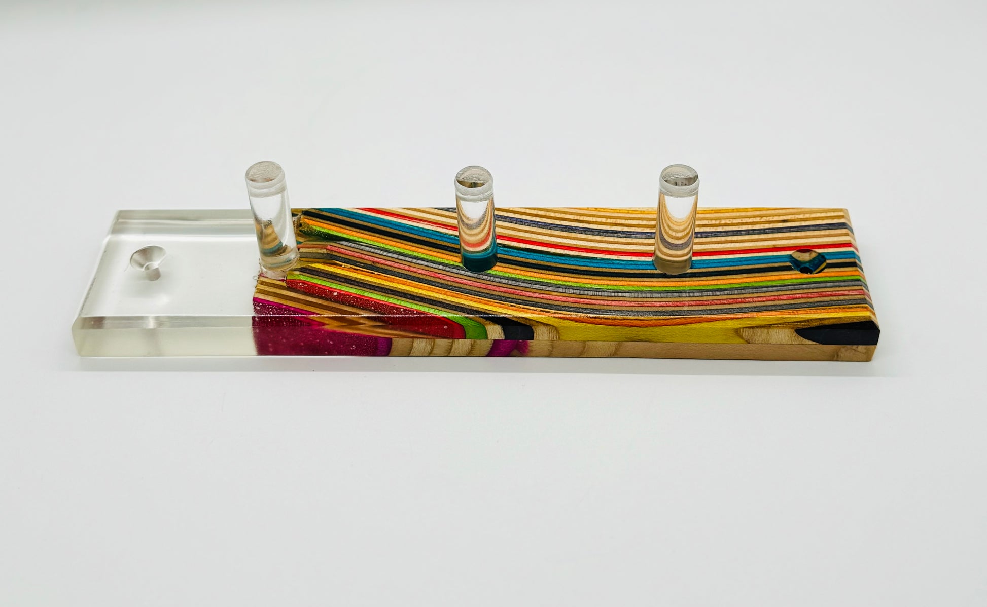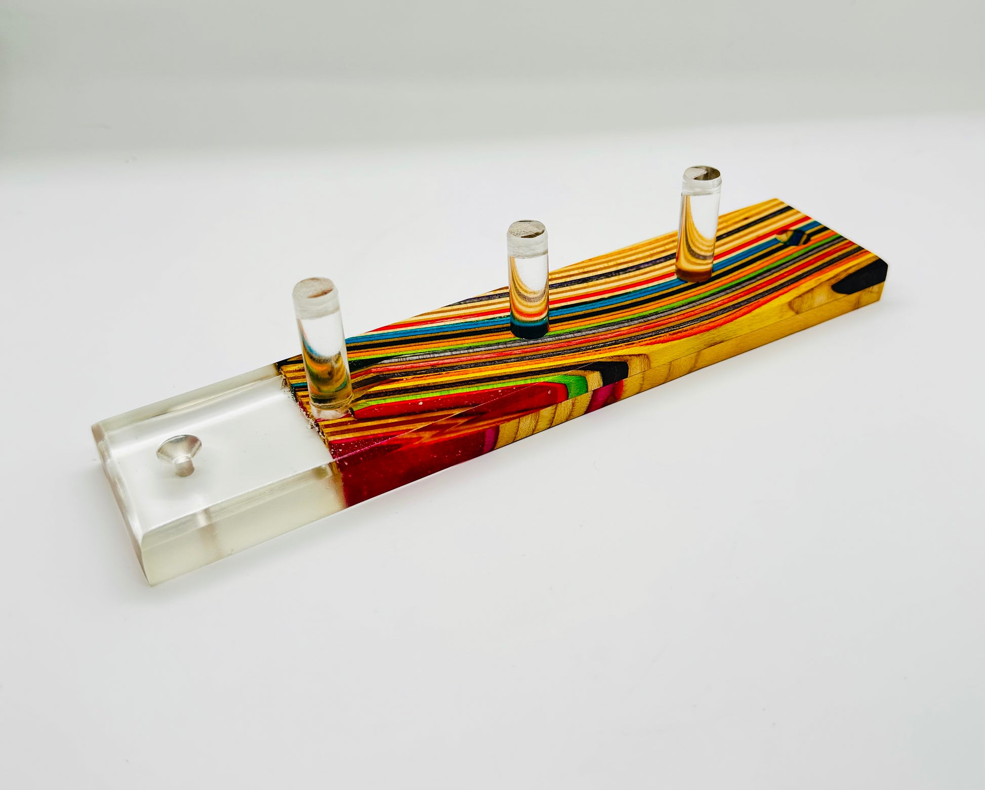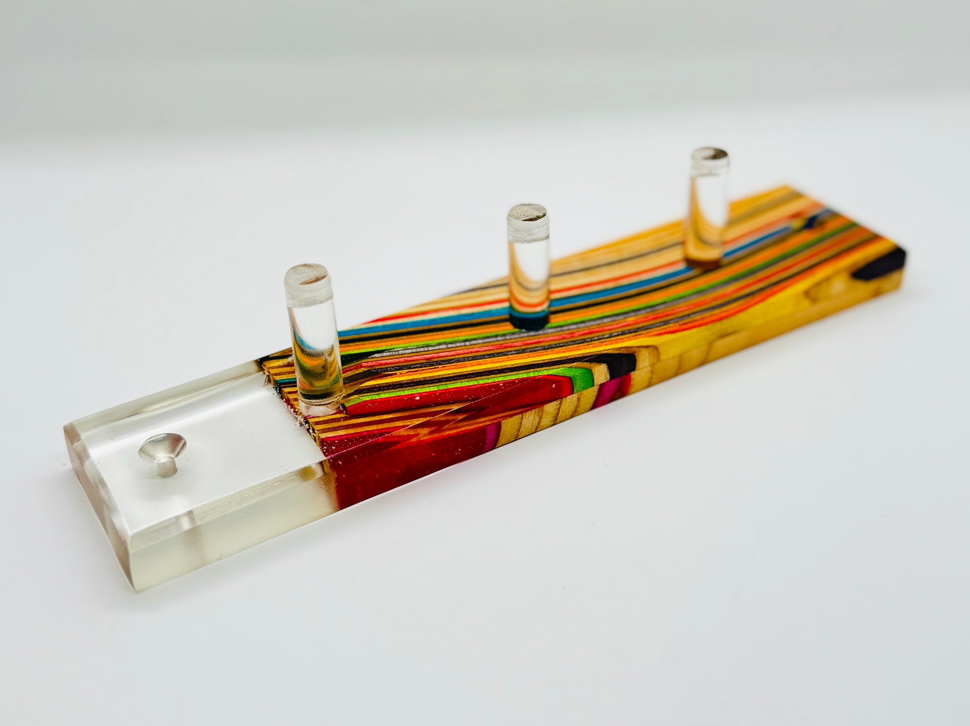 Key ring hook made from recycled skateboards, epoxy, and acrylic dowels ✨