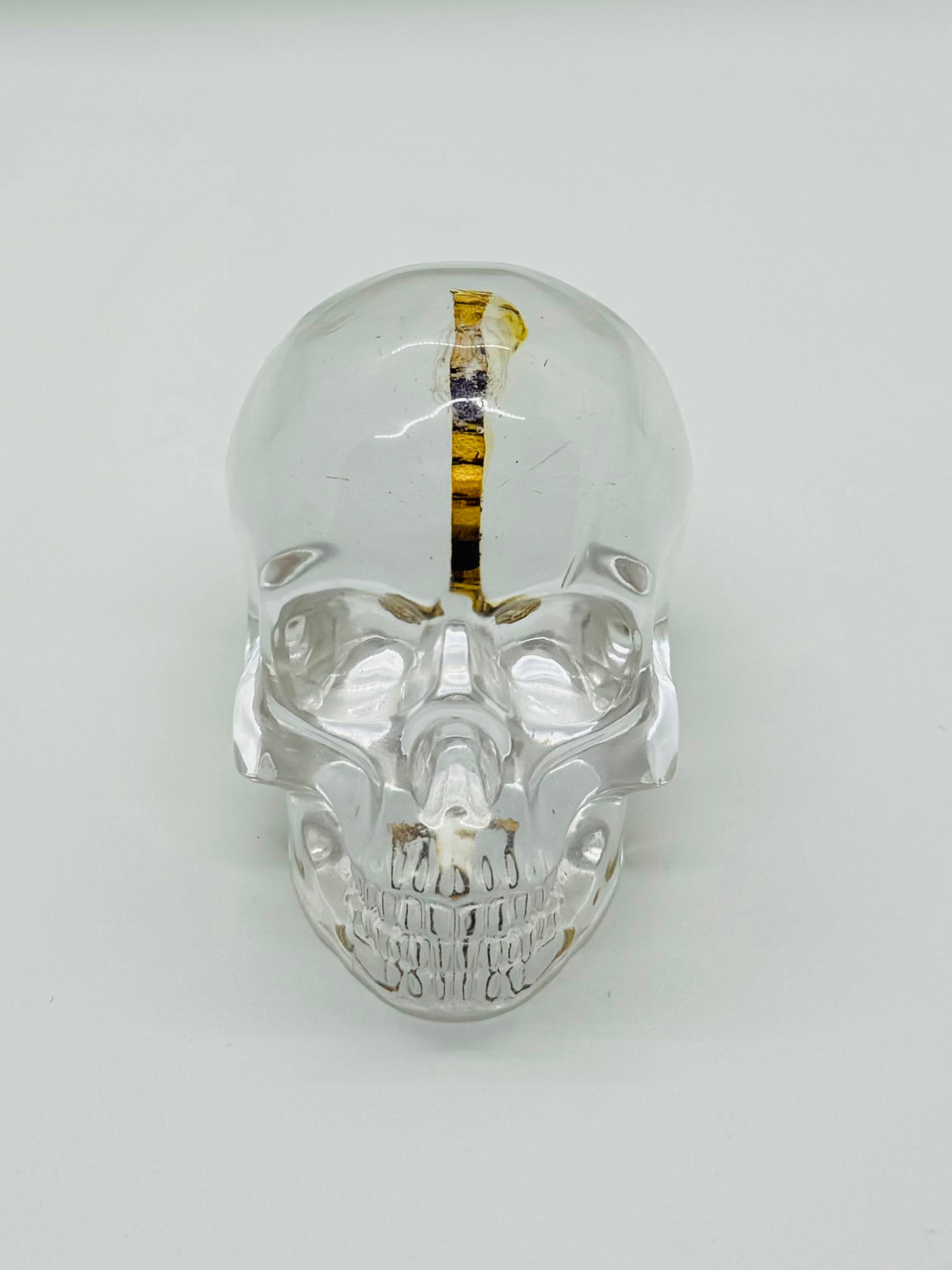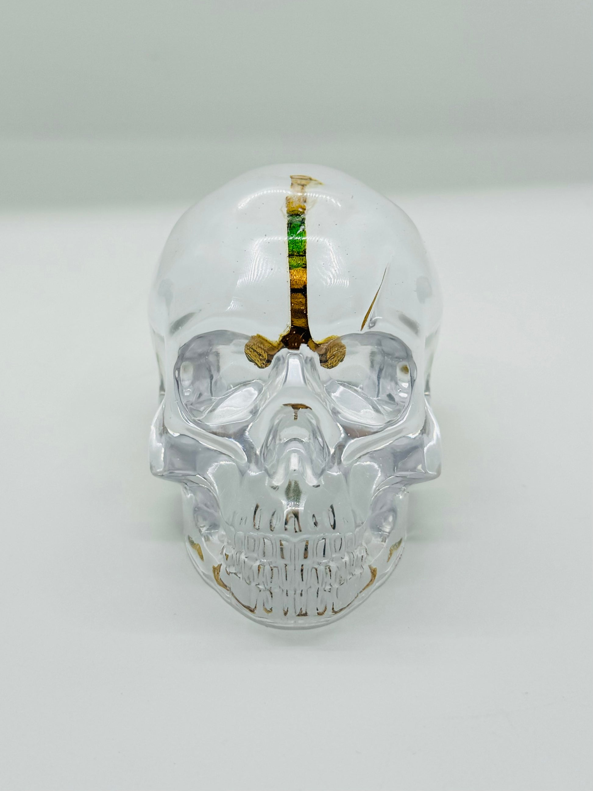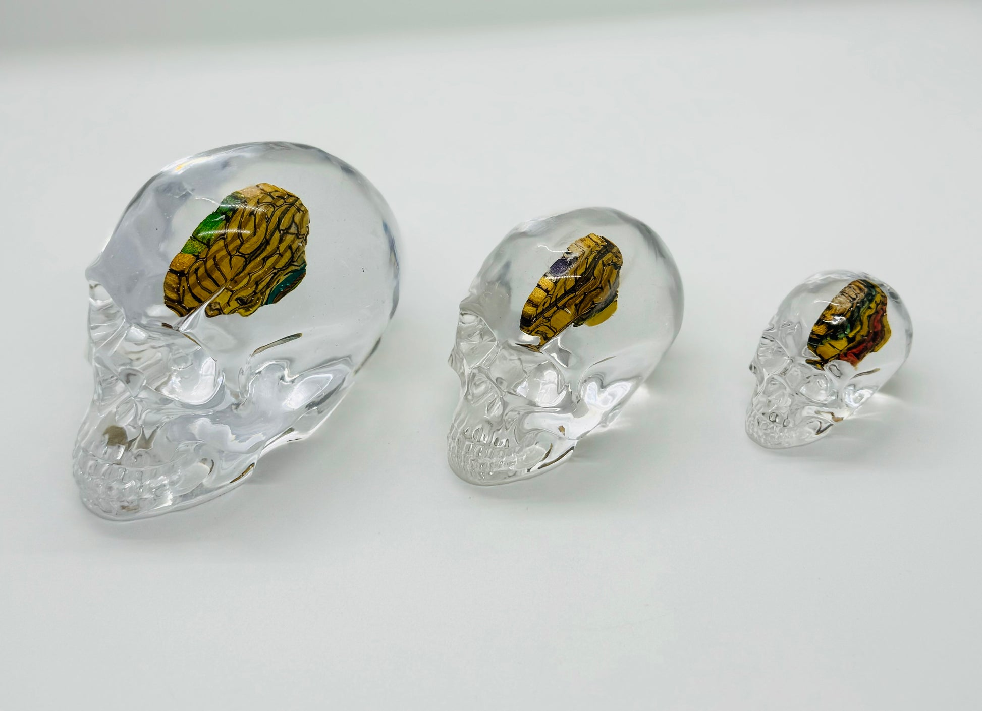 Skull made from epoxy with a recycled skateboard brain casted in the middle. Sizes small, medium, and large.