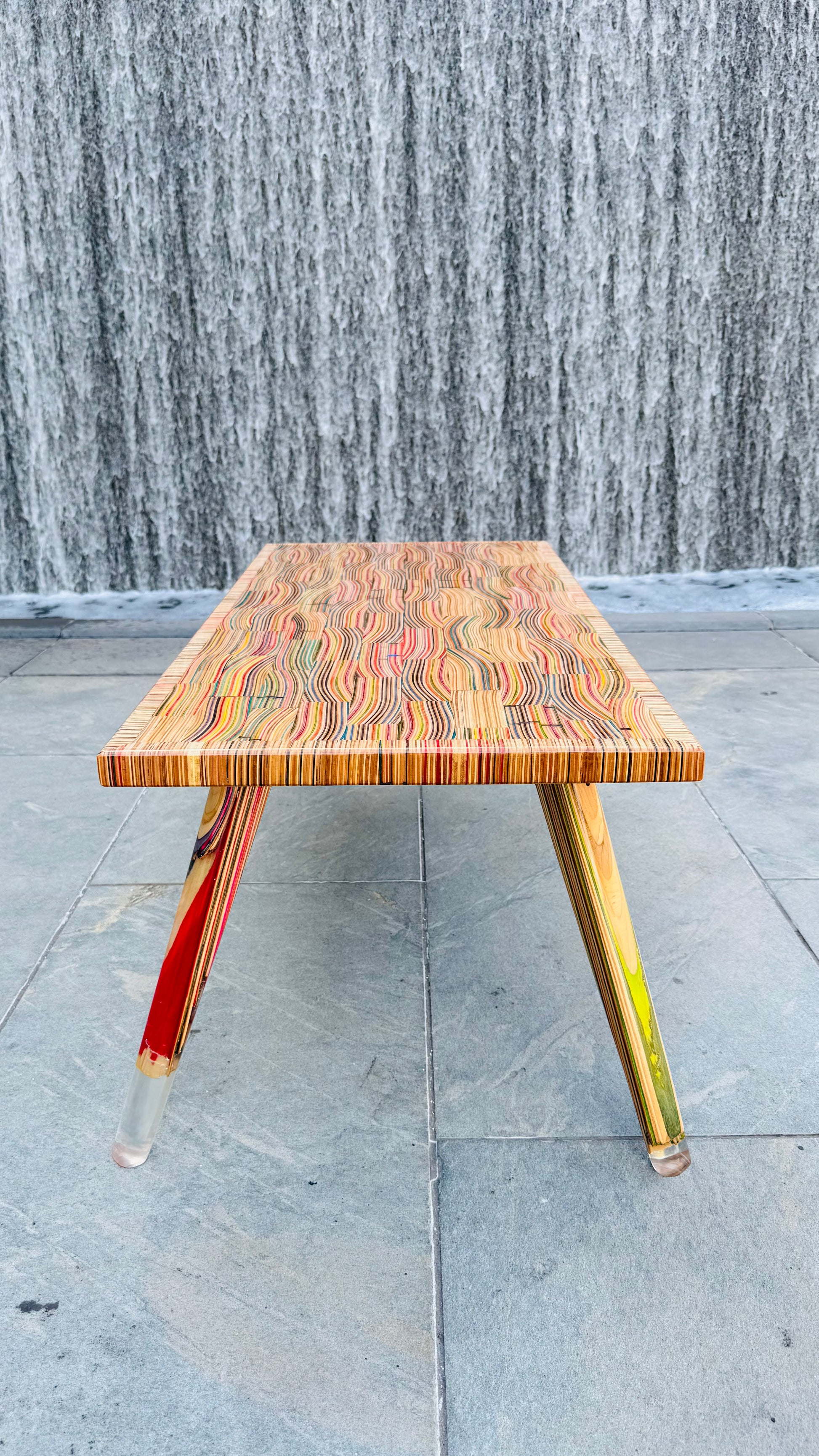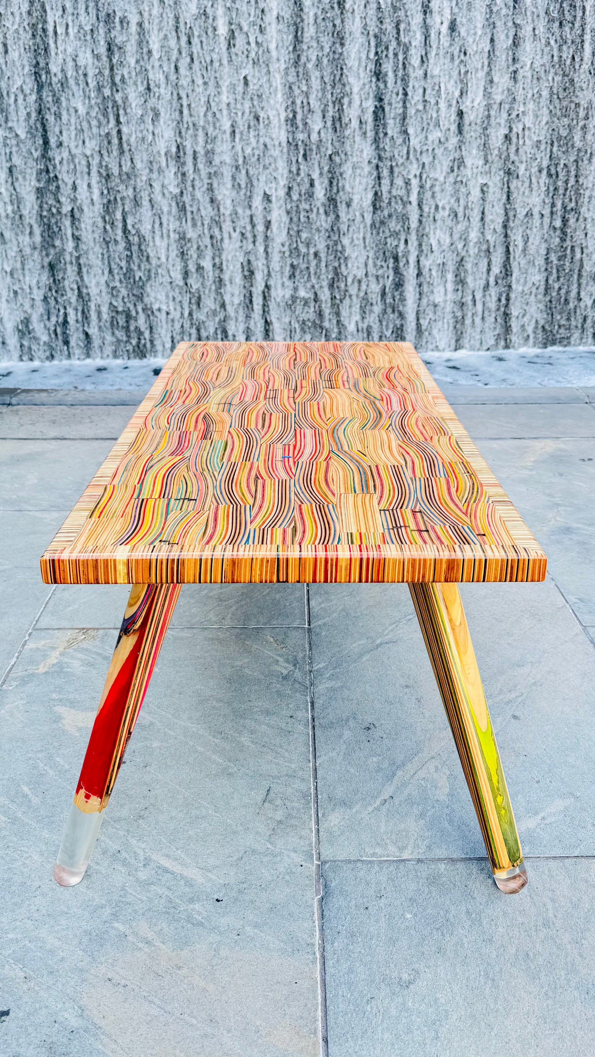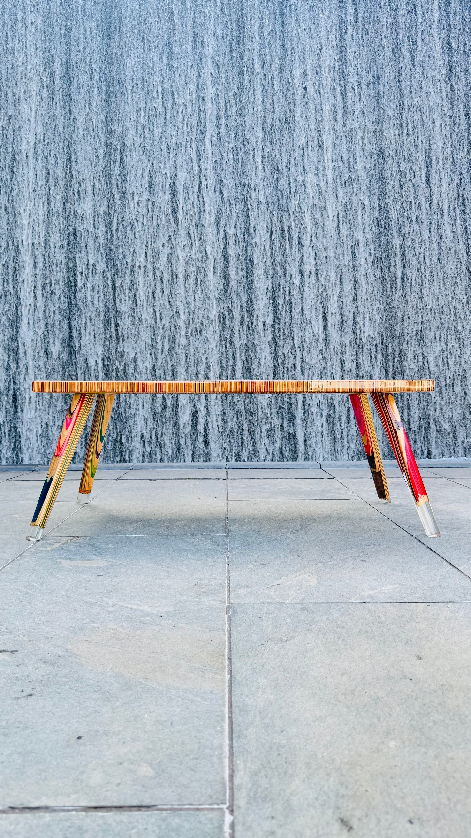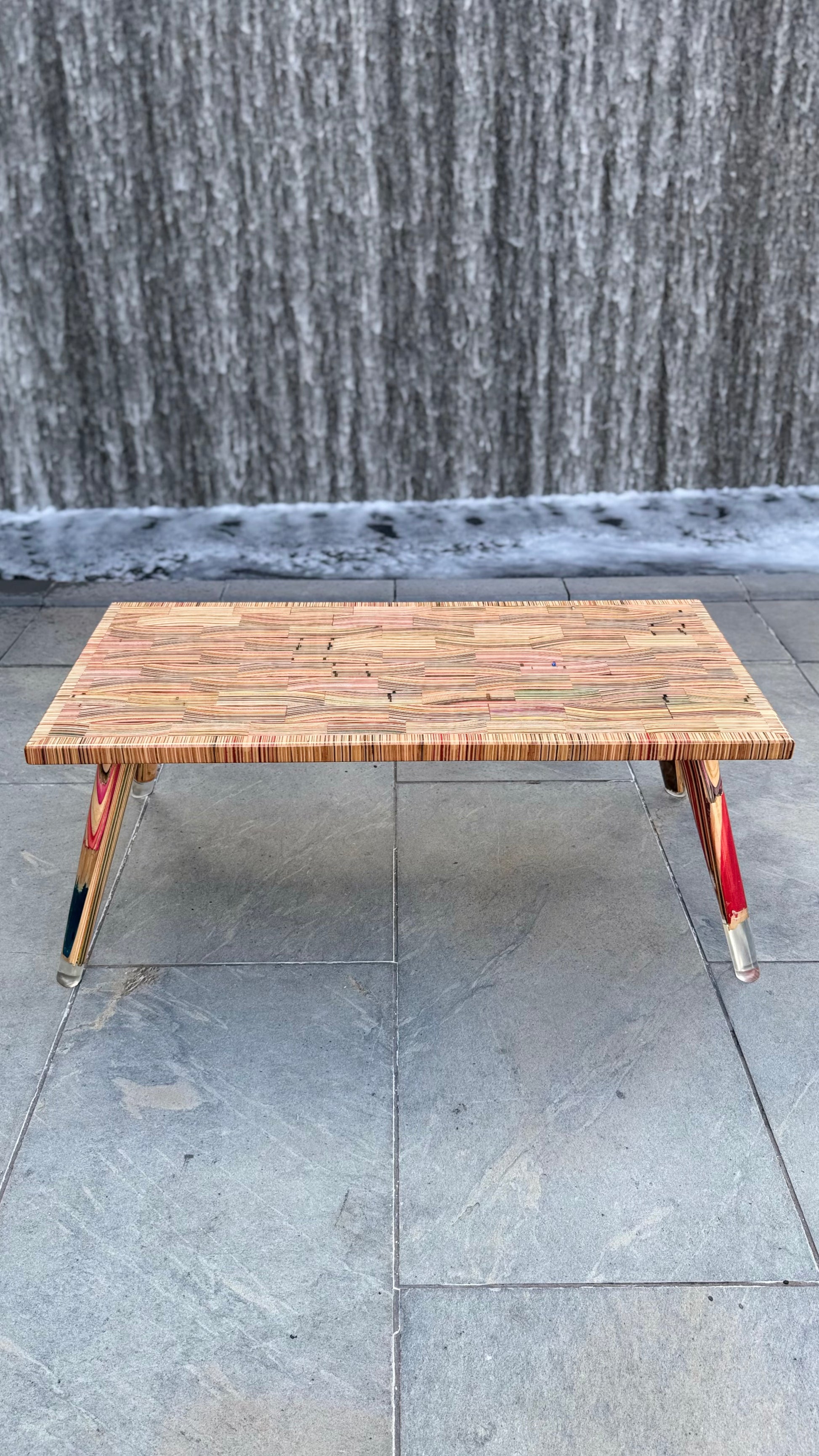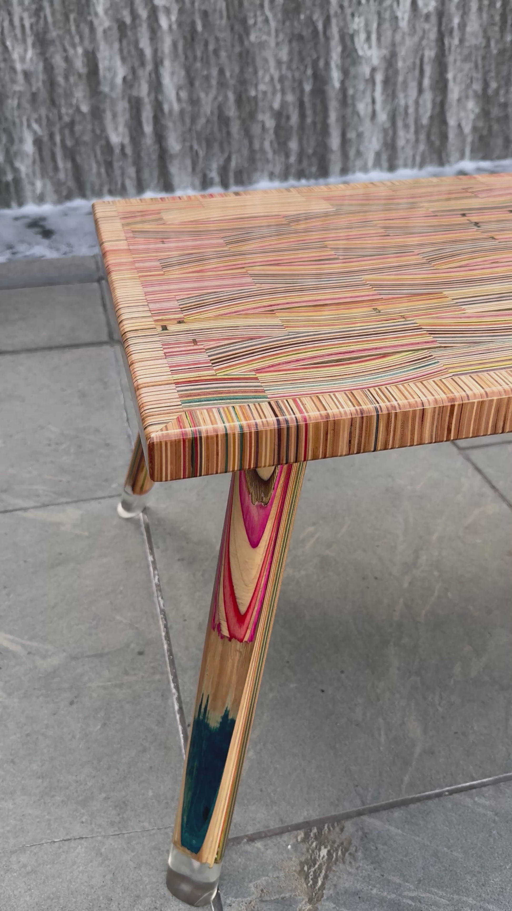 Modern coffee table made from broken recycled skateboards and epoxy. This piece features an epoxy top finish which means this lovely piece will last a lifetime and more. The curves on the table top come from alternating the noses and tails of old skateboards and then glueing them together. There are well over 60 skateboards in this piece with over 30 in the table top alone without the border. Each one of these boards has a story and in my eyes represents the energy that people put into something constructive by riding their skateboard. In my head all of that good energy goes into each one of these pieces to make them look and feel totally unique and alive. ~24”W X 45”L X 18”H