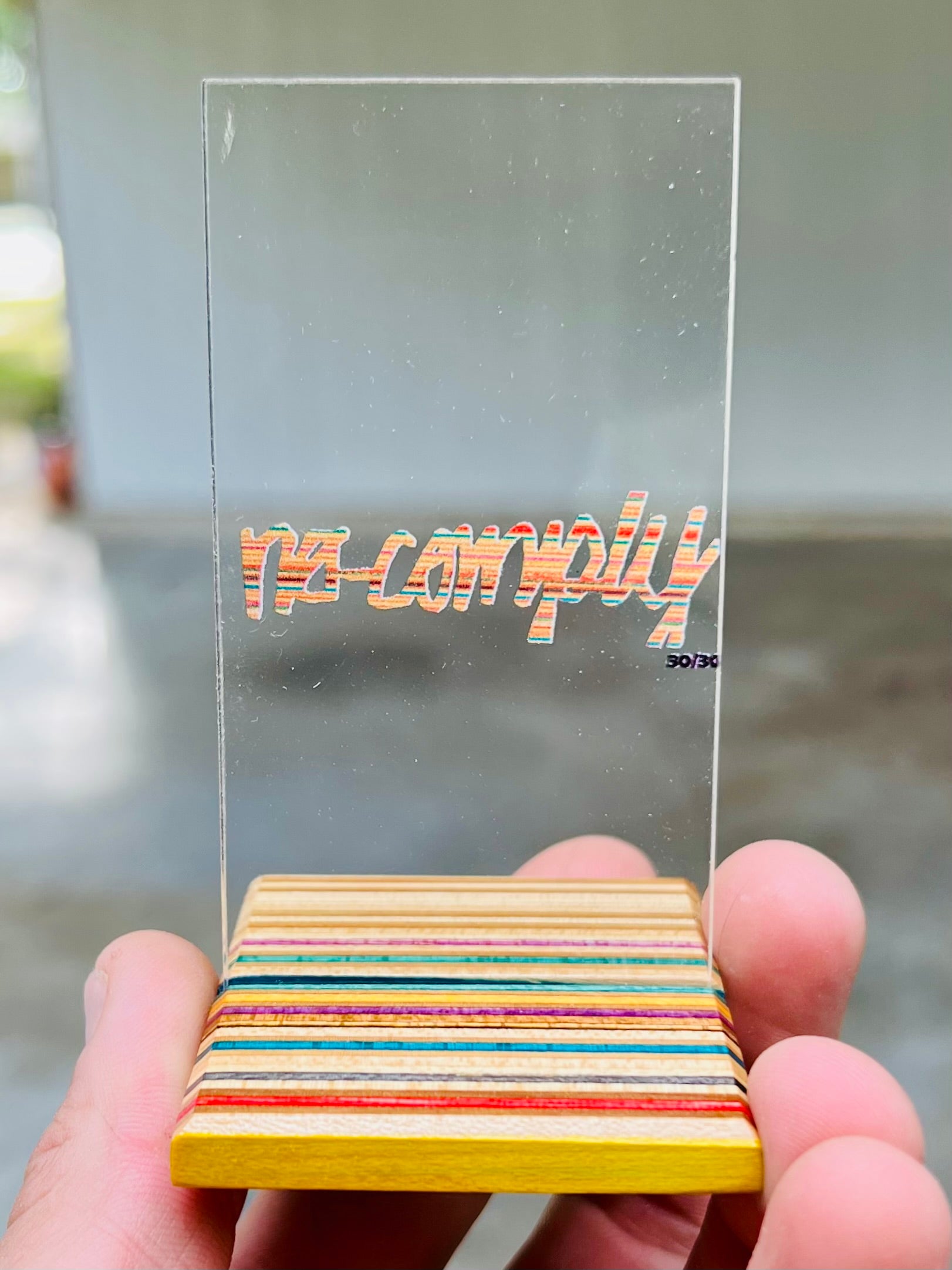 2” x 4” Acrylic print with 3D effect with 2” x 2” recycled skateboard base. Each piece is hand signed and individually numbered to make each one truly unique. 50% of profits go to No Comply Skateshop. ✨