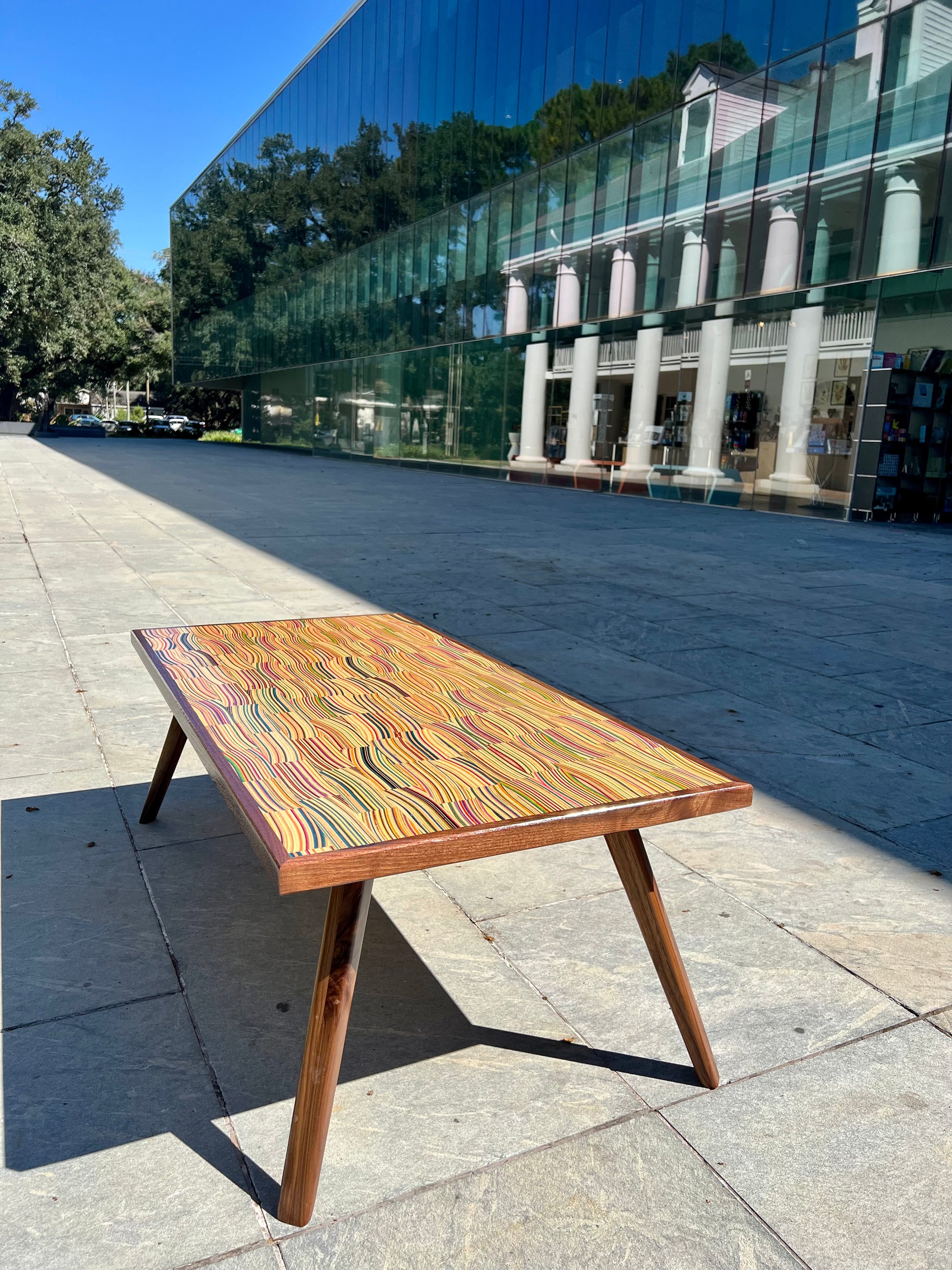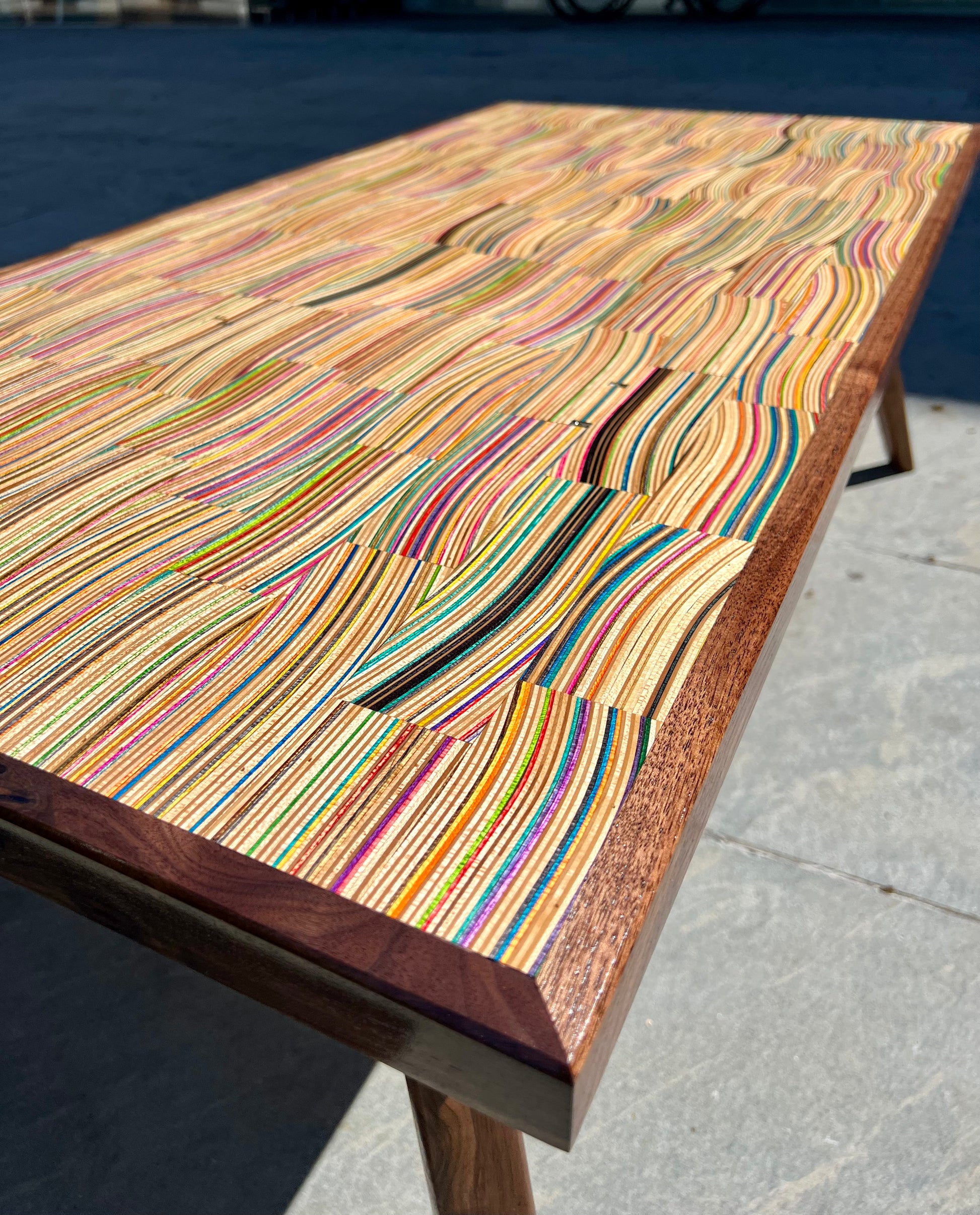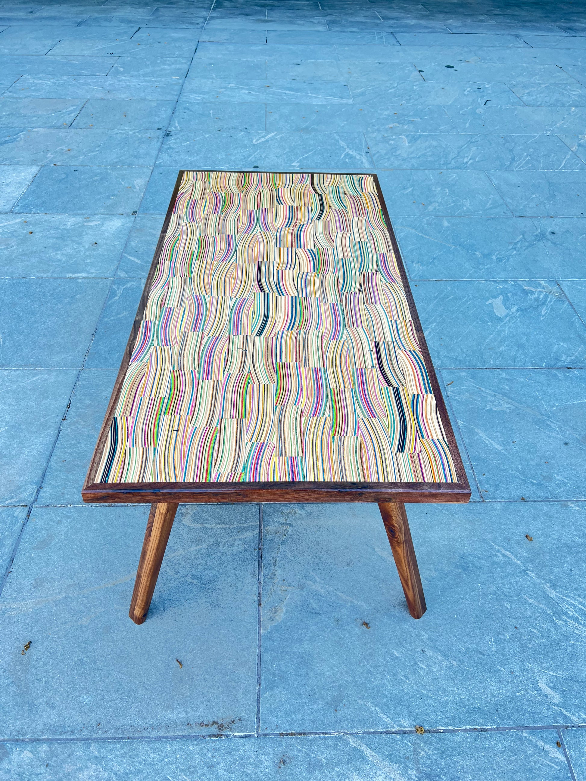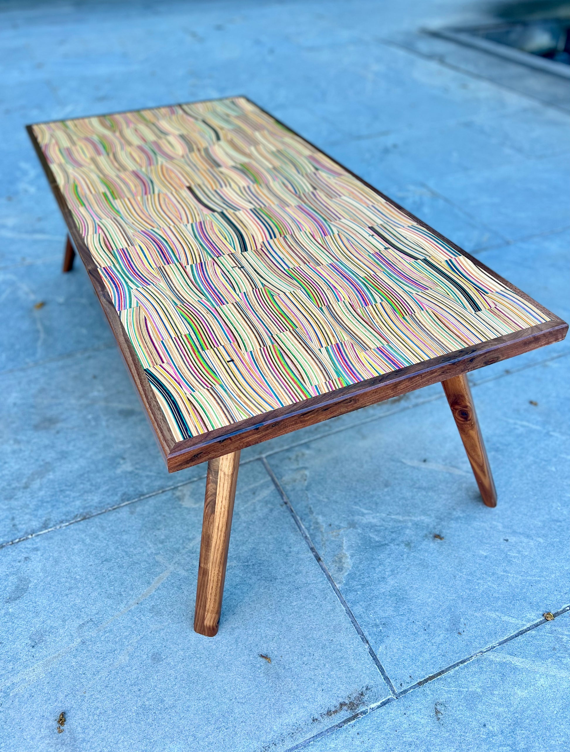 Mid century modern coffee table handmade from recycled skateboards and black walnut. ~21”Wx45”Lx18”H