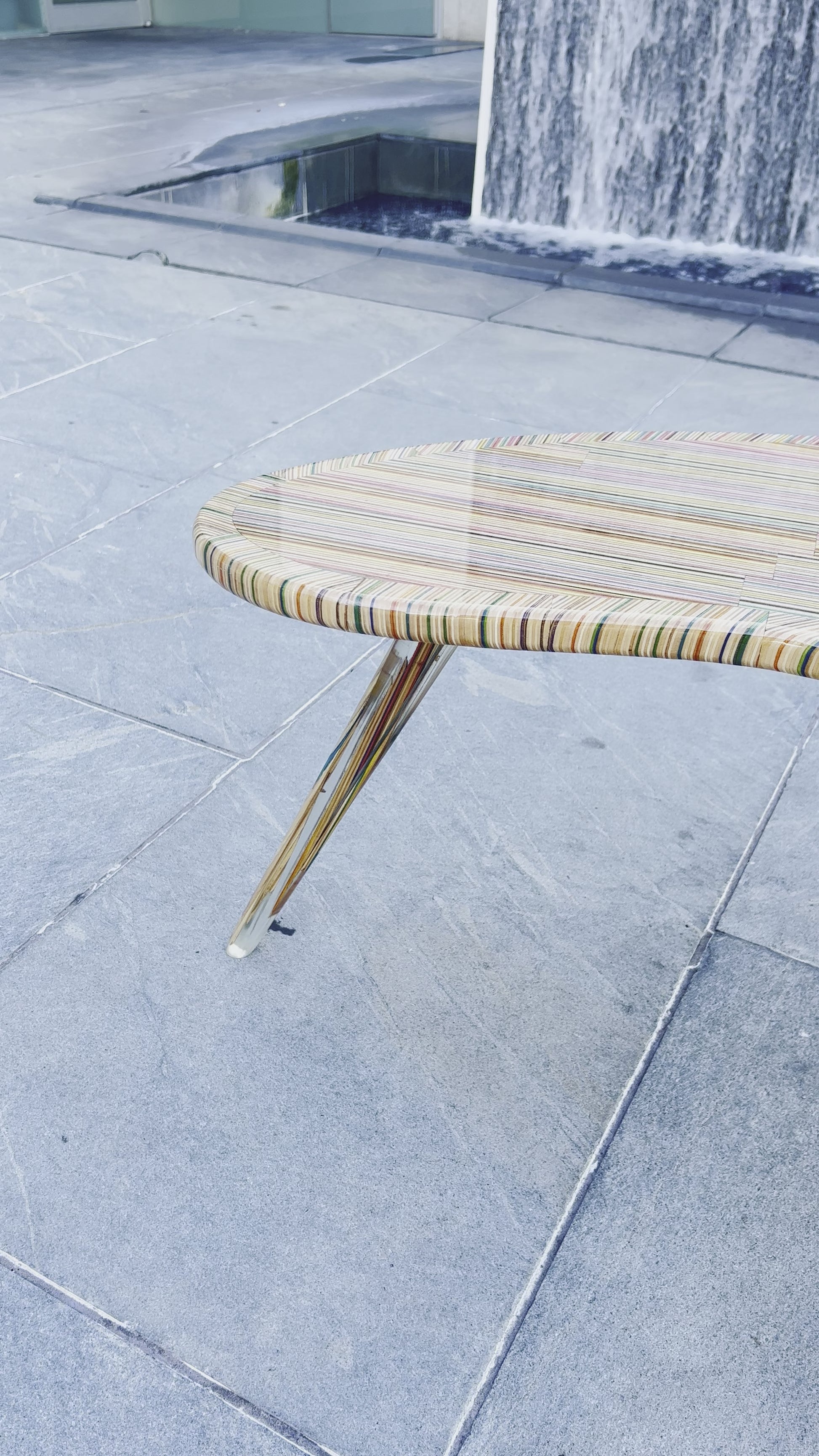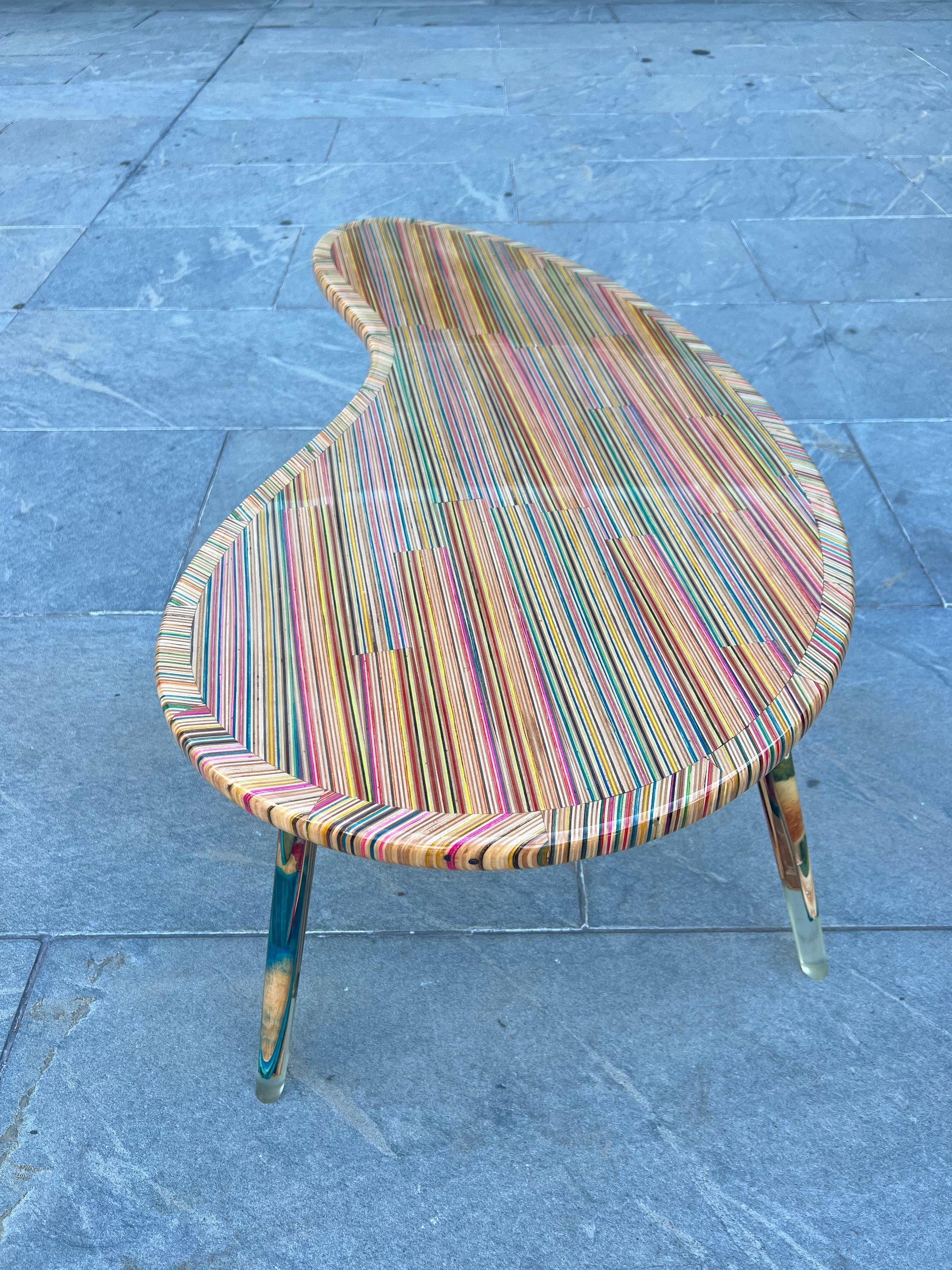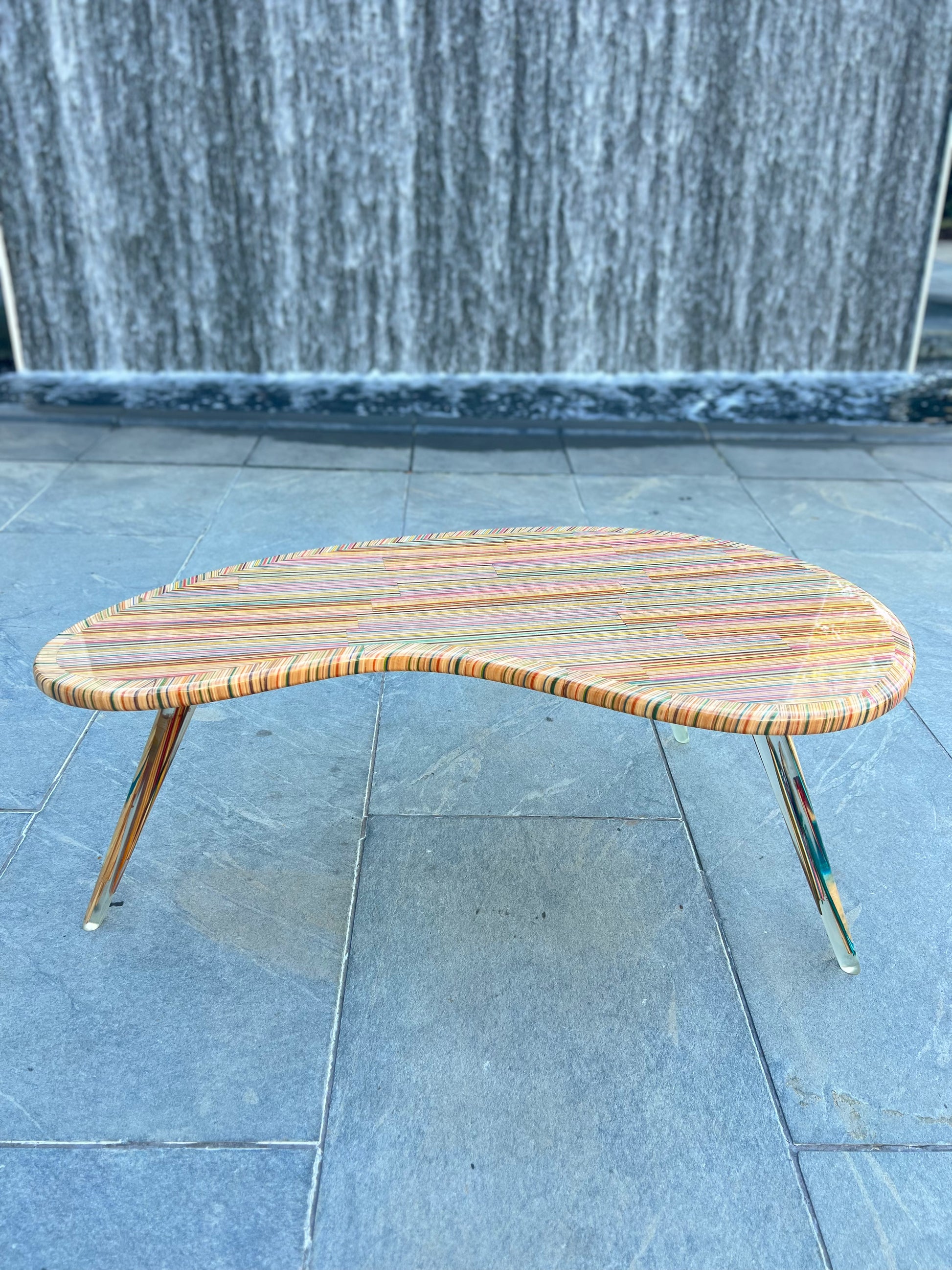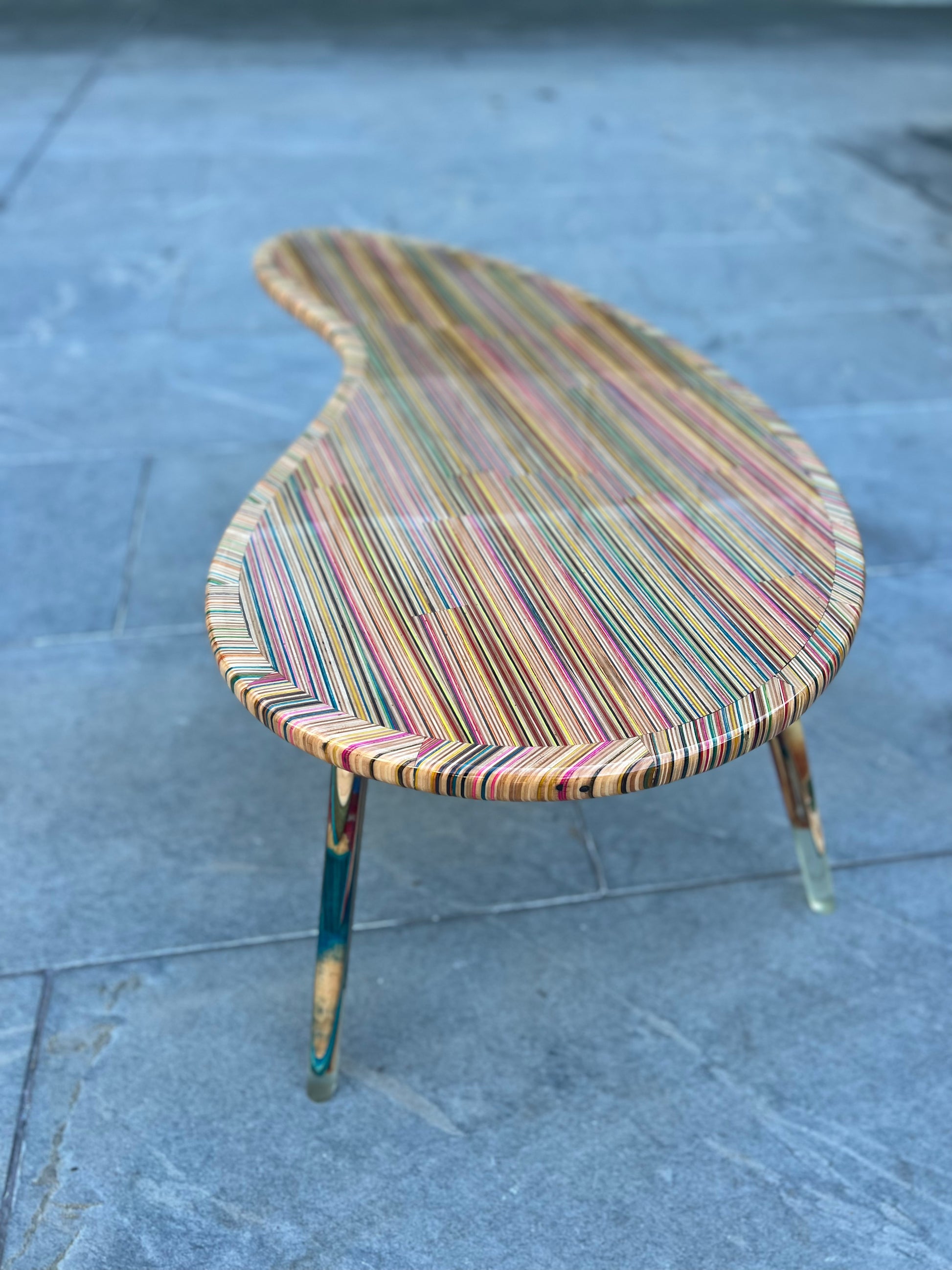 This table is made from recycled skateboards and epoxy! It features a curved segmented skateboard border, a straight line skateboard pattern on the top, and a mixture of epoxy and recycled skateboard legs. This piece was finished with an epoxy top coat so she should be a bomb proof table that lasts for years and years to come with zero maintenance. This is a design I’m very proud of and had swimming around in my head for years before I finally made it. I love the way this one turned out!✨