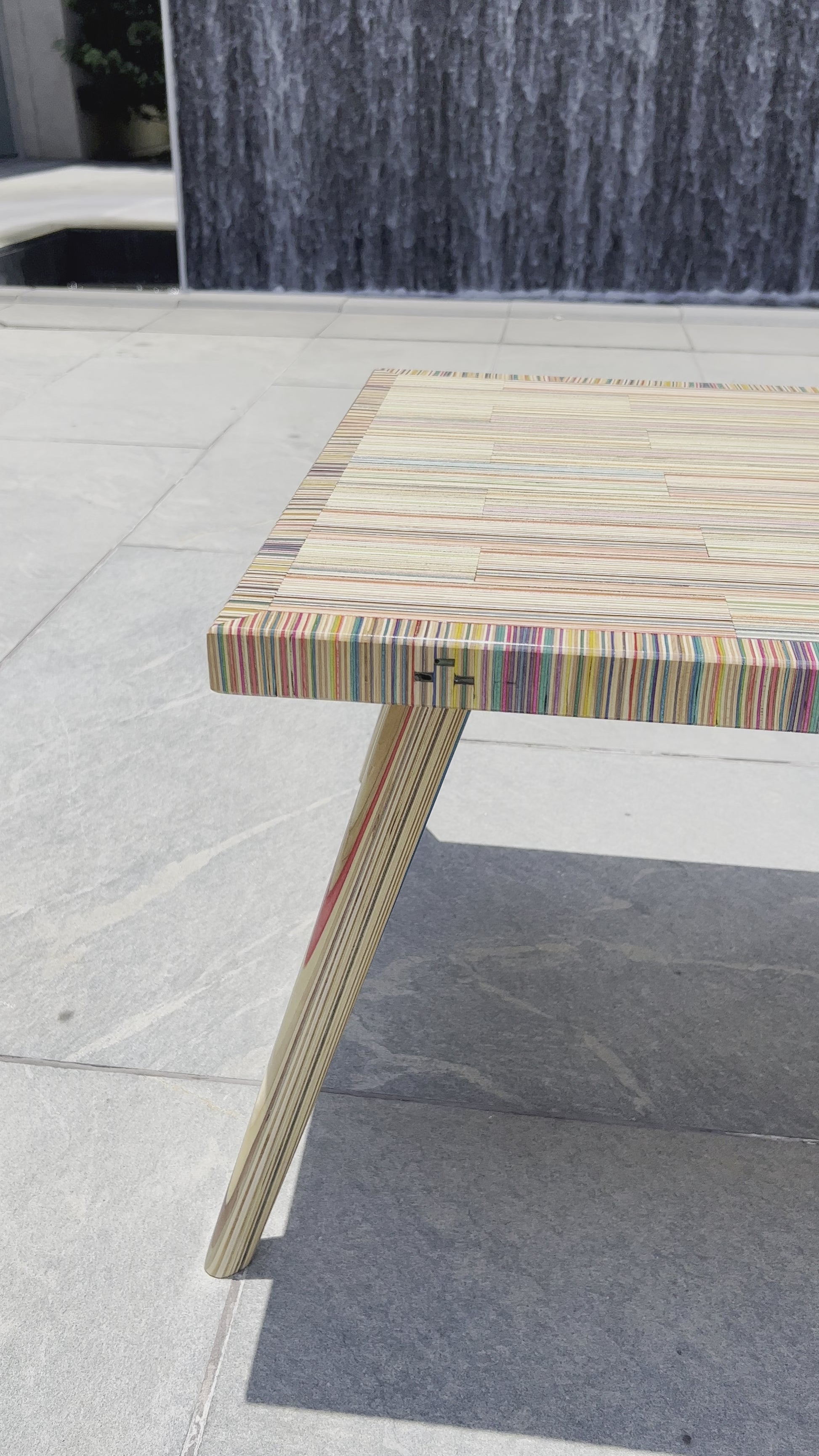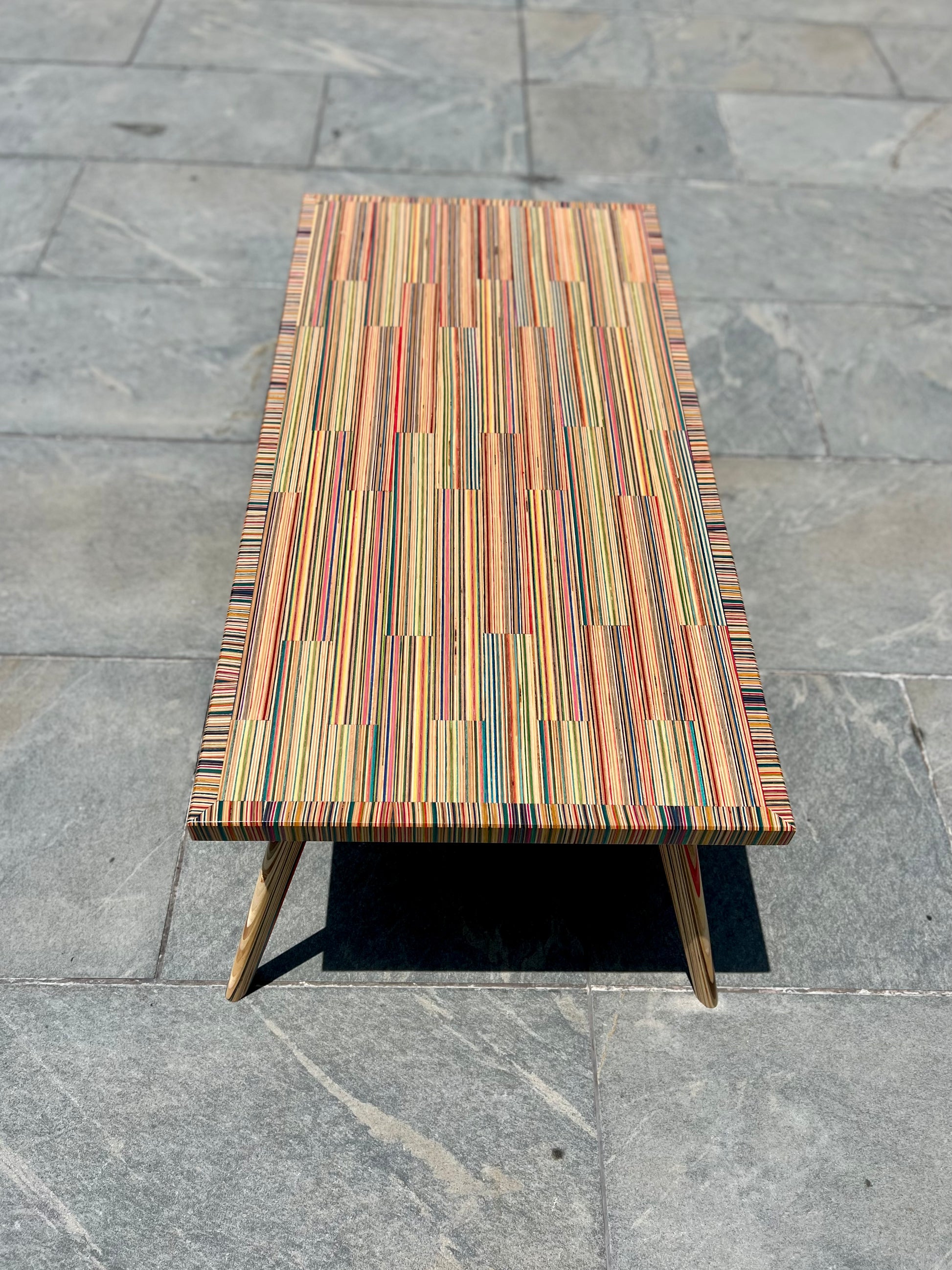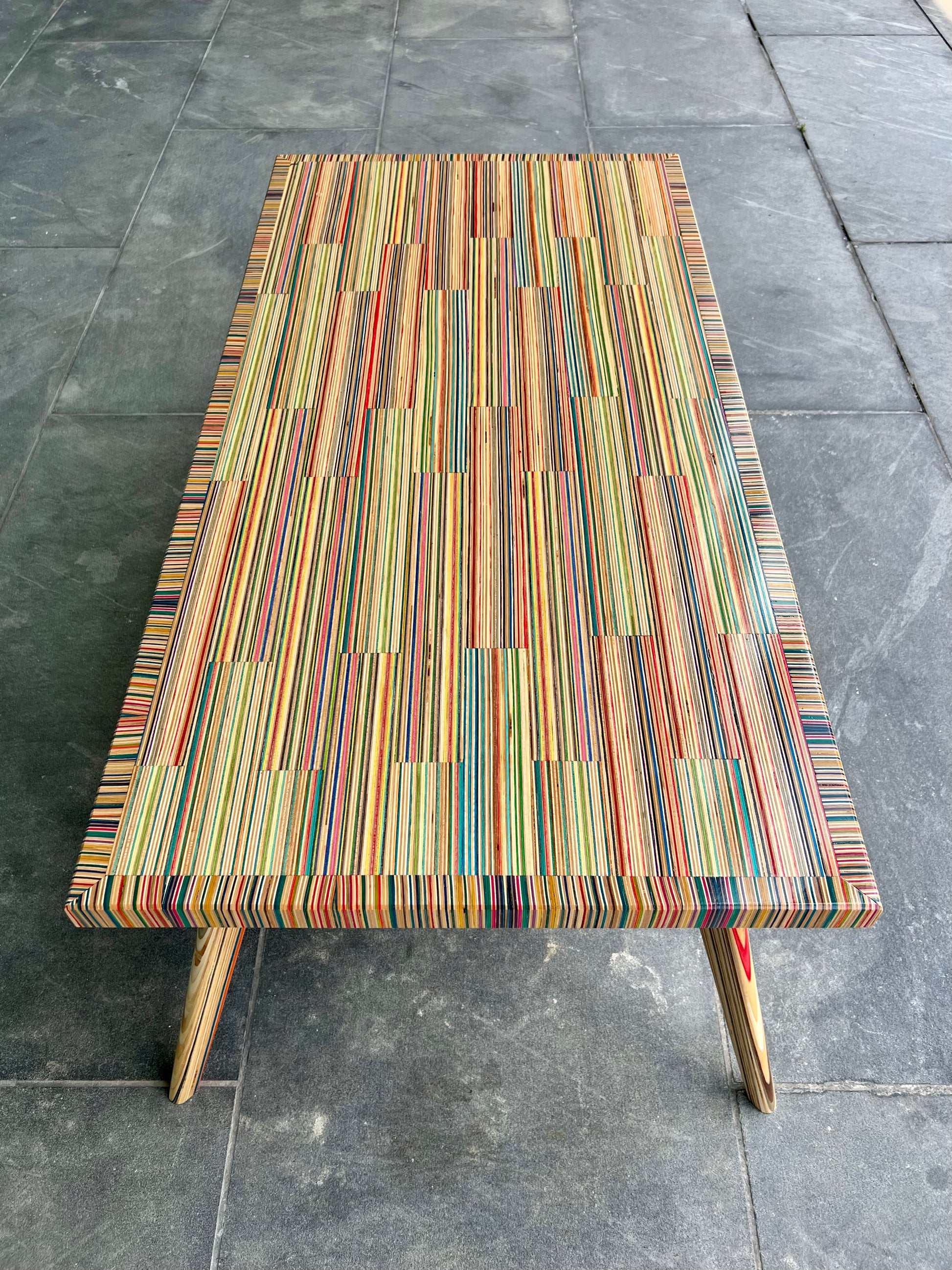 Please allow 4-6 months for completion as every piece is handmade to order. This modern coffee table is handmade using recycled skateboards that were ridden by skateboarders all over the US. It features over 45 skateboards in the table top/boarder and another 15 in the legs. ~42” x 21” x 18”