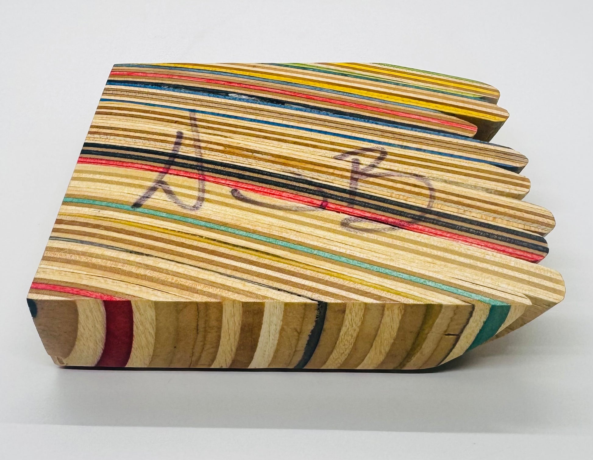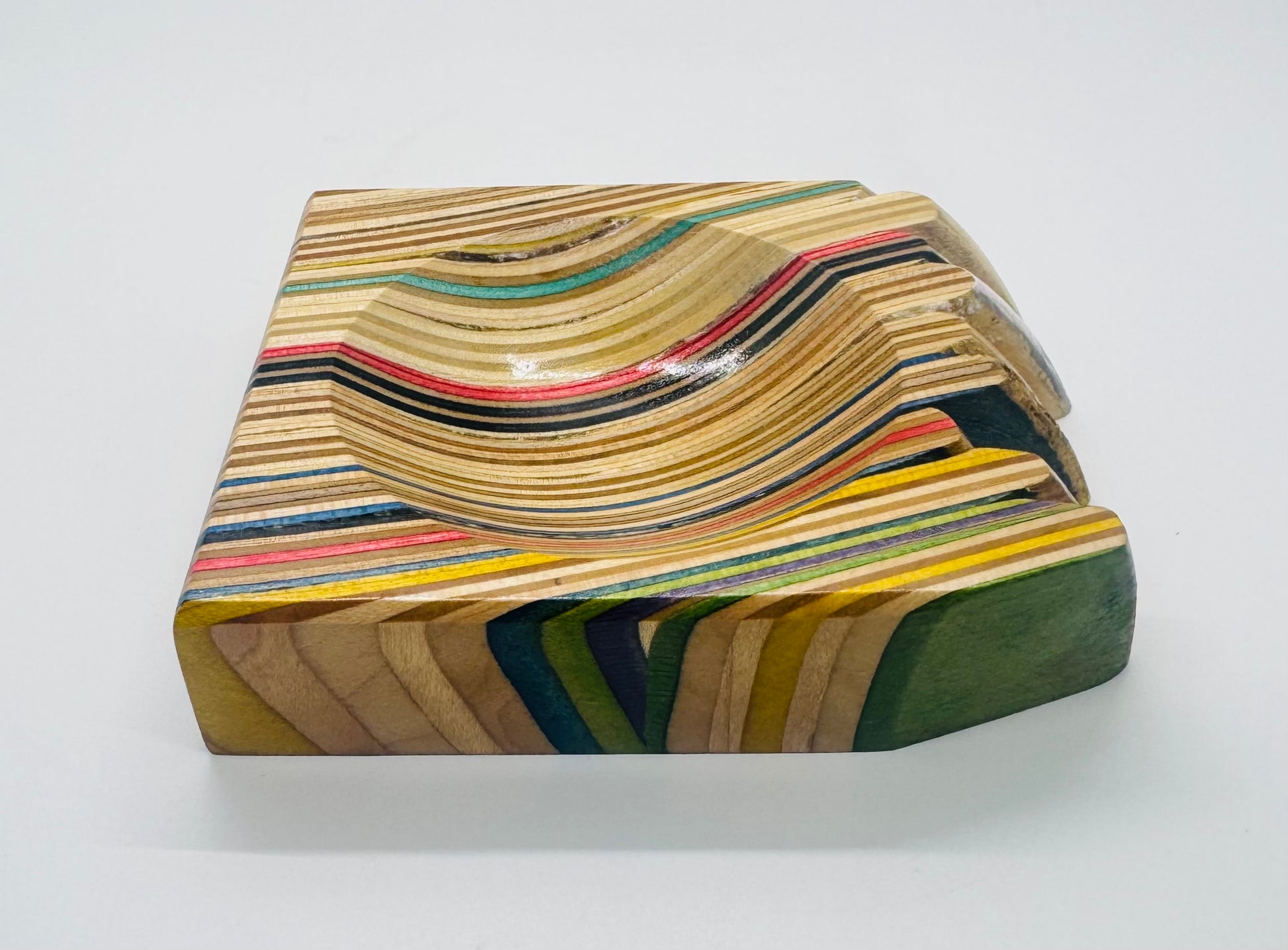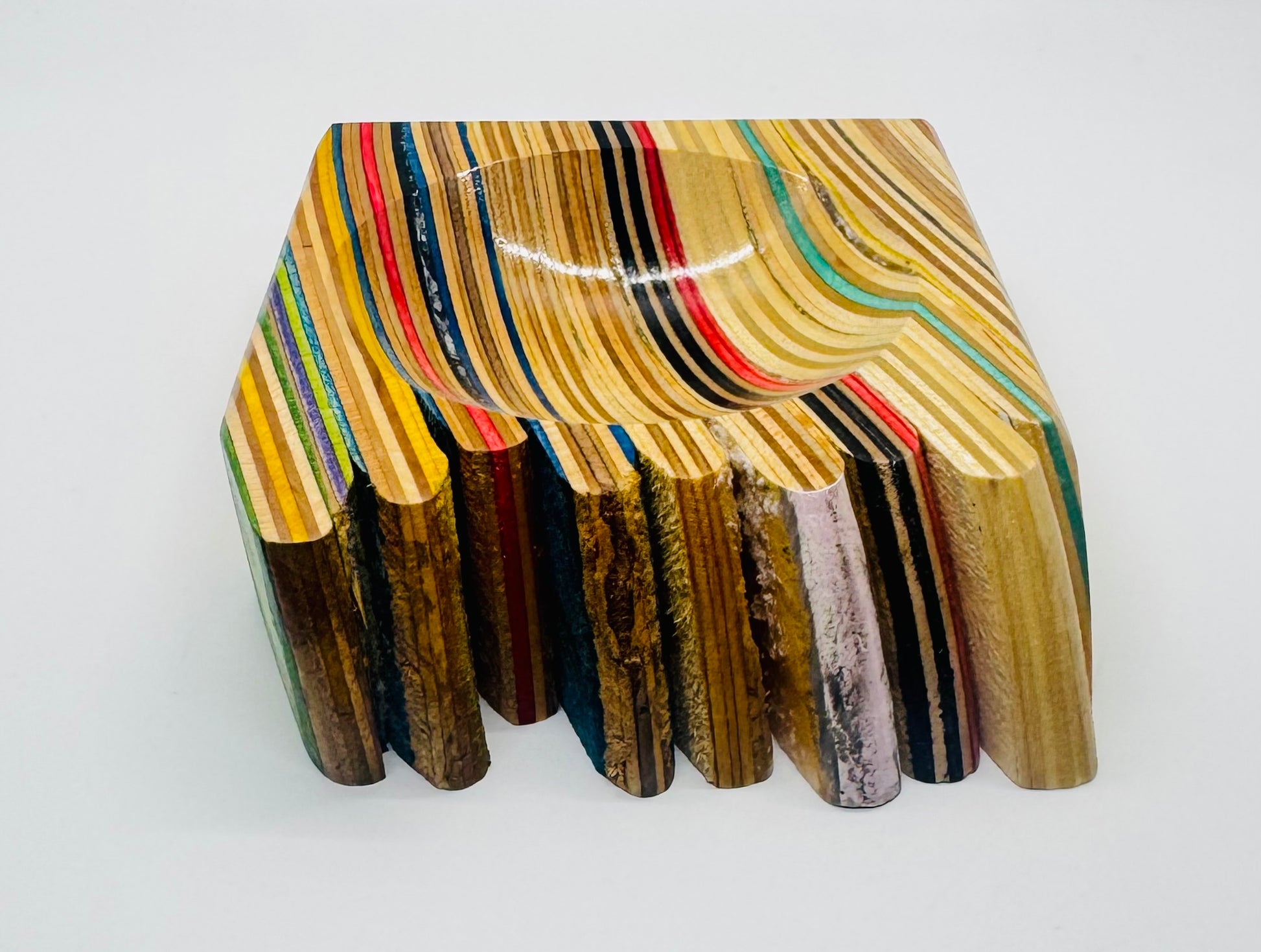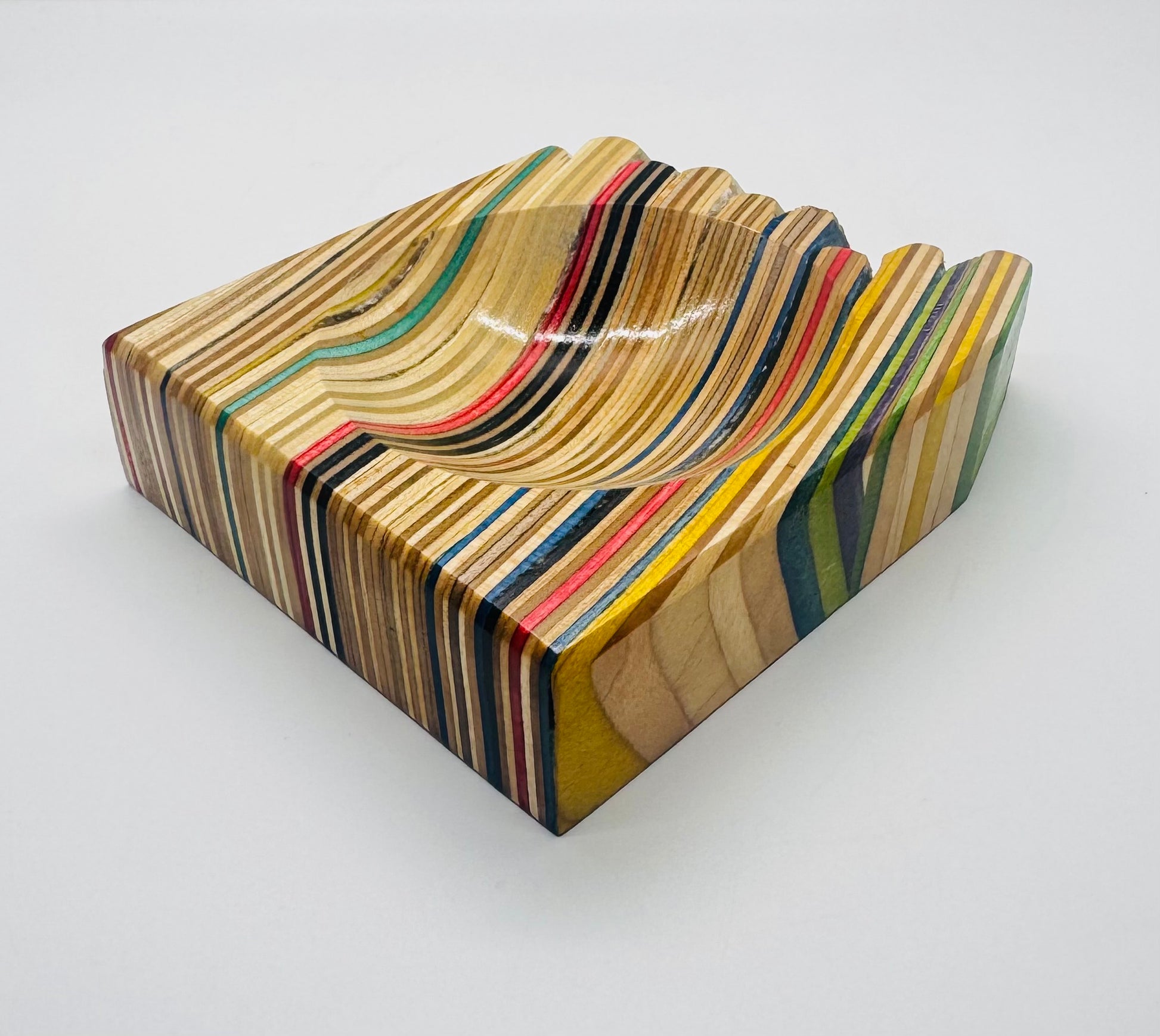 Coin dish handmade from recycled skateboards and featuring a “raw skateboard” edge. To achieve this effect we left one side of the skateboard block completely untouched in the creation process. Both Leo and myself are fond of this design. ~4.5” x 4.5”
