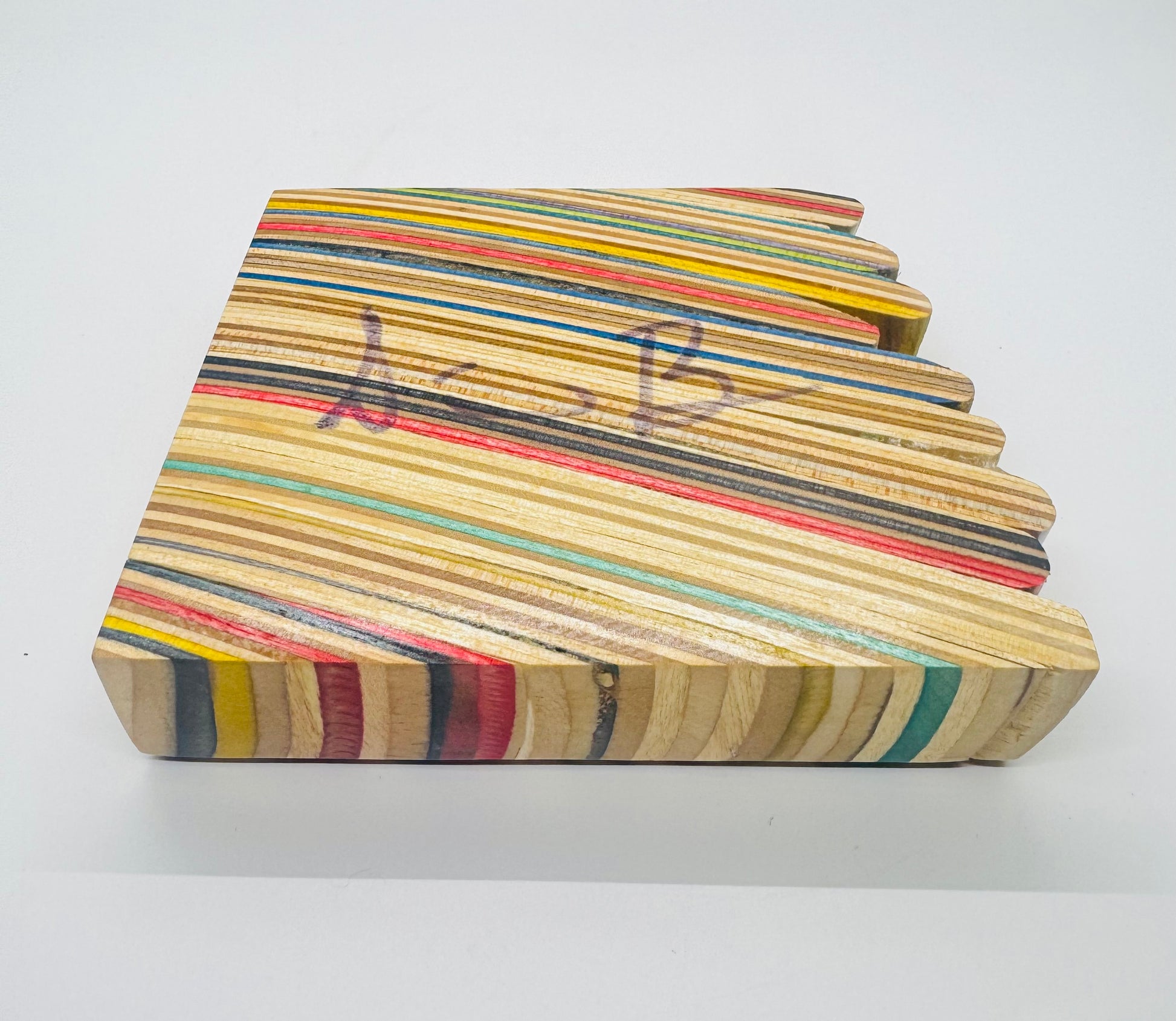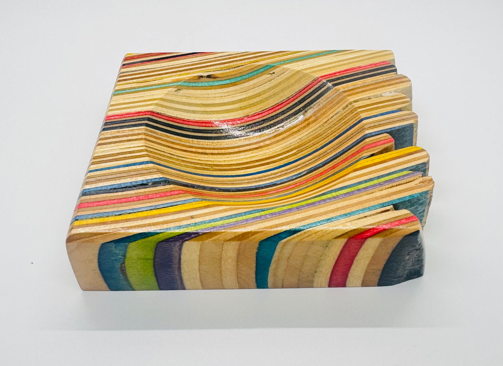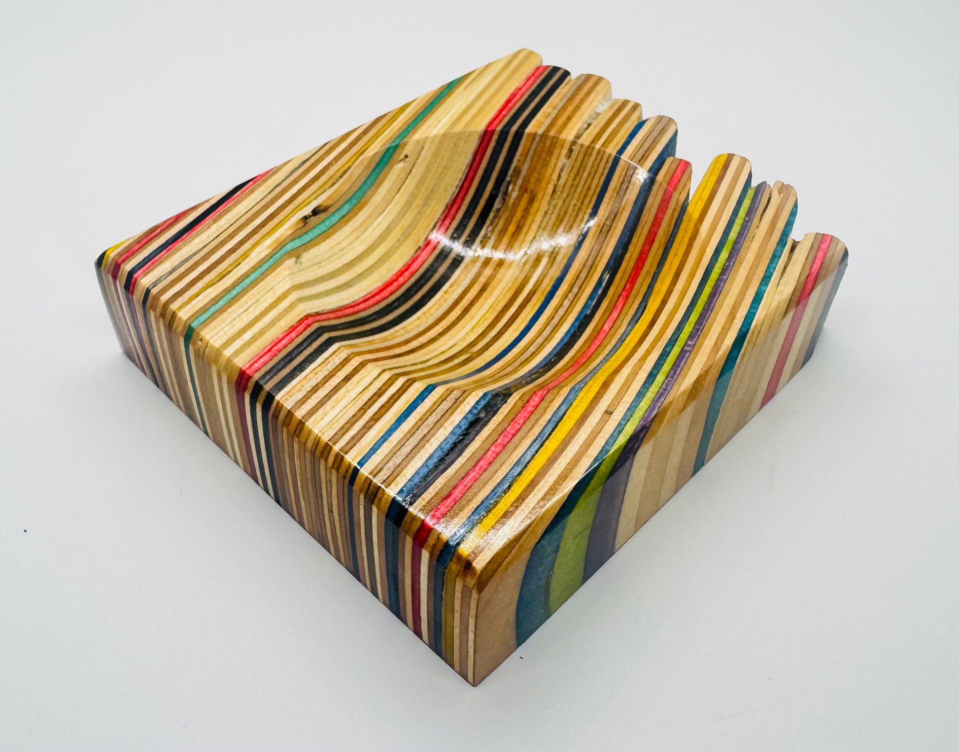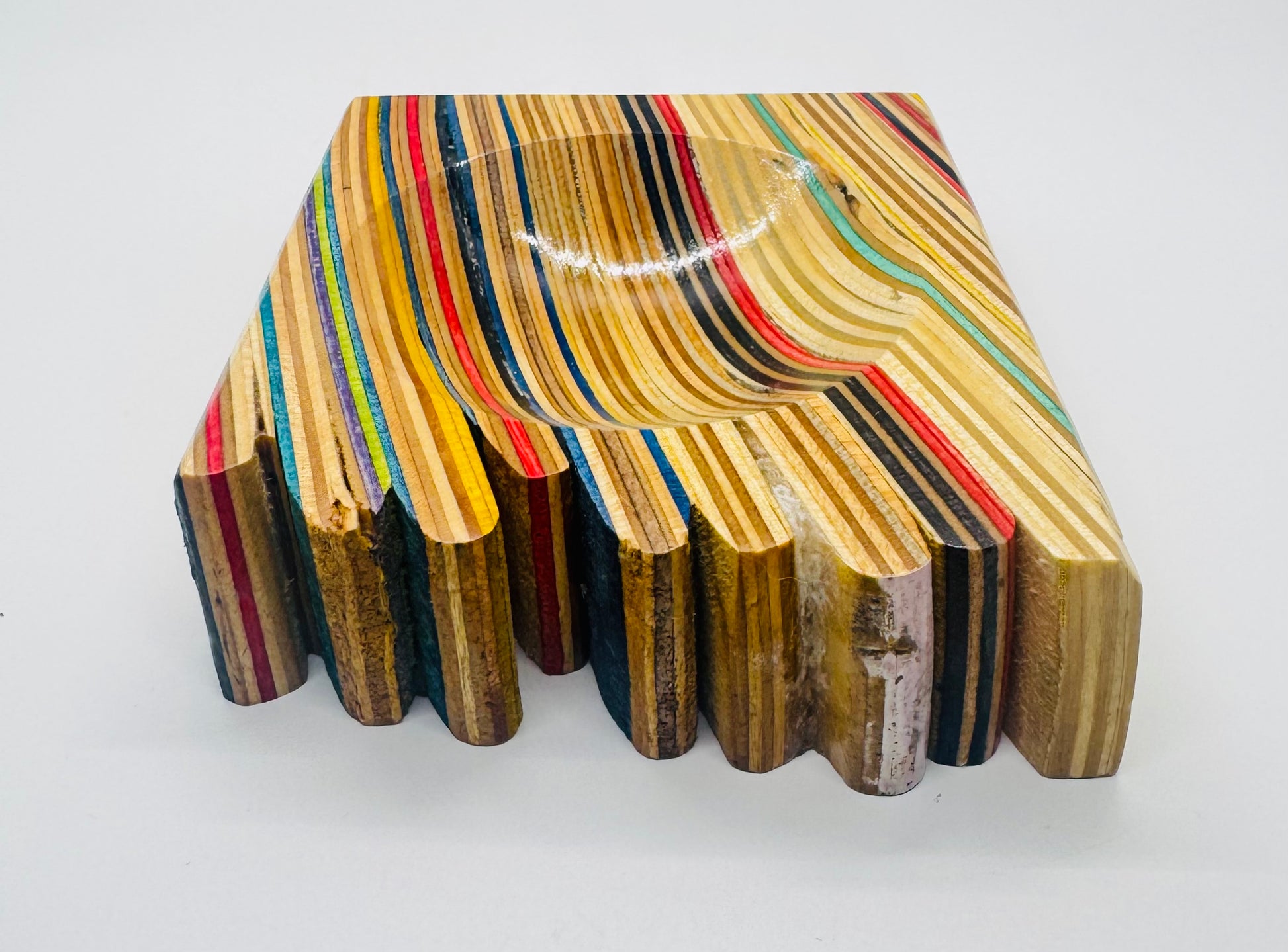Coin dish handmade from recycled skateboards. This piece features an edge of “raw skateboards” where we left the sides untouched throughout the making process. Both Leo and I are fond of this design! 4.5” x 4.5”