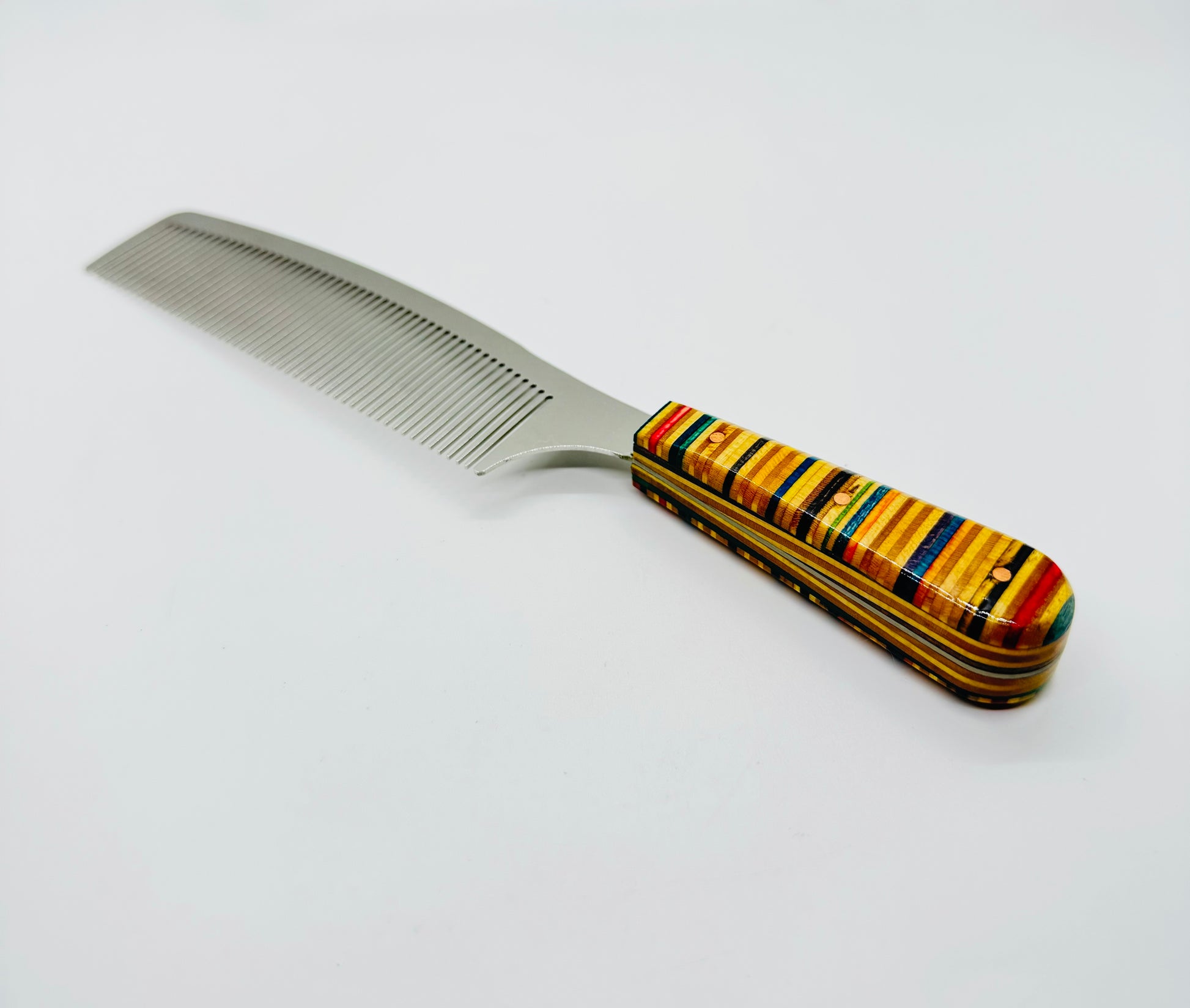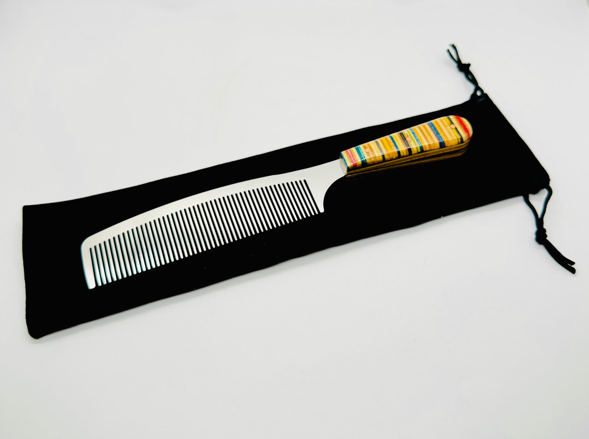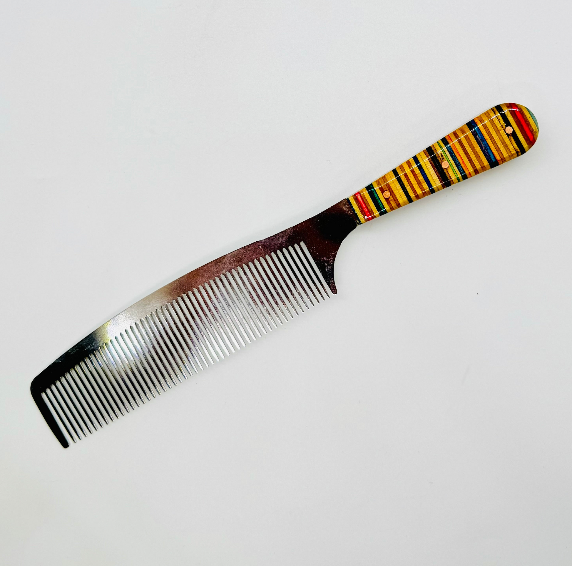 Comb handmade from two layers of recycled skateboards and stainless steel finished with copper pins and 12 coats of polyurethane for a long lasting piece. Each piece comes with a felt or canvas storage bag. ✨