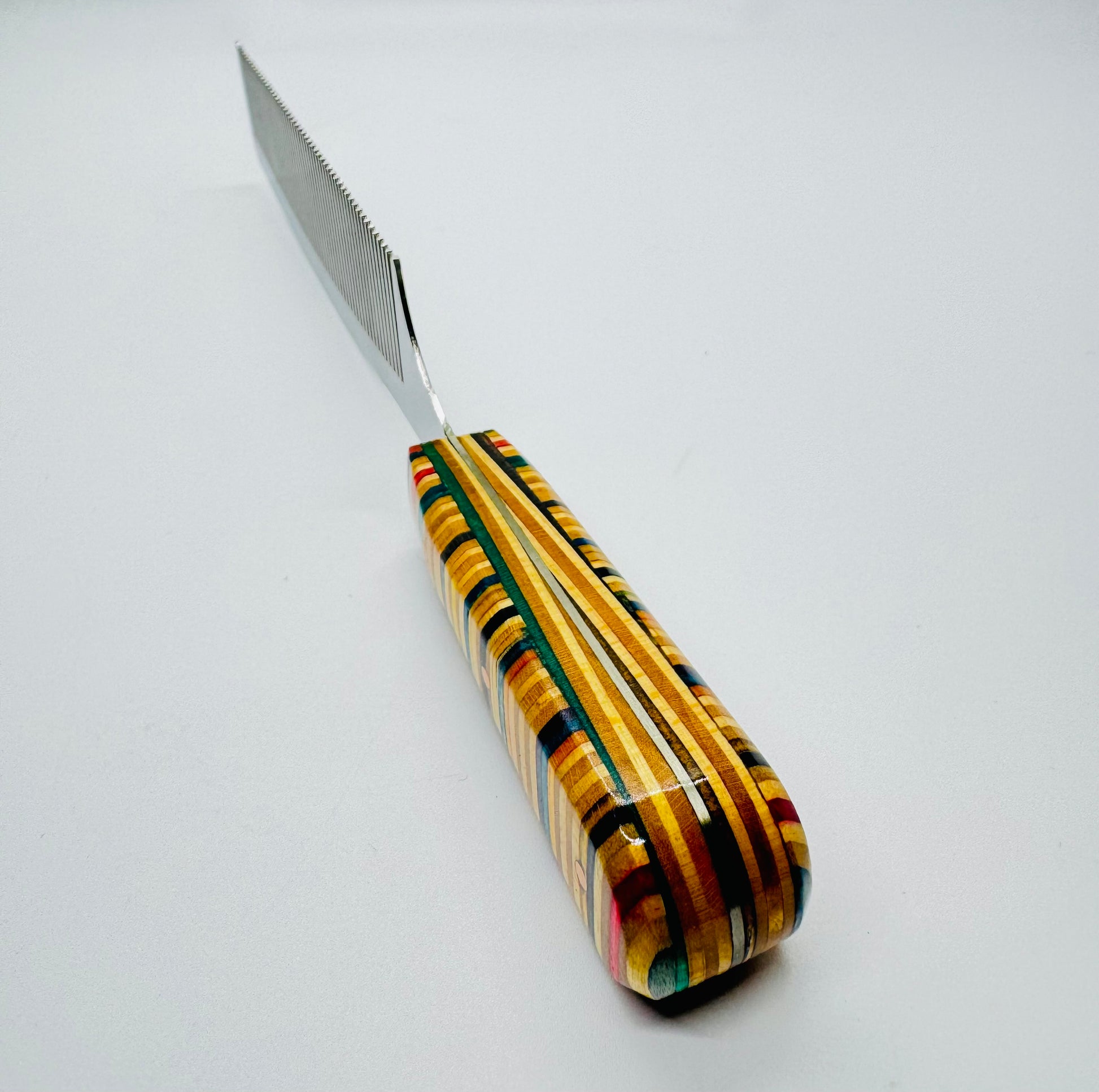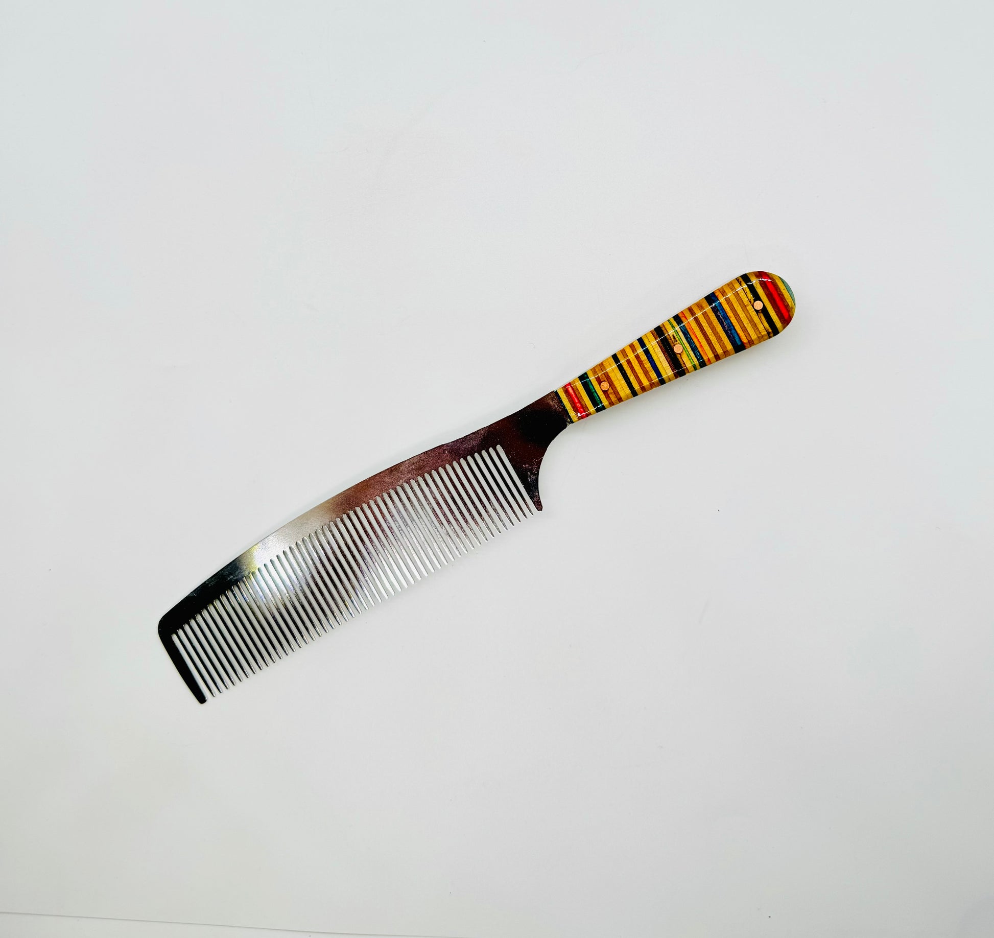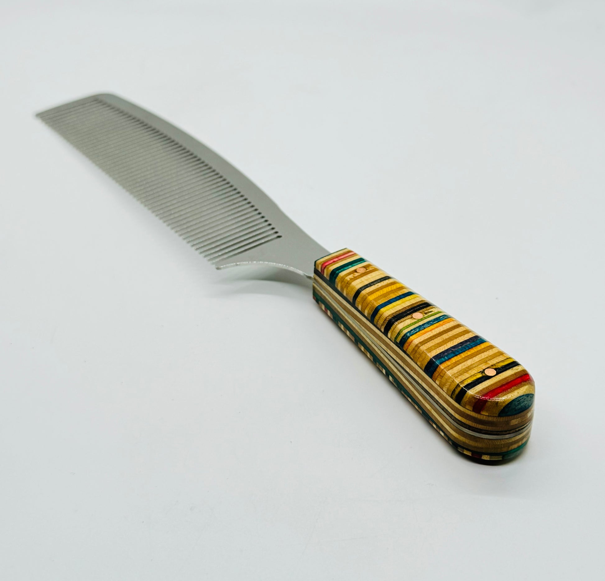 Comb handmade from two layers of recycled skateboards and stainless steel finished with copper pins and 12 coats of polyurethane for a long lasting piece. Each piece comes with a felt or canvas storage bag. ✨