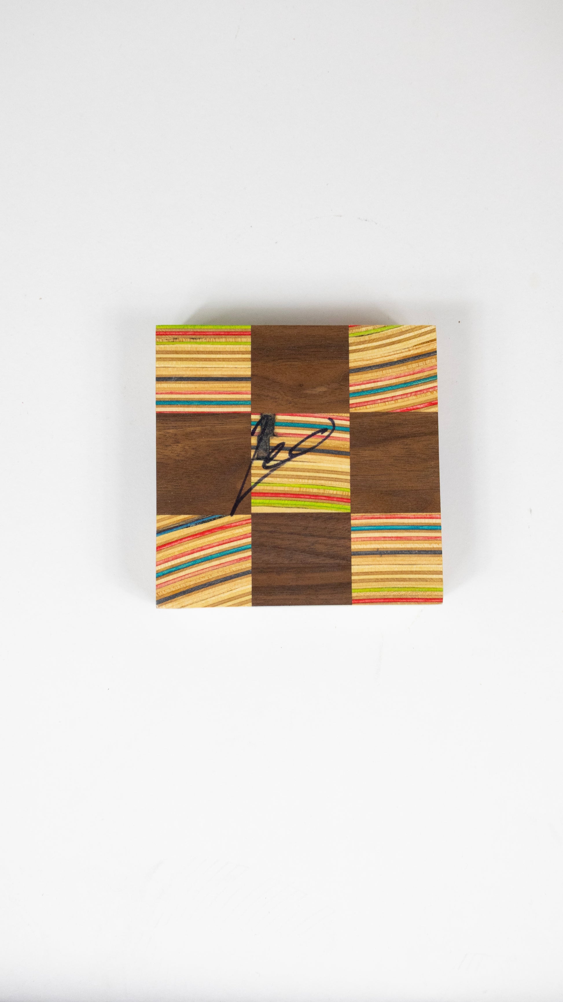 Unique small catch all handmade from recycled skateboards and black walnut. 6.5” x 6.5” x 1.2”