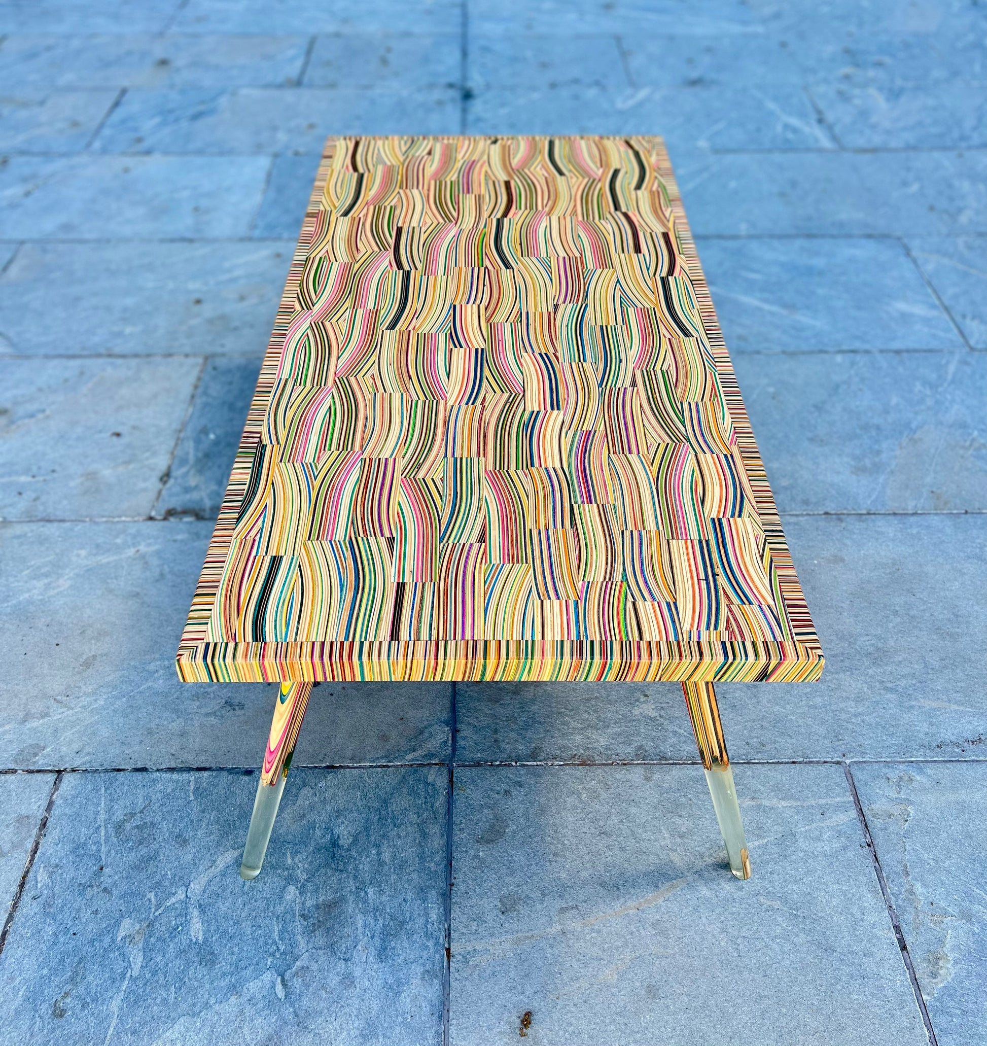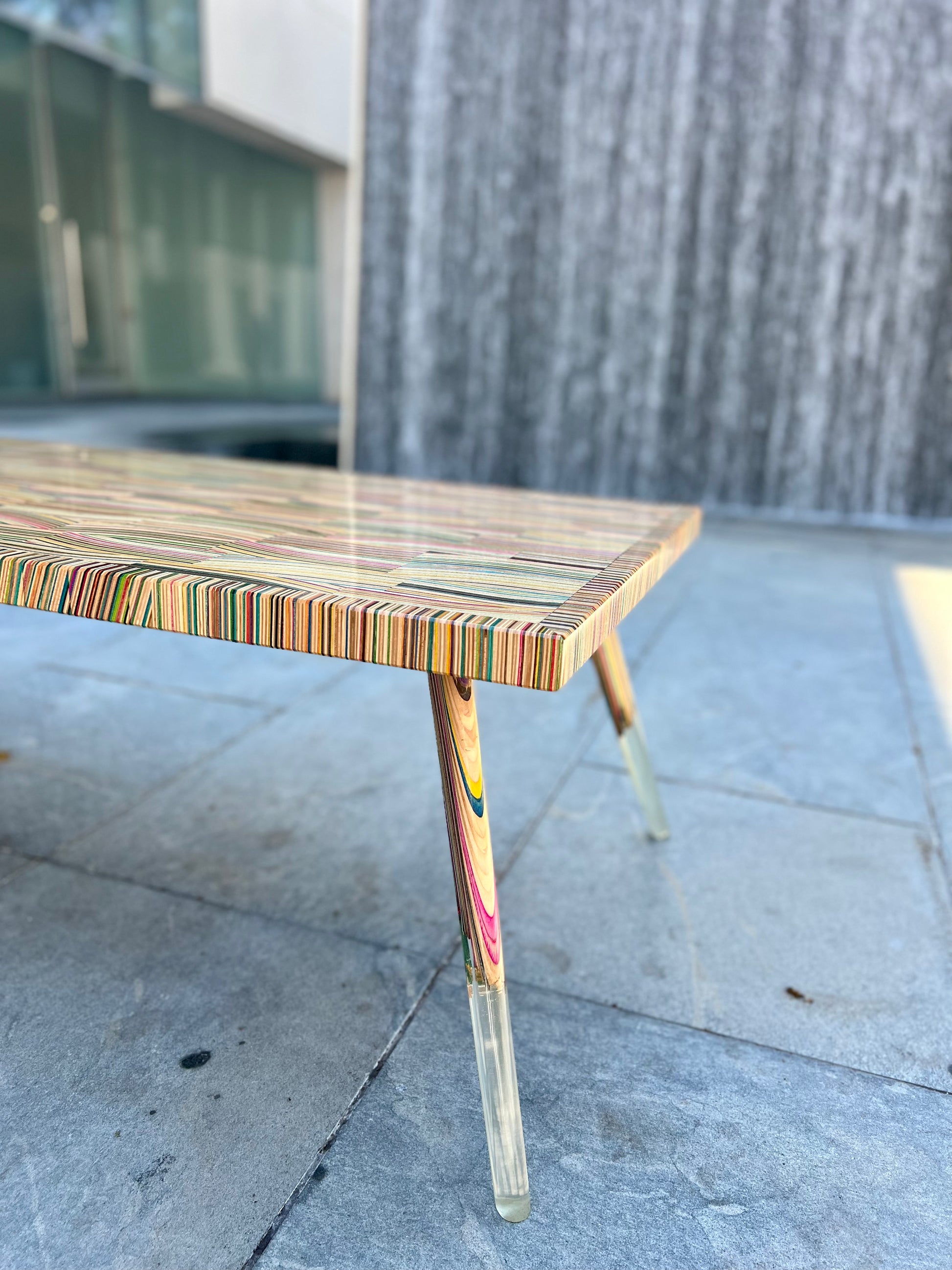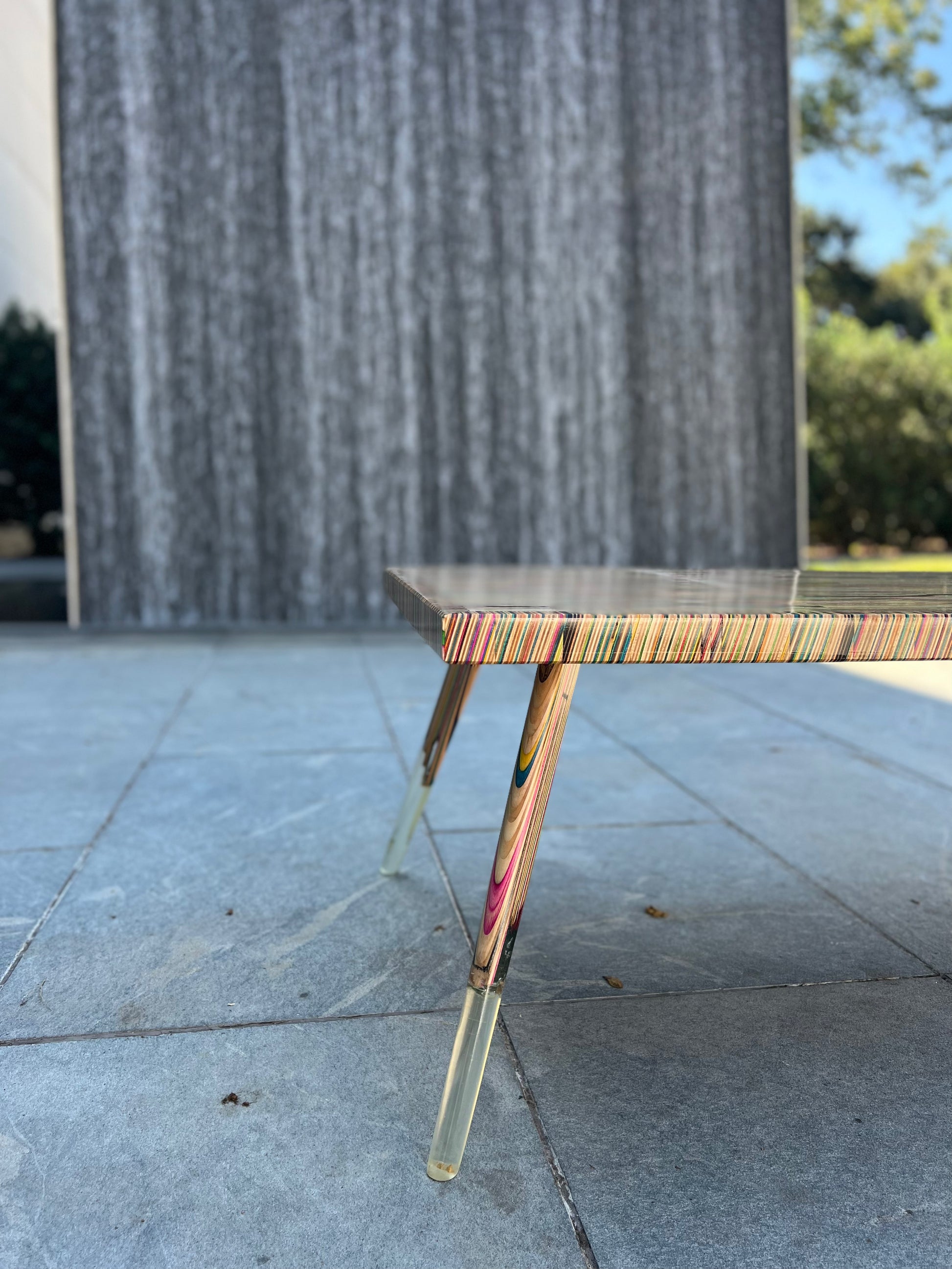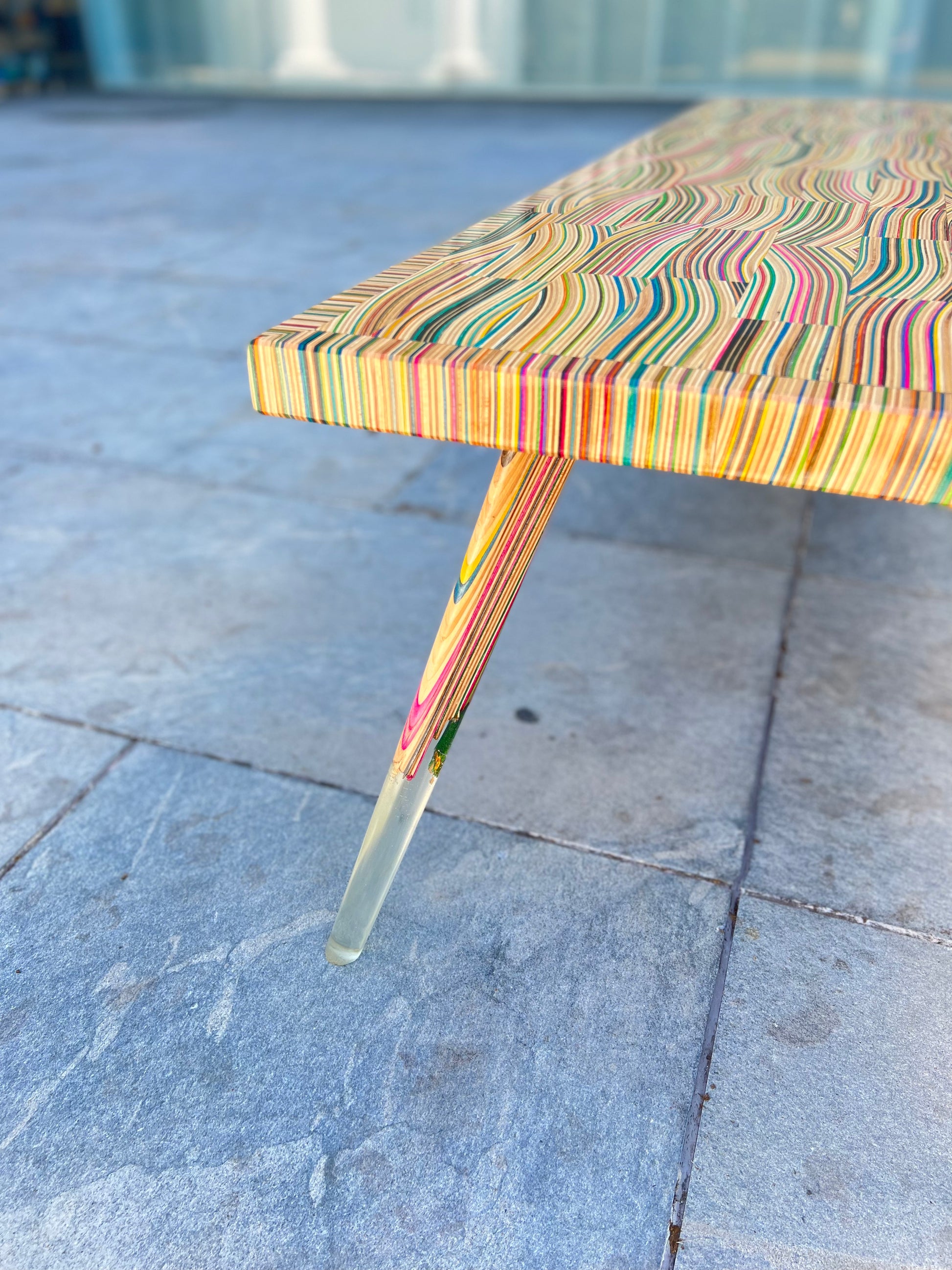 Mid century modern coffee table handmade from recycled skateboards and epoxy. ~21”Wx45”Lx18”H