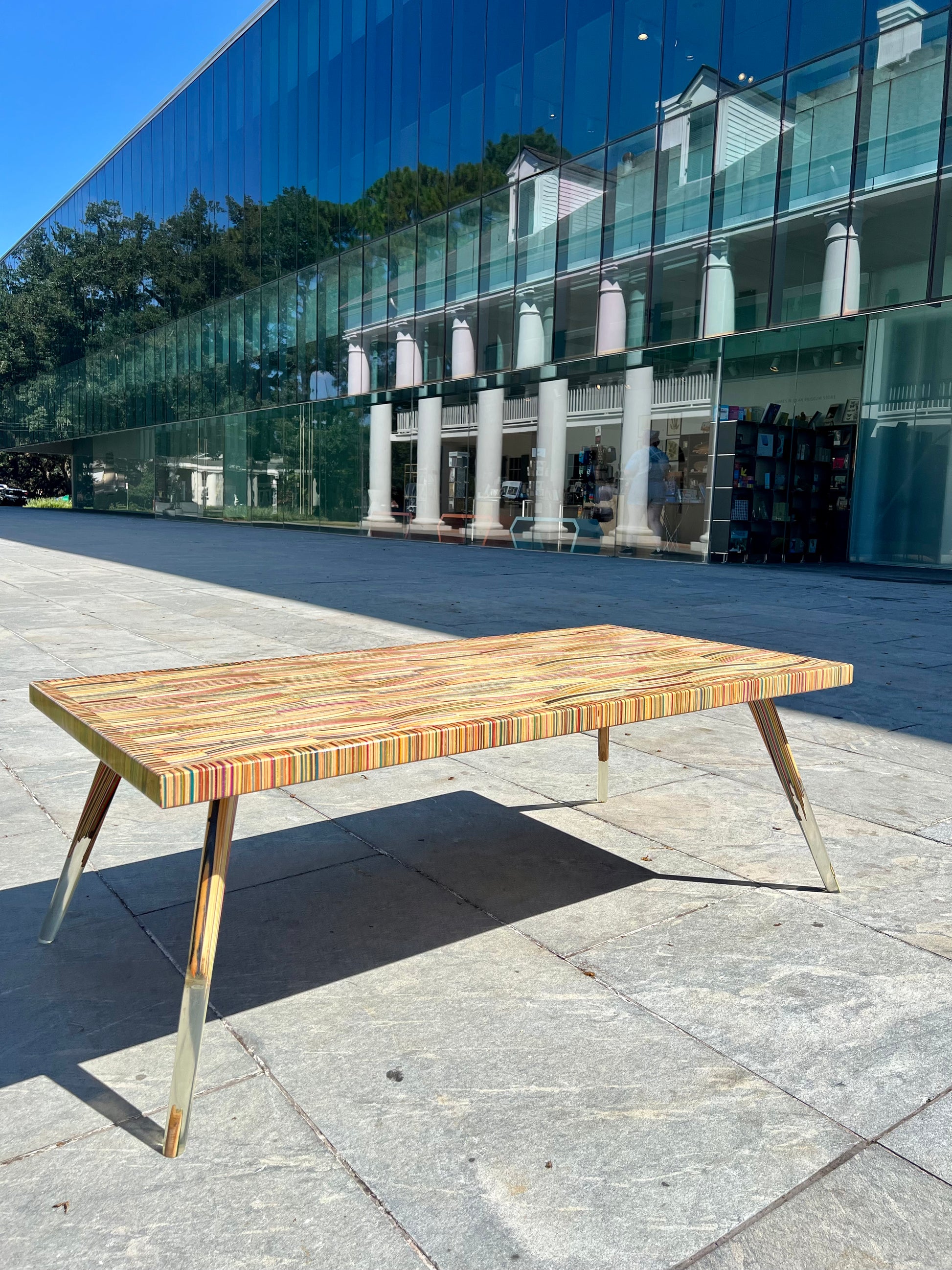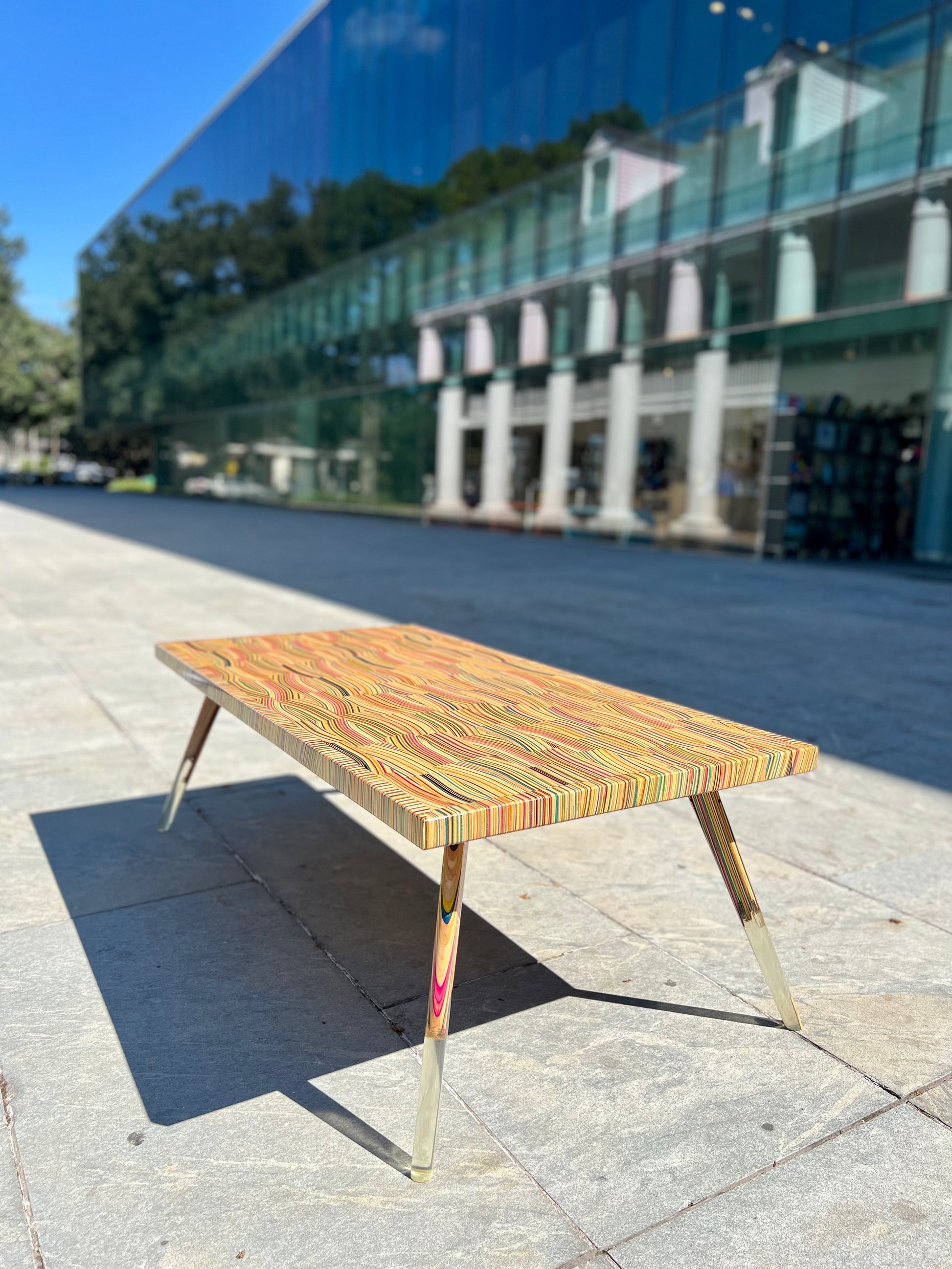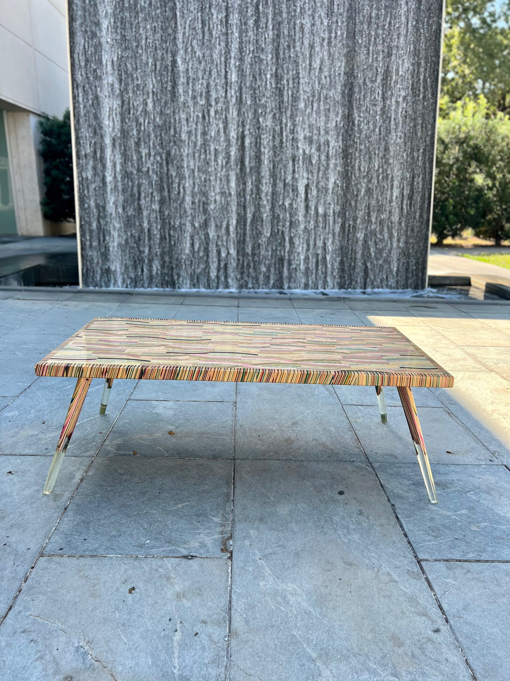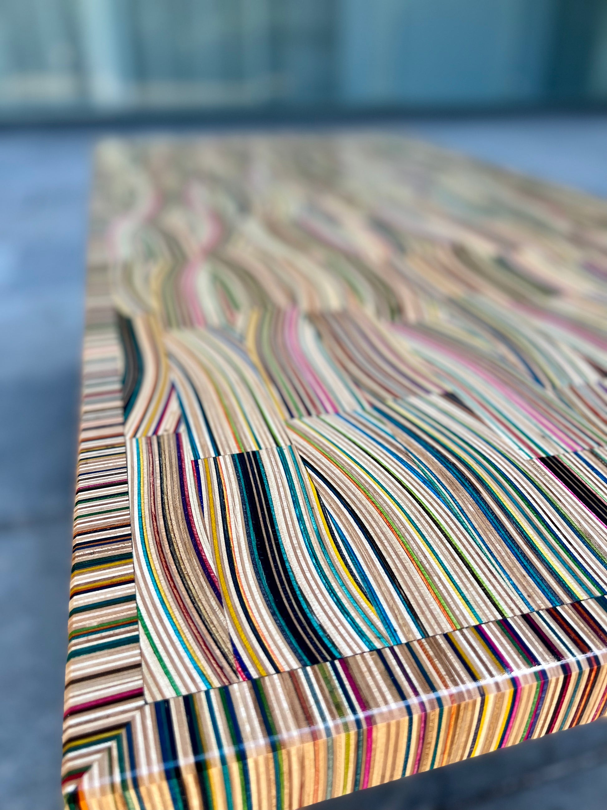 Mid century modern coffee table handmade from recycled skateboards and epoxy. ~21”Wx45”Lx18”H