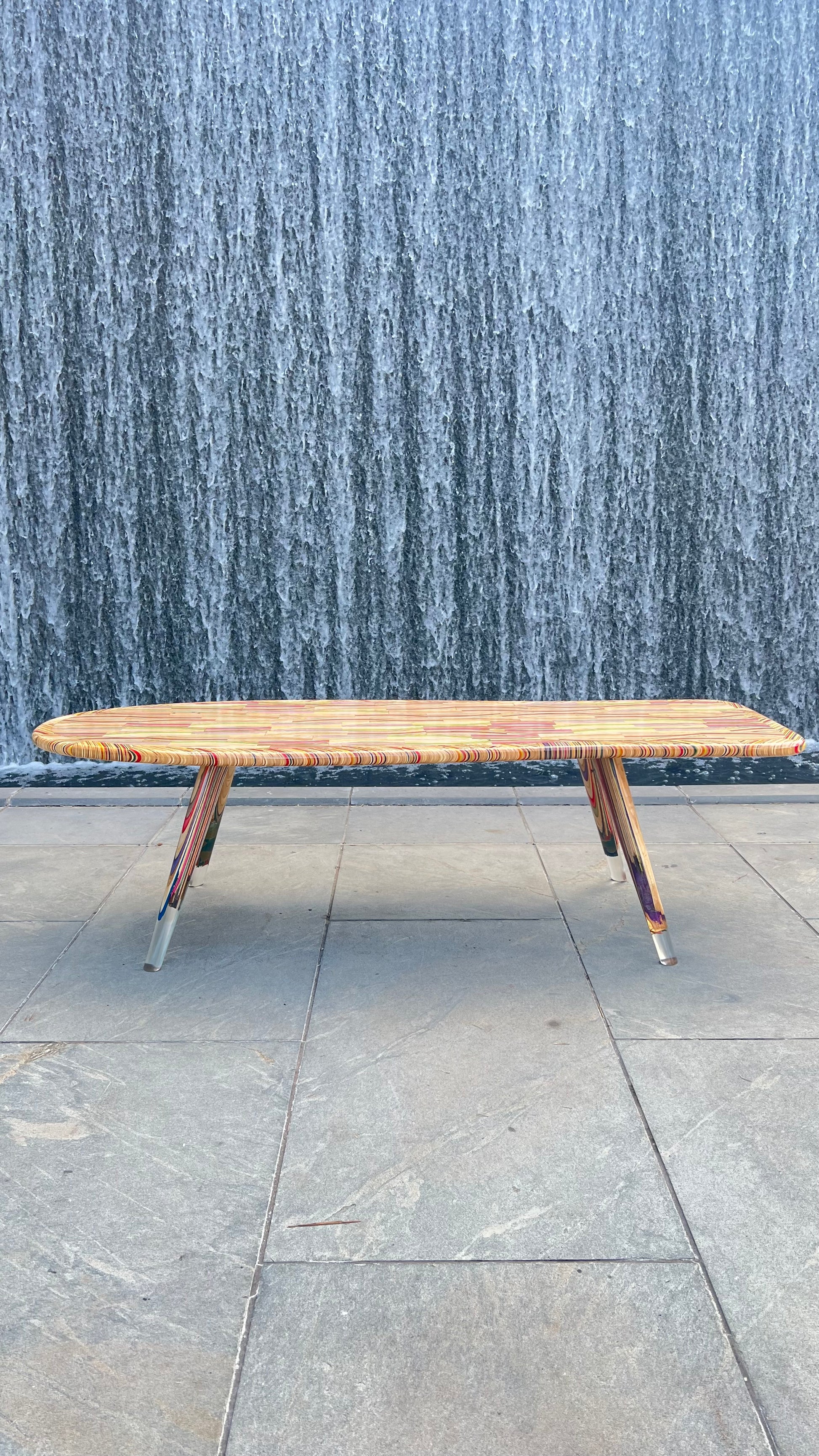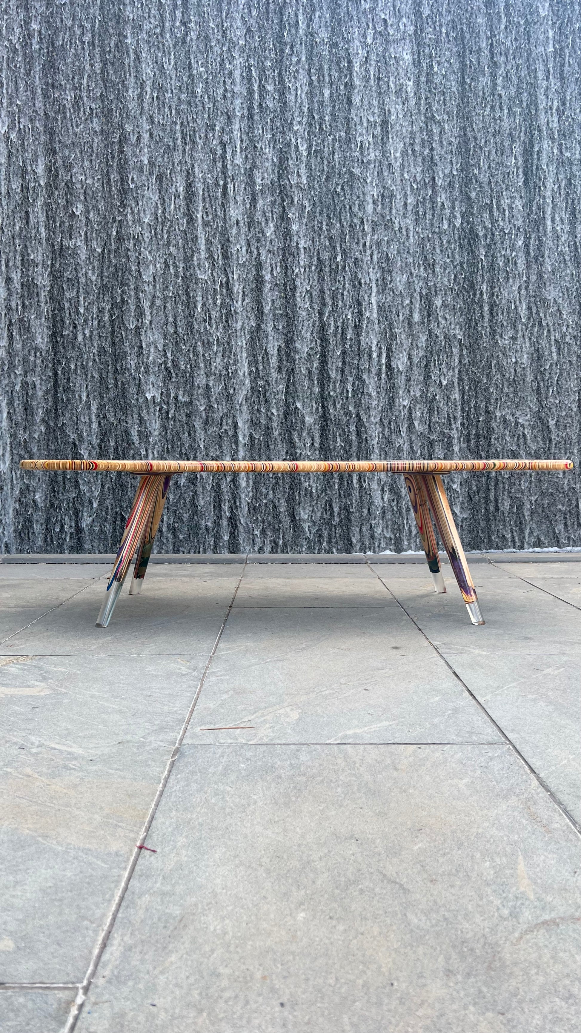 This coffee table is shaped like an old school skateboard and made from over 75 recycled skateboards and epoxy. The border is made of over 45 segments and the legs are made from broken skateboards and epoxy. ~60” x 27” x 17”