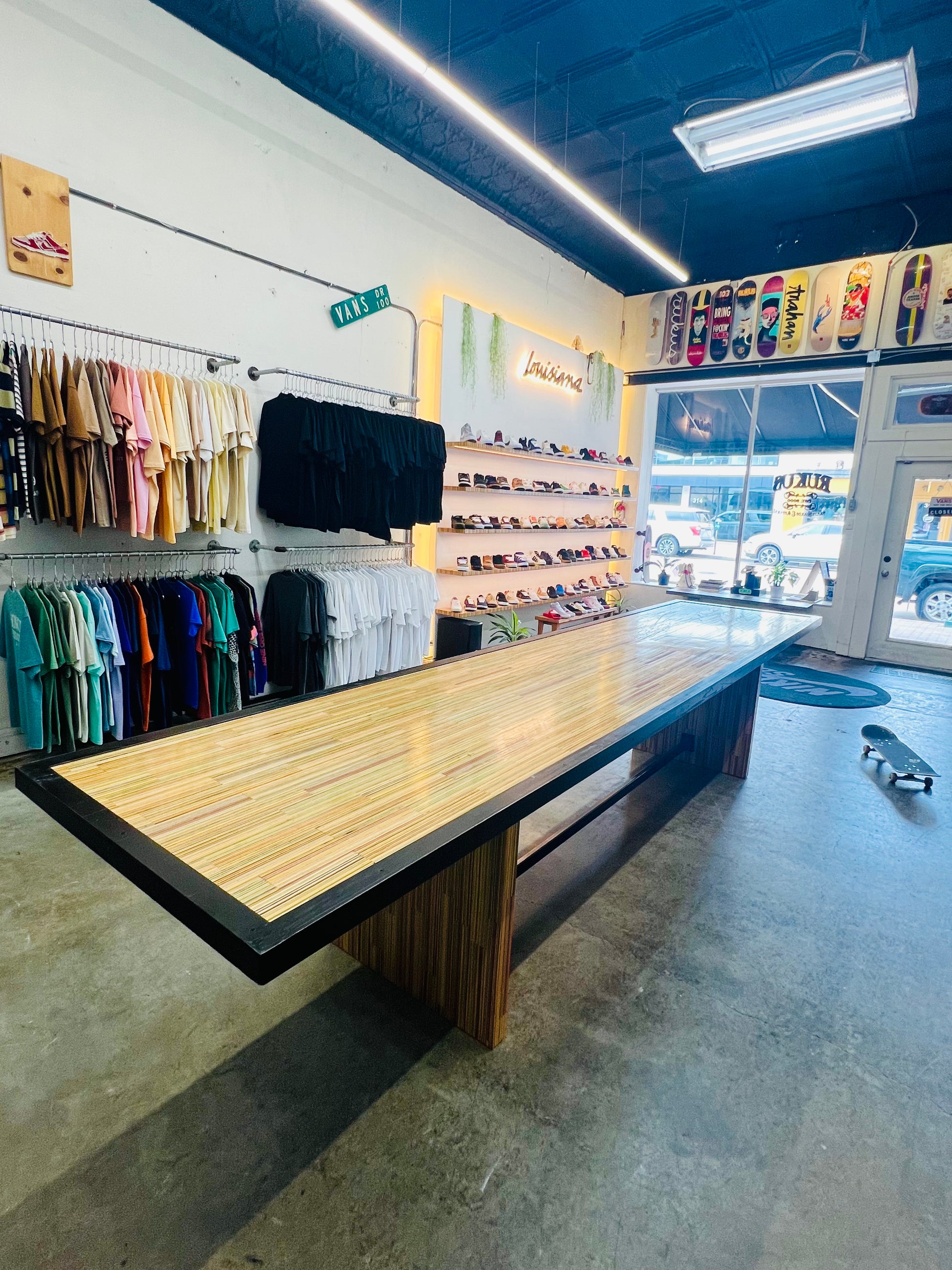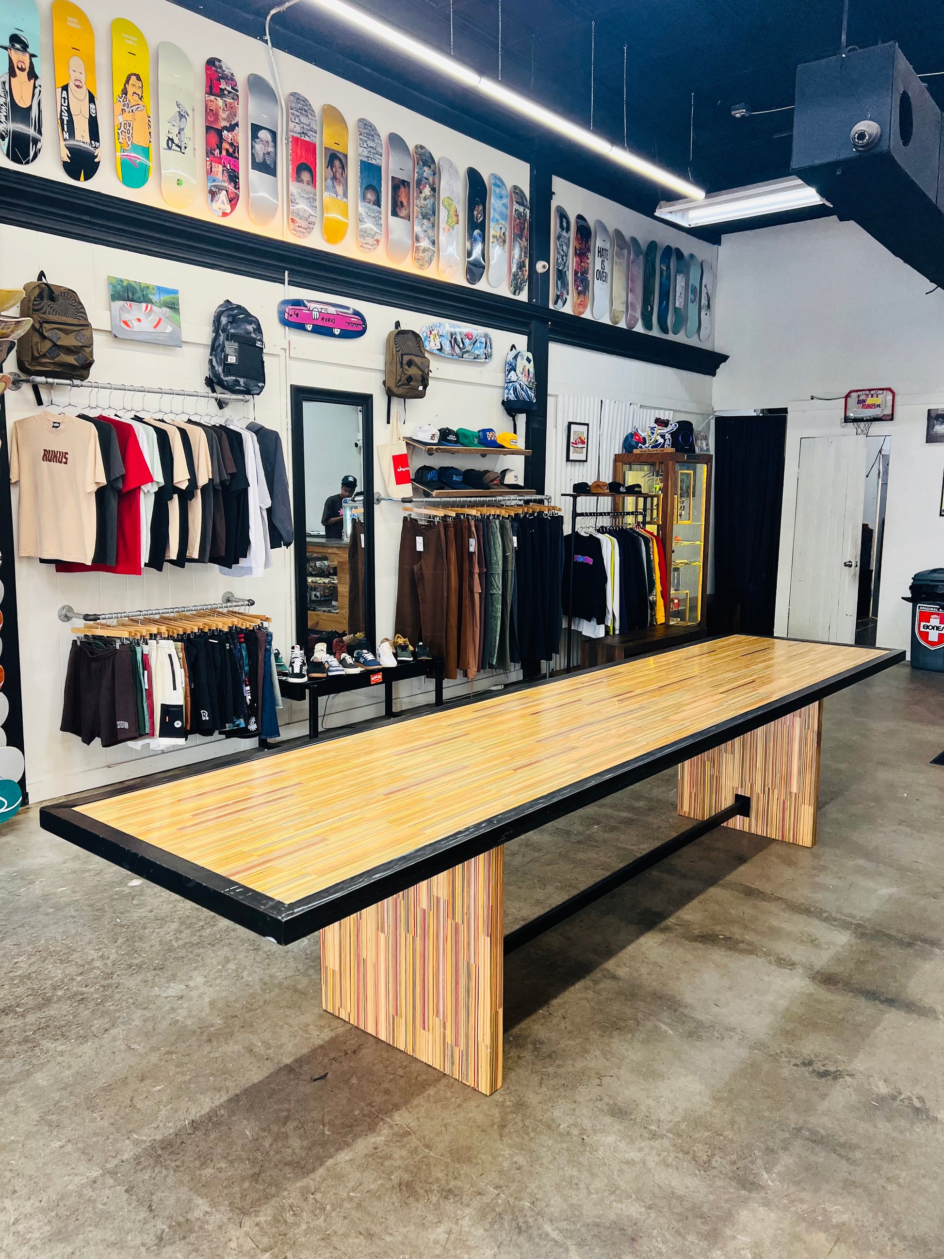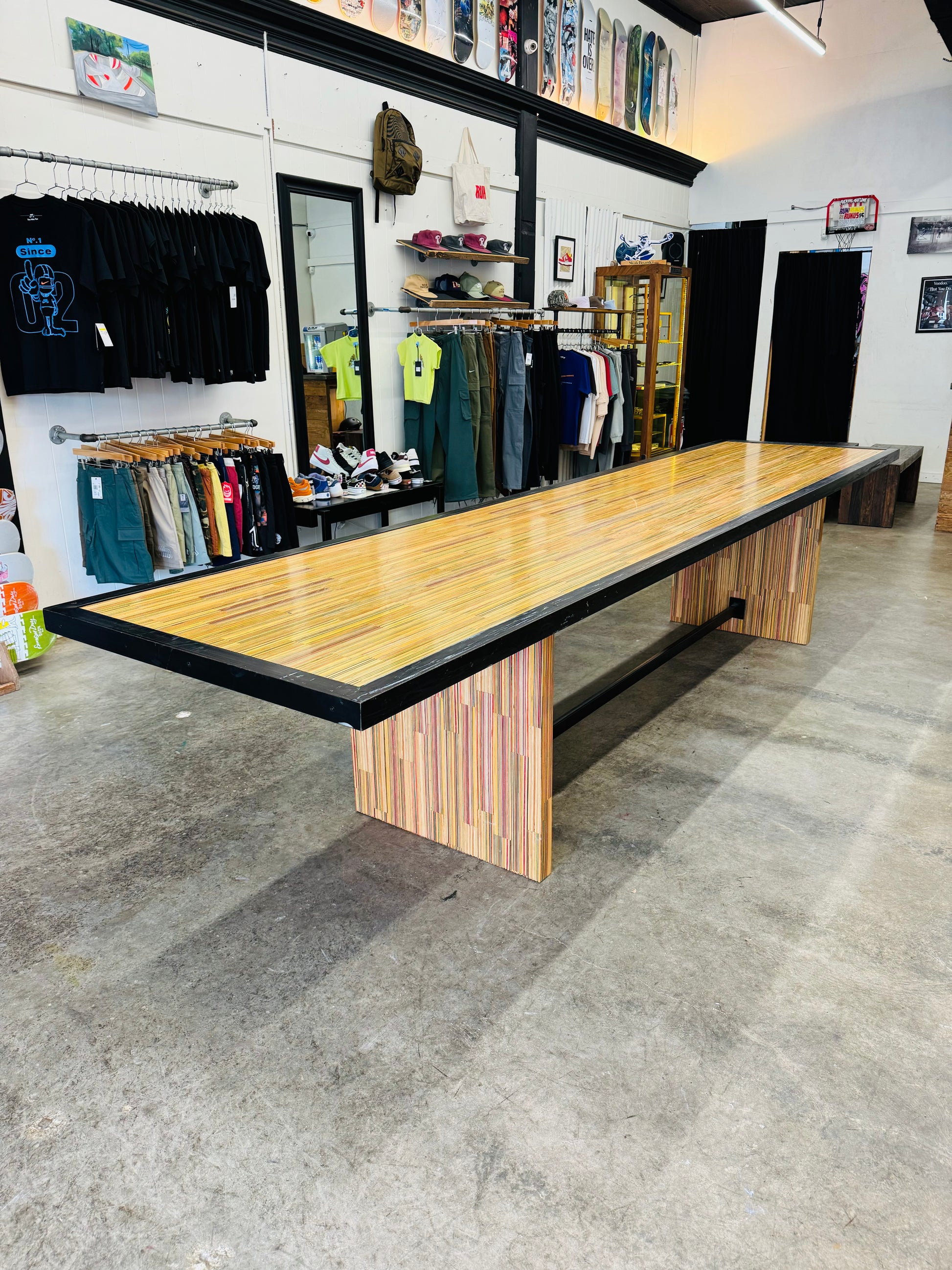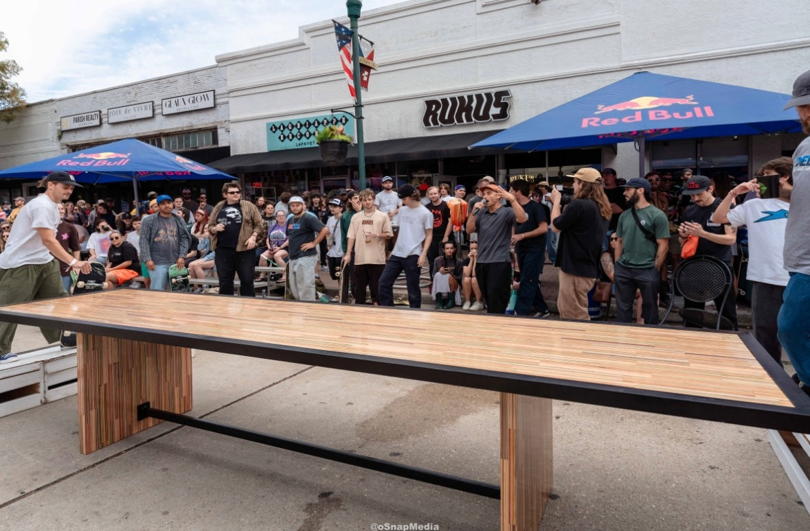 At the time of its construction this was the World’s largest dining table made from recycled skateboards. This piece measures 13.5’ long by 3’ wide and is made from over 175 recycled skateboards and blackened steel. This piece of art has one of the most special stories of any piece I have ever created. This was the center obstacle at the first ever Barousse Works Invitational which is a skate contest where we invite the Skateshops and their teams who I work with to get my recycled skateboards to come skate in the middle of my city. From local businesses and my local government to RedBull and Vans, we all worked together to shut down two city blocks in Lafayette, La to bring 21 Skateshops and over 100 professional and amateur skaters to skateboard on this very piece. At the end of the event we took every person’s signature and laser engraved them on acrylic panels and mounted them to the bottom to make this a truly one of a kind piece of art. Some of the skaters who came with our partner Skateshops actually contributed boards that were used to make this piece and then those very same skaters grinded this table. With over 100 skater’s grinding this table without it breaking, it’s safe to say it is very well built. I put my heart and soul into this piece and we displayed it in a way that made the 11 year old skateboarder in me shine. Thank you! ✨