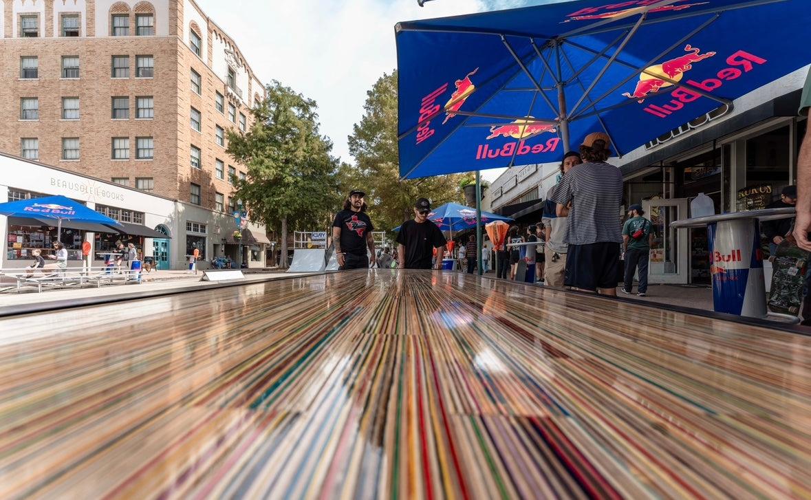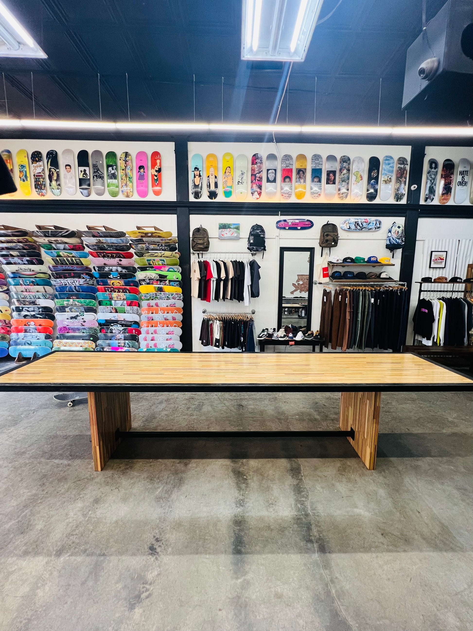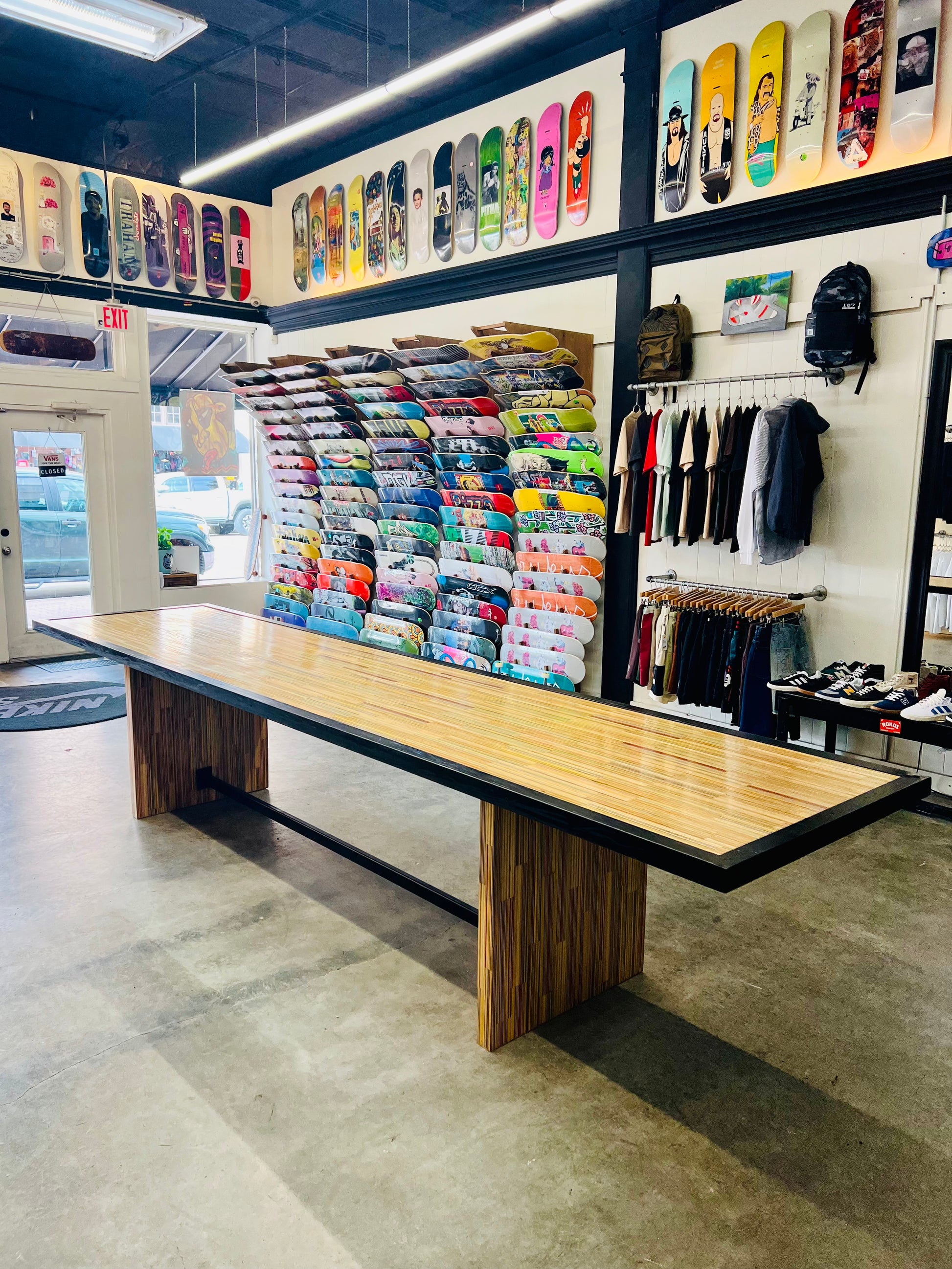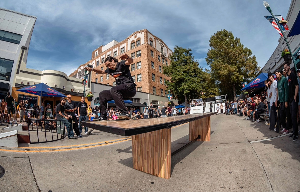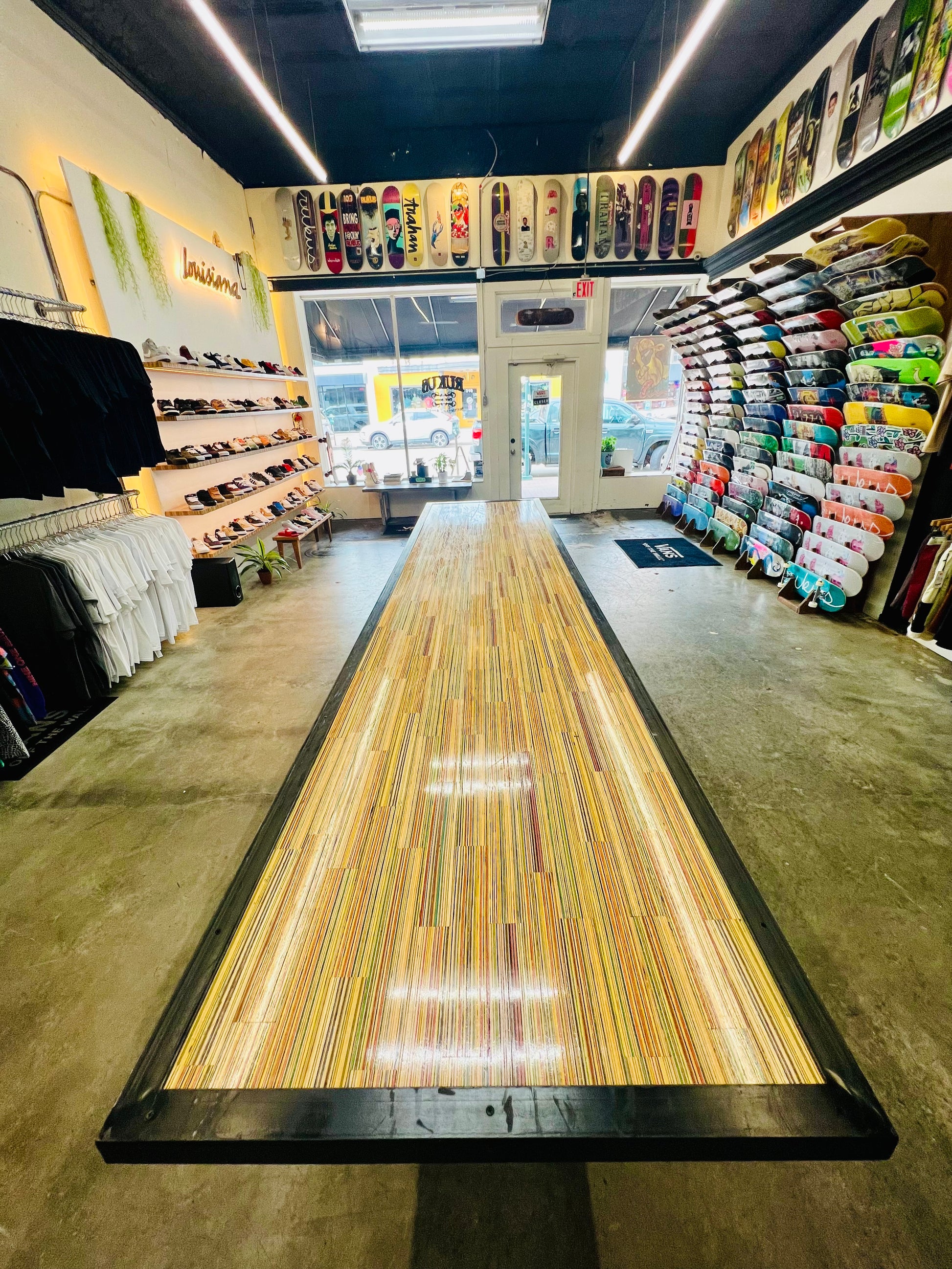 At the time of its construction this was the World’s largest dining table made from recycled skateboards. This piece measures 13.5’ long by 3’ wide and is made from over 175 recycled skateboards and blackened steel. This piece of art has one of the most special stories of any piece I have ever created. This was the center obstacle at the first ever Barousse Works Invitational which is a skate contest where we invite the Skateshops and their teams who I work with to get my recycled skateboards to come skate in the middle of my city. From local businesses and my local government to RedBull and Vans, we all worked together to shut down two city blocks in Lafayette, La to bring 21 Skateshops and over 100 professional and amateur skaters to skateboard on this very piece. At the end of the event we took every person’s signature and laser engraved them on acrylic panels and mounted them to the bottom to make this a truly one of a kind piece of art. Some of the skaters who came with our partner Skateshops actually contributed boards that were used to make this piece and then those very same skaters grinded this table. With over 100 skater’s grinding this table without it breaking, it’s safe to say it is very well built. I put my heart and soul into this piece and we displayed it in a way that made the 11 year old skateboarder in me shine. Thank you! ✨